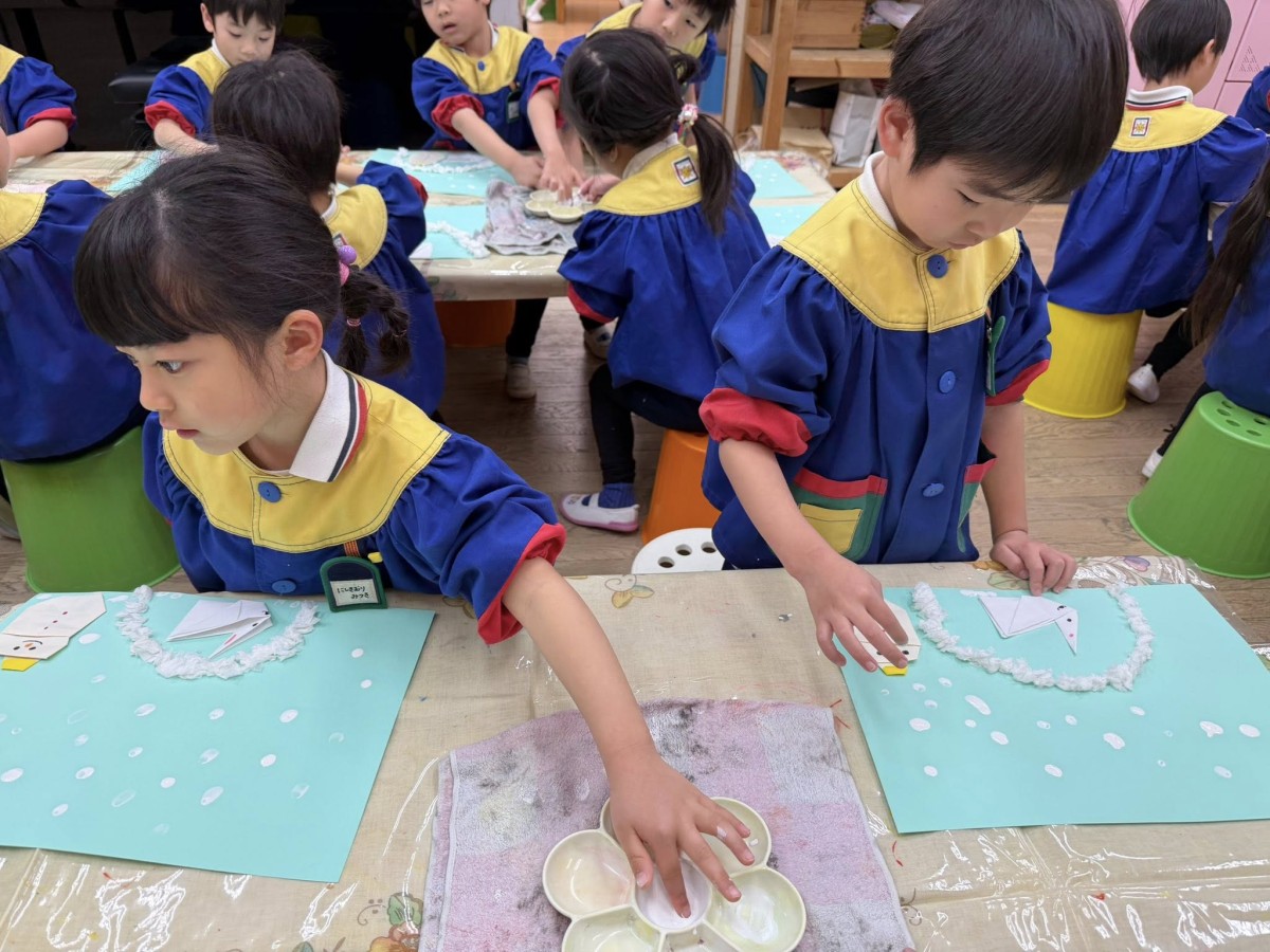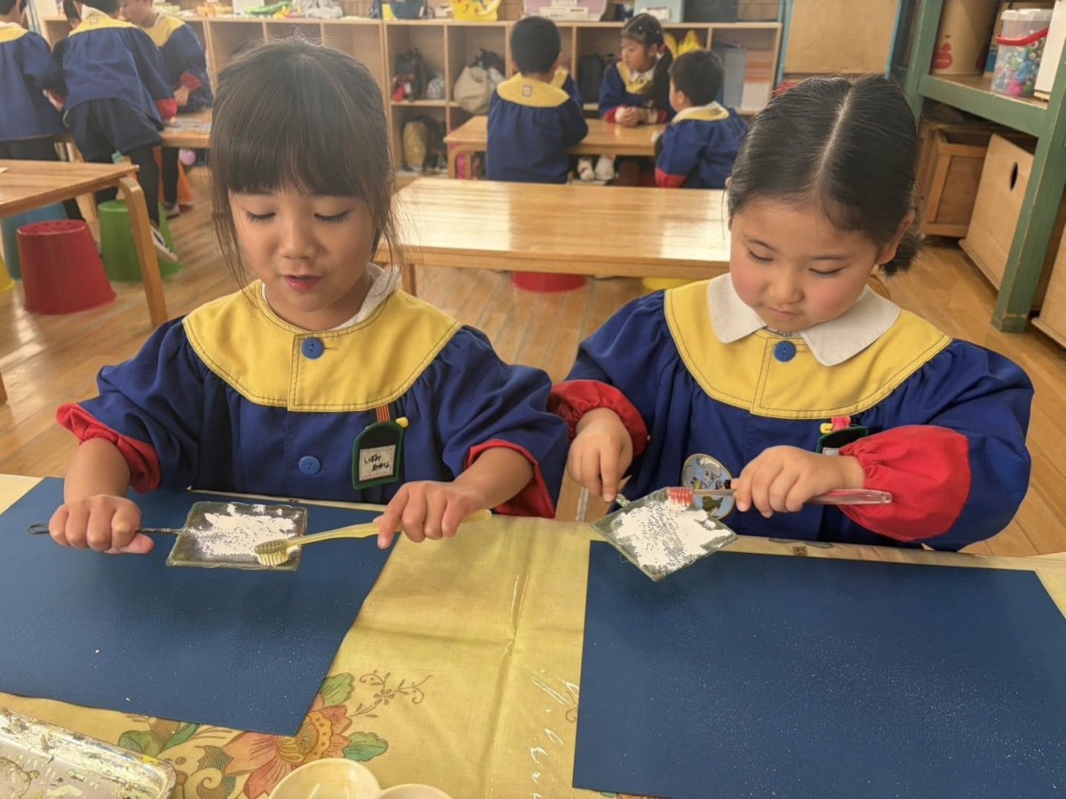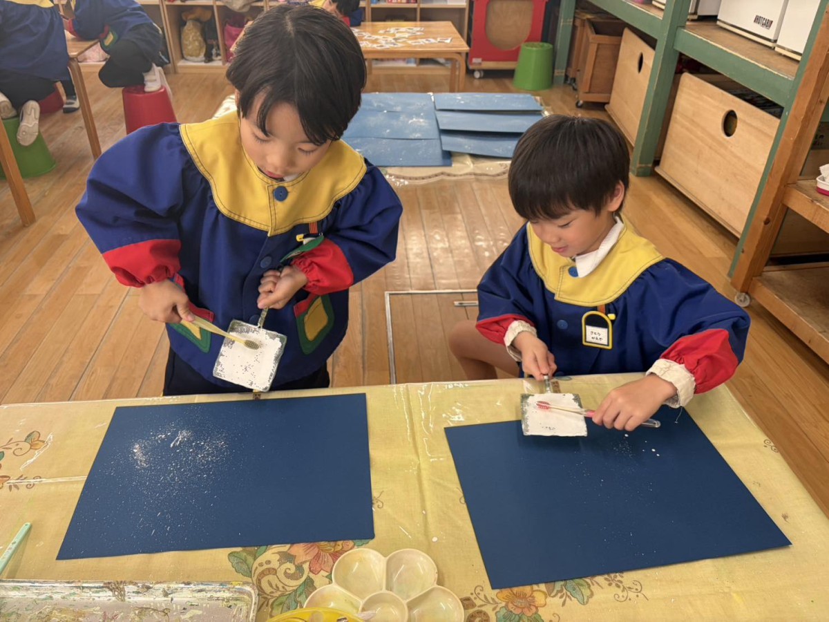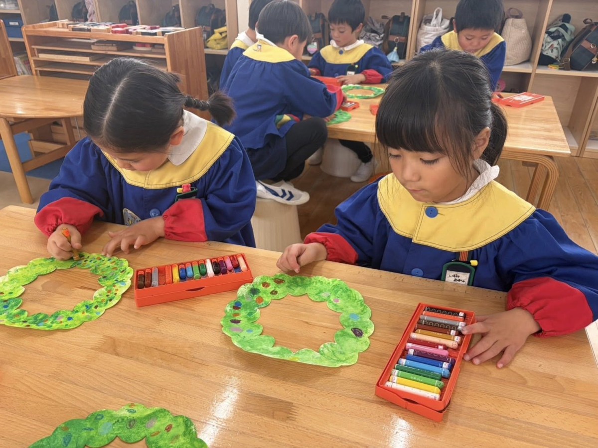午前中は園庭で遊びました。お砂場でとっても大きなお山を作って見せてくれました。午後は、制作の続きをしました。スパッタリングで雪を表現し、リースには模様をつけました。可愛らしい作品ができそうです♪