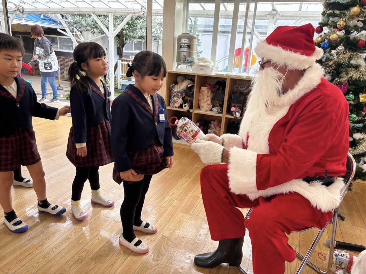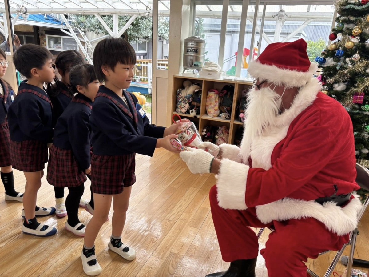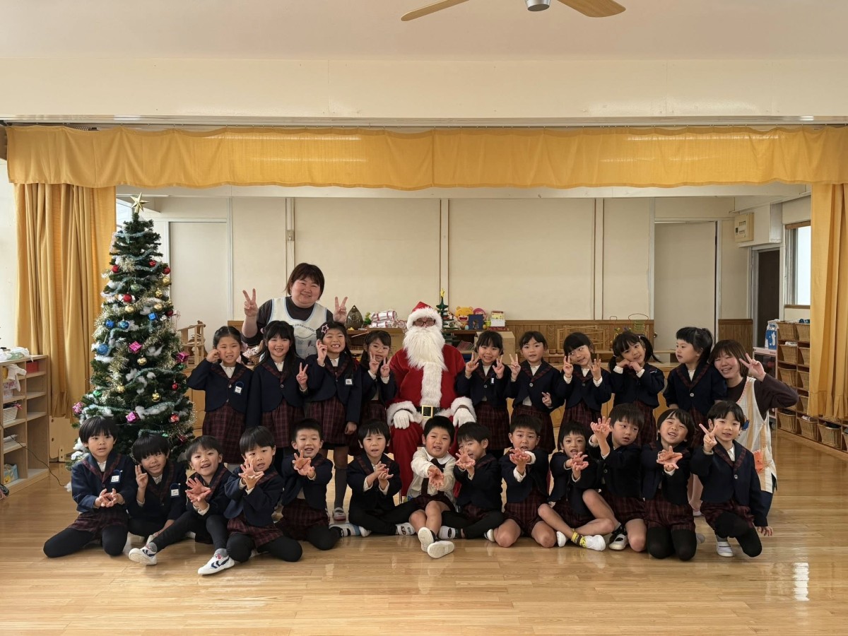 今日は楽しみにしていたクリスマス会☆朝からサンタさんの話で盛り上がっていました。クリスマス会の前に、もも組さんきい組さんとゲームをしました。クリスマス会が始まり、サンタさんが保育園にきてくれてとっても嬉しそうでした。プレゼントをもらい、英語でお礼をいうことができました。午後はクッキング!楽しいことがたくさんの1日でした。