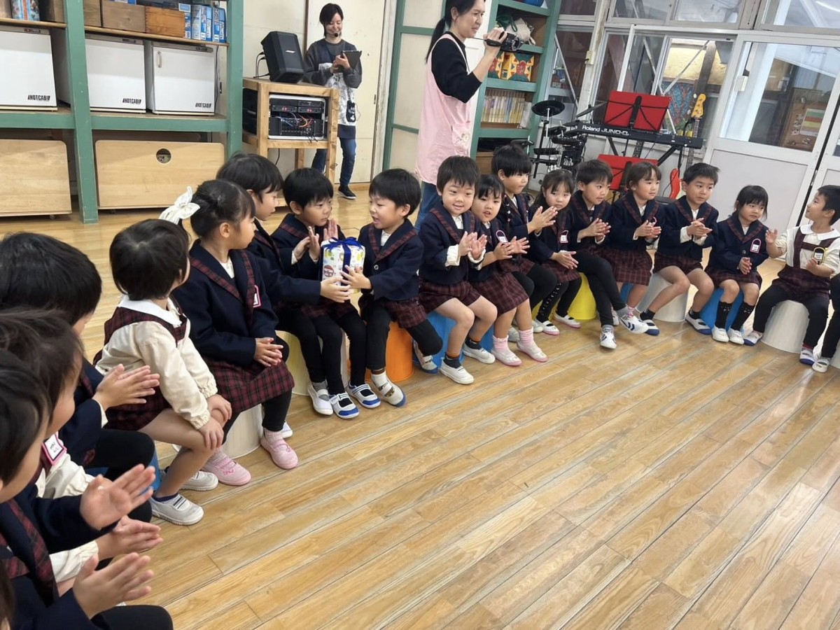 午前中は、園庭でたっぷりと遊ぶことができ嬉しそうなあお組さん。午後は、バンドに合わせて歌を歌いました。歌詞カードを見なくても歌うことができました。他のクラスの発表も静かに見ることができました。