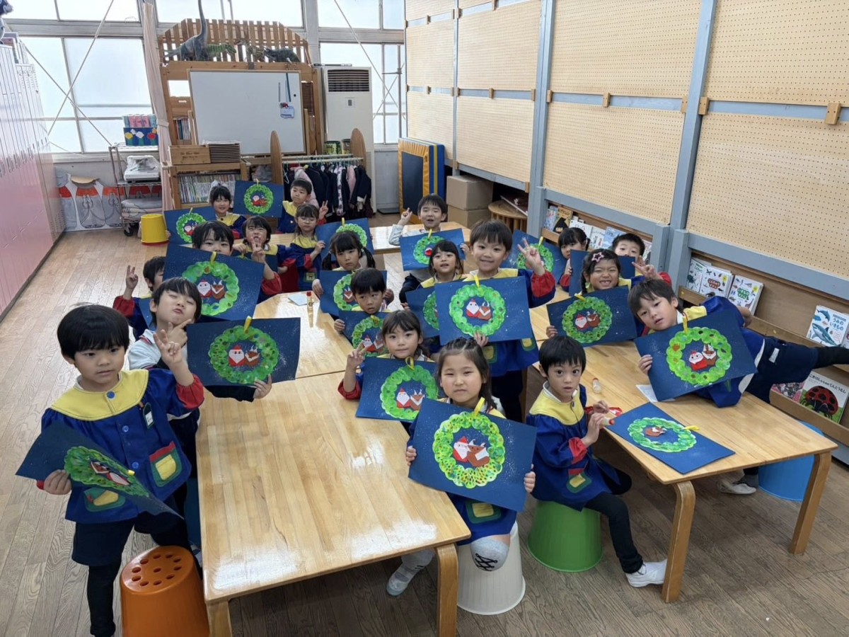 午前中は制作をしたり粘土をしたりしました。スパッタリングで雪を表現しました。かわいいリースができましたね♪午後は園庭で遊びました。1年間ありがとうございました。来年も元気なみんなに会えるのを楽しみにしています。良いお年をお迎えください♪
