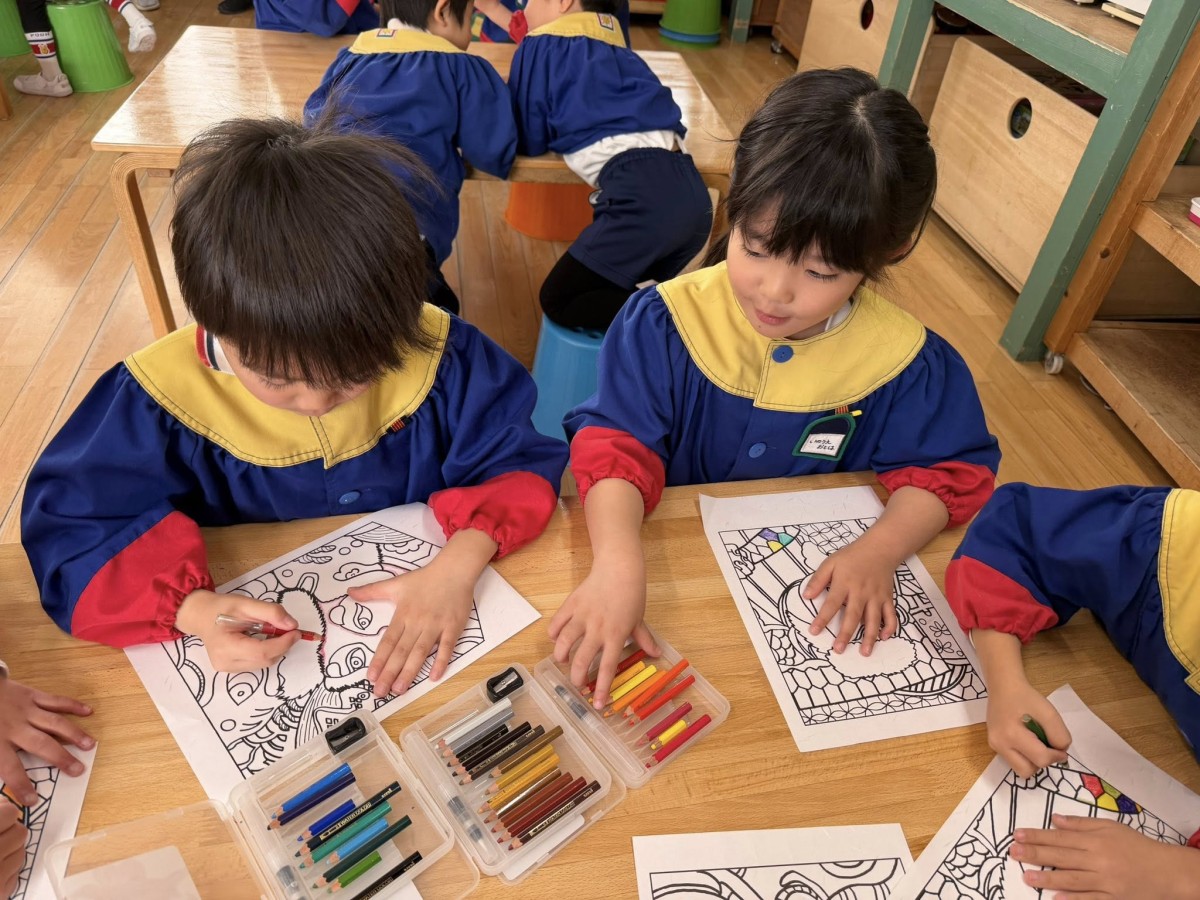 今日は、凧の色付けをしました。水彩色鉛筆を使い塗り進めていきました。驚くほどの集中力で黙々と進めているのが印象的でした。はみ出さないように丁寧に塗ることができました。午後は、園庭で遊んだ後、粘土で遊びました。