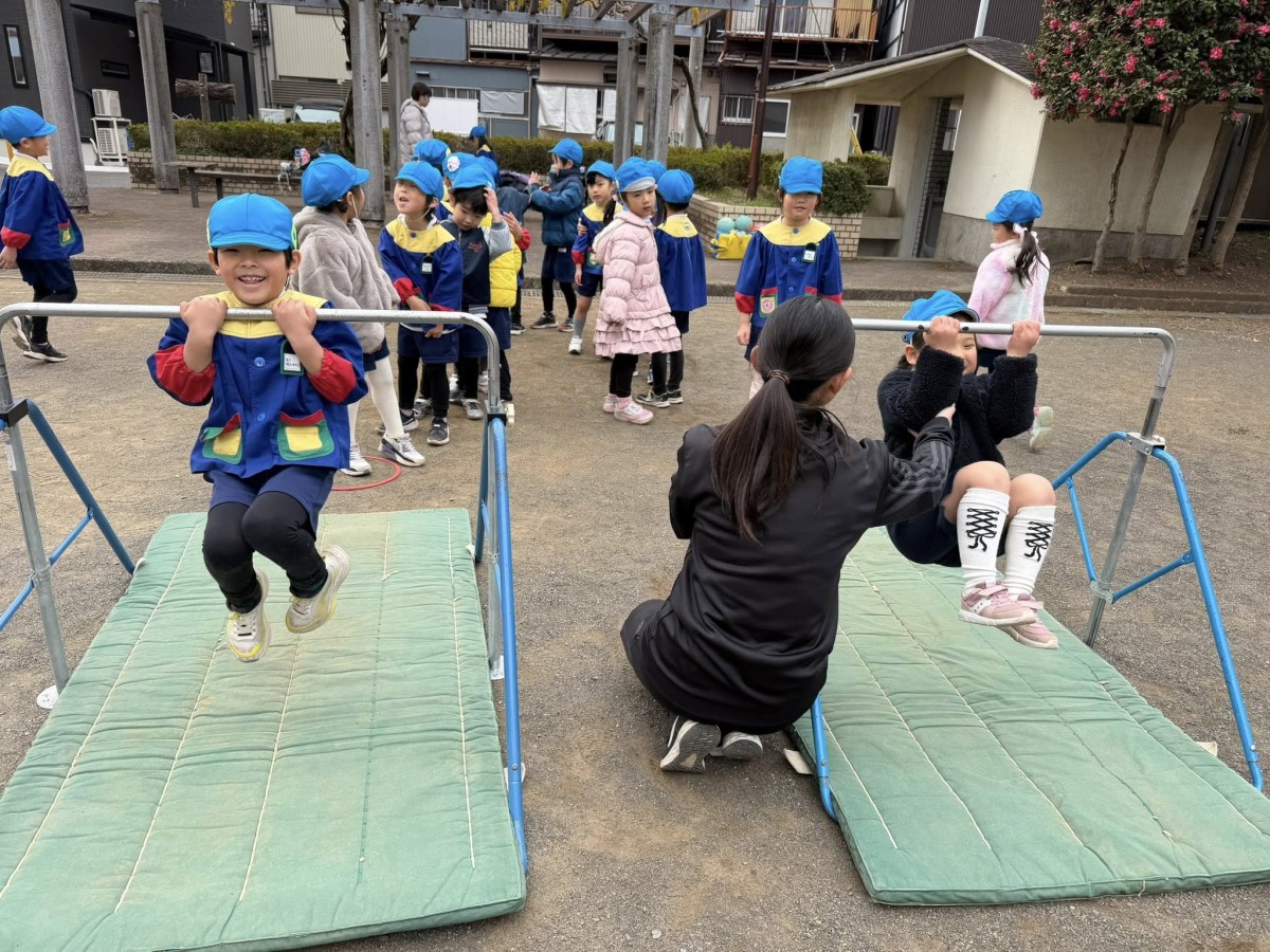 午前中は体育遊びがありました。鉄棒では、前周りや逆上がりに挑戦しました。できるようになりたい!という気持ちが伝わってきて、一生懸命取り組んでいる姿に感動しました。午後はお遊戯の練習をしました。立ち位置やフォーメーションの練習をしました。