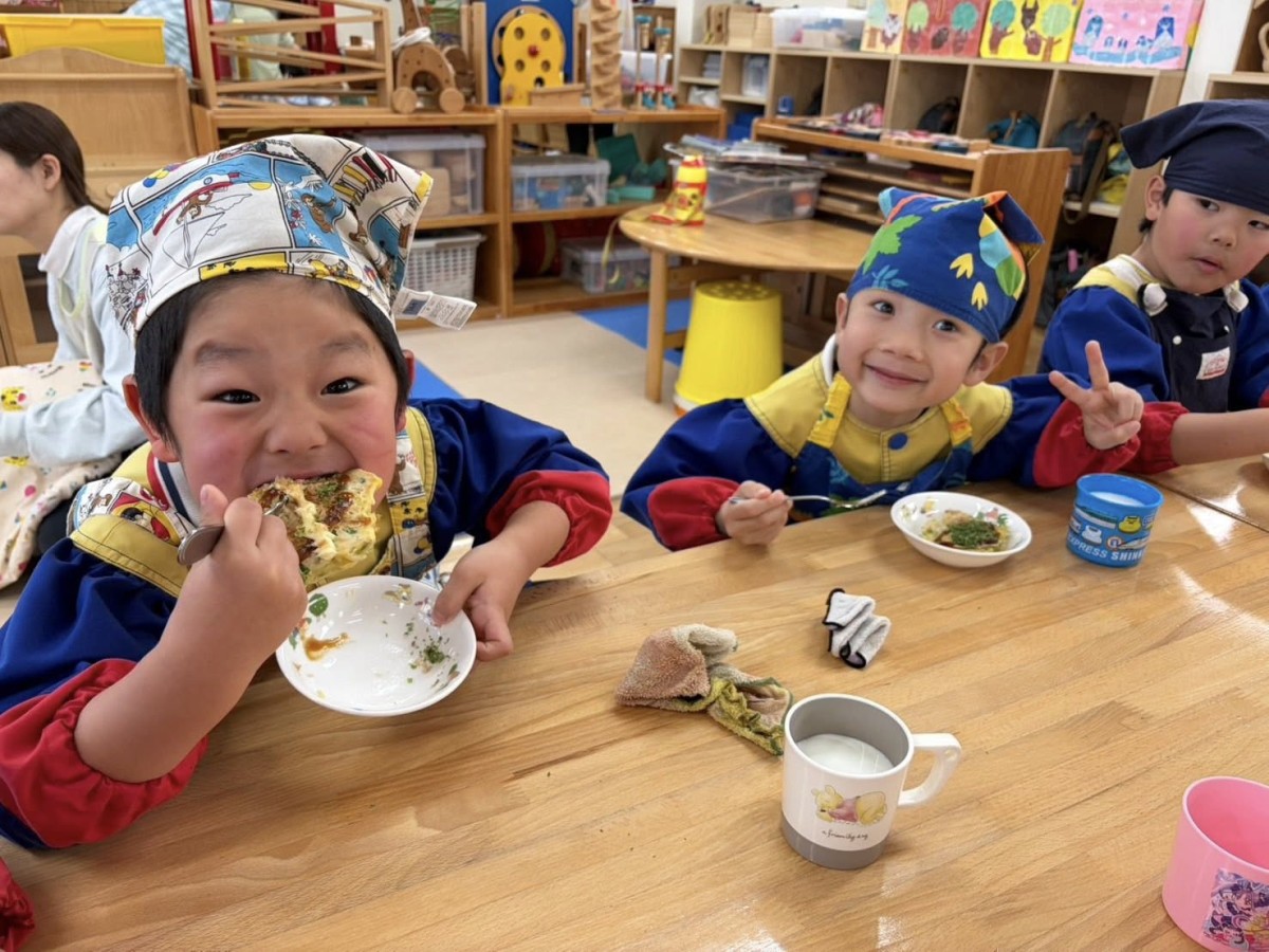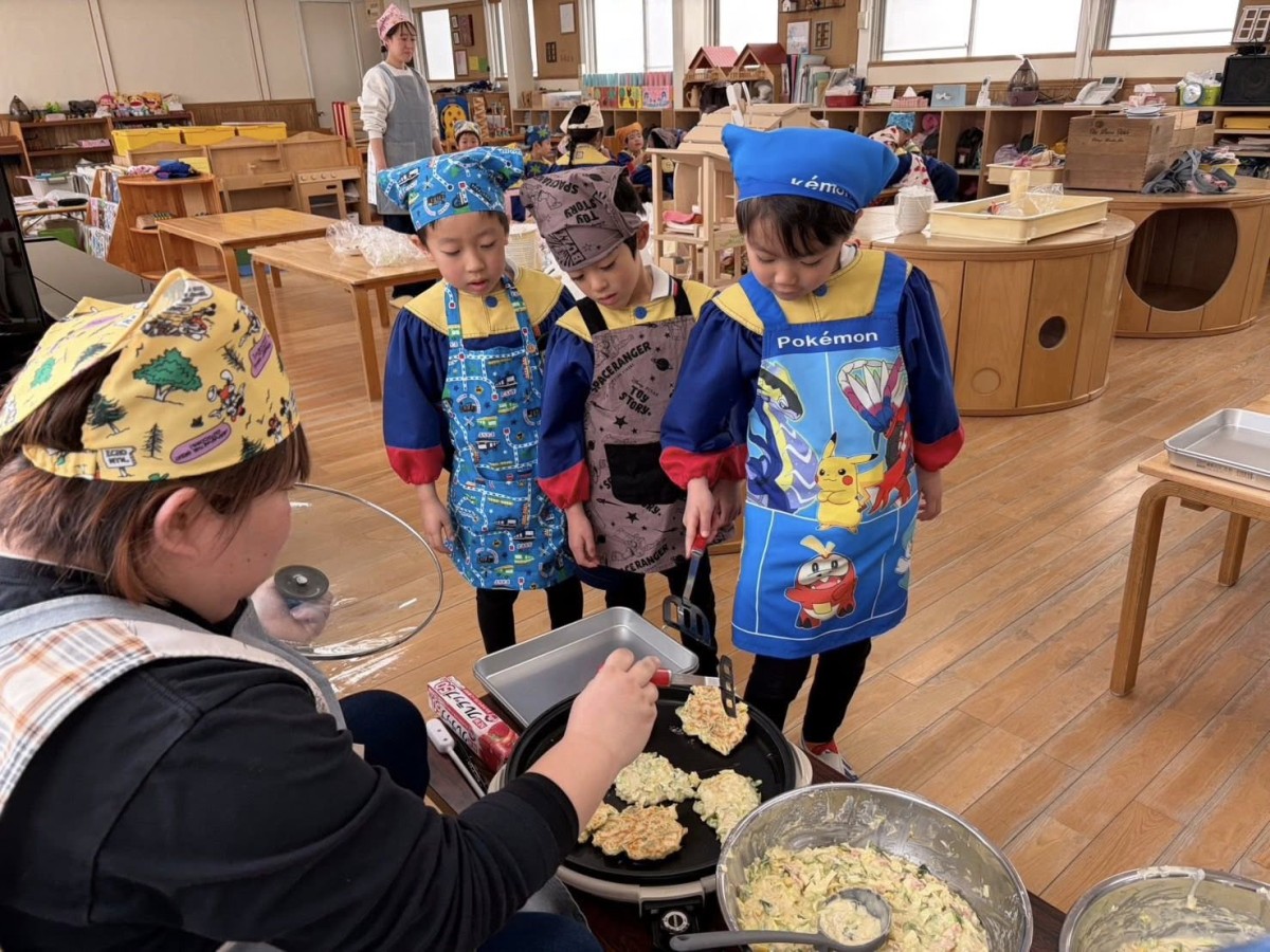 午前中は体育遊びがありました。今回は鉄棒と縄跳びをしました。逆上がりが出来るように、何度も何度も練習していました。午後はクッキング!お好み焼きを作りました。卵を割るのが上手になってきました。自分たちで作ったお好み焼き、とても美味しそうに食べていました。