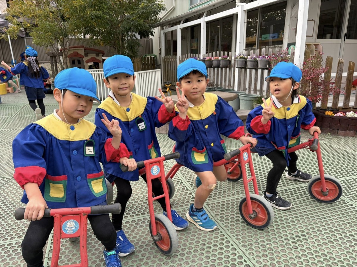 午前中は発表会の練習を頑張りました。小道具も使うことに慣れてきました。午後は、勤労感謝訪問に出かけました。あお組さんは平和消防署まで歩いて行きました。初めて通る道にワクワクしているあお組さん。「自分のお家の近くだよー」と教えてくれたり、「ここ来たことある!」とお話ししたり盛り上がっていました。残念ながら消防士さんに会うことはできませんでしたが、消防車と写真を撮り、帰りは河川敷で遊んで帰ることが出来ました。久々の河川敷。たくさん走ったり、遊具で遊んだりとーっても楽しそうでした☆