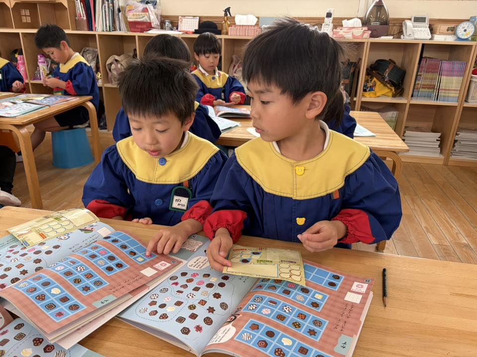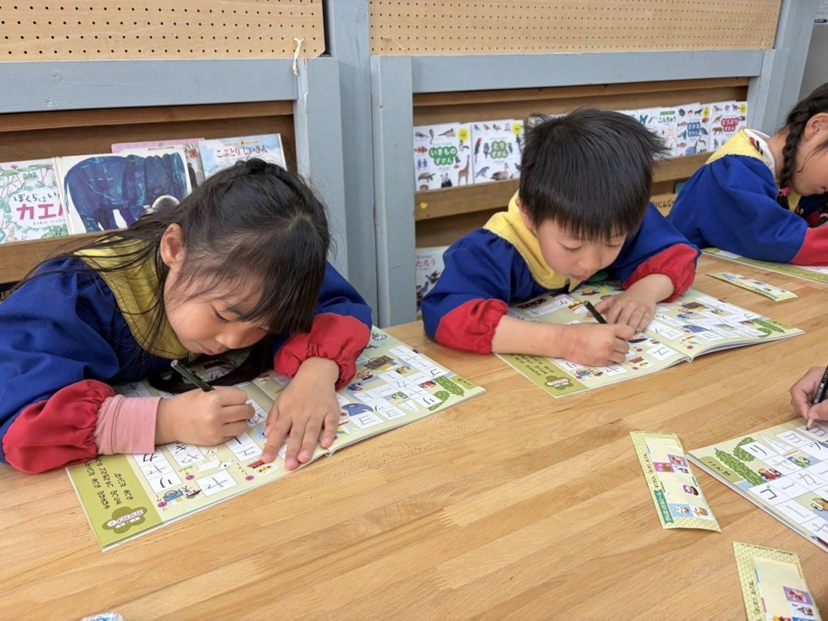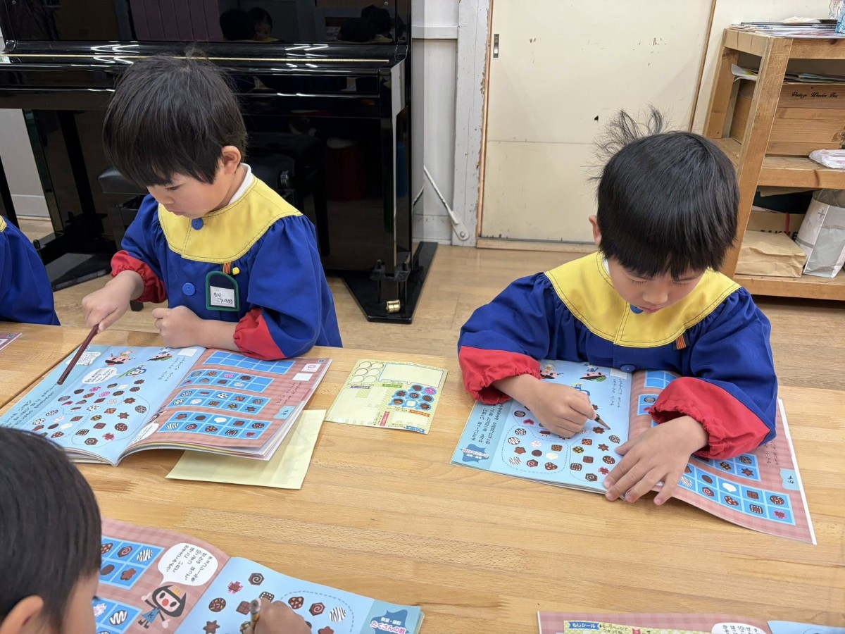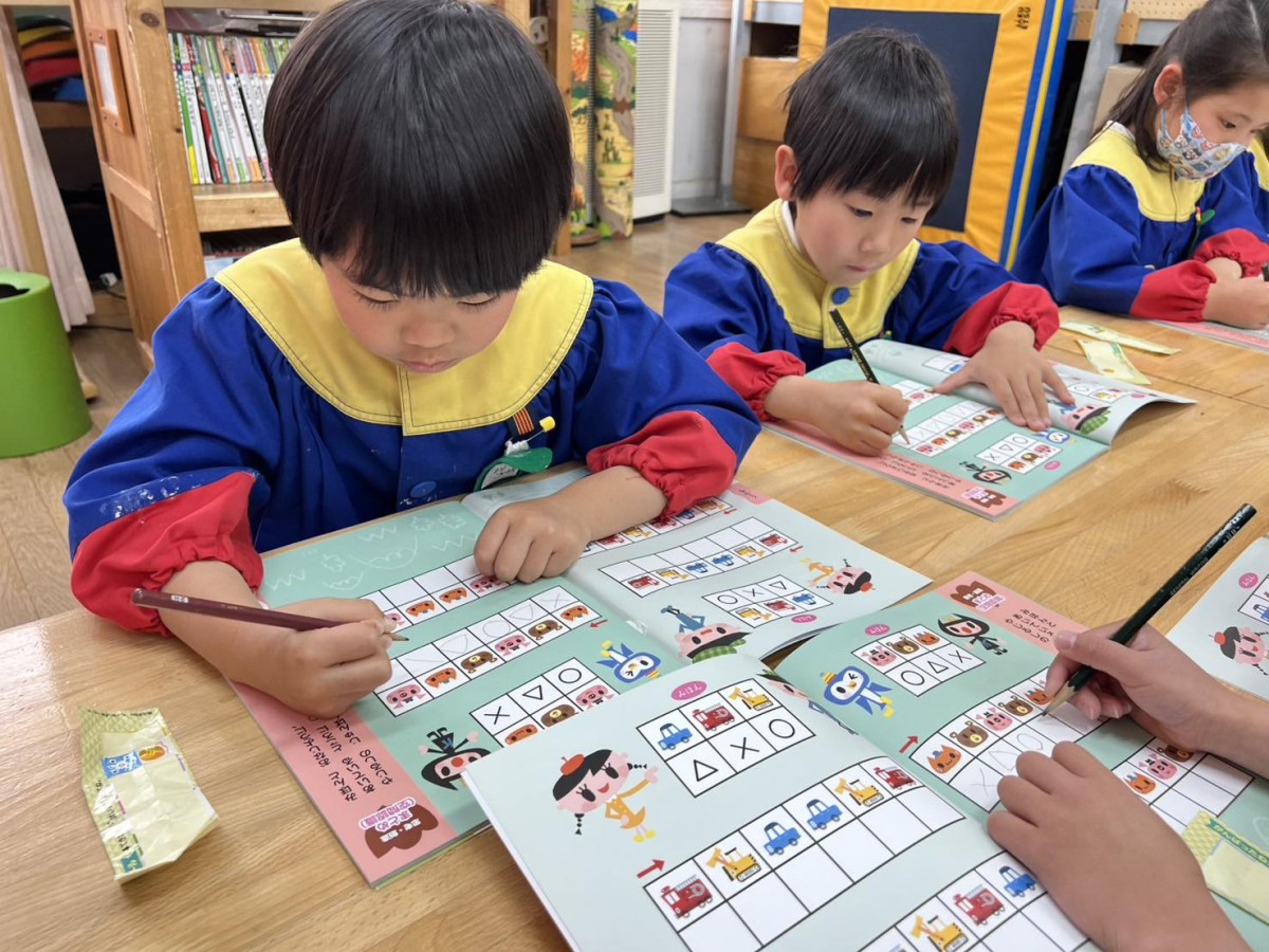 午前中は英語がありました。数を数えたり、好きな物を英語で言ったりしました。たくさんの数を英語で数えることができるようになりました。午後は園庭で遊んだ後、まなびきっずをしました。お話をしっかりと聞きながら取り組むことができました。