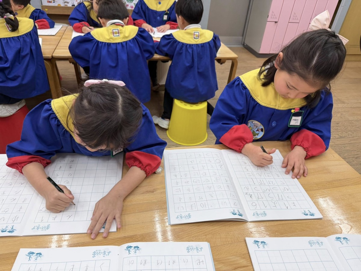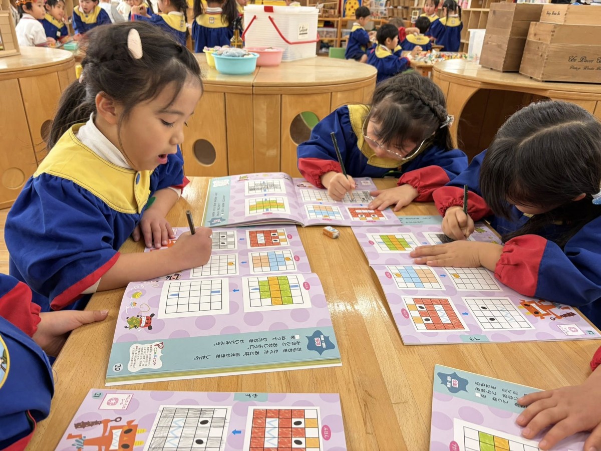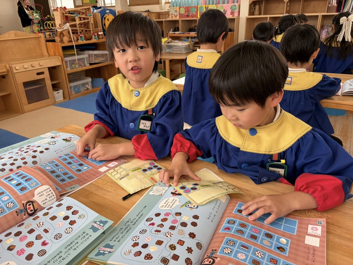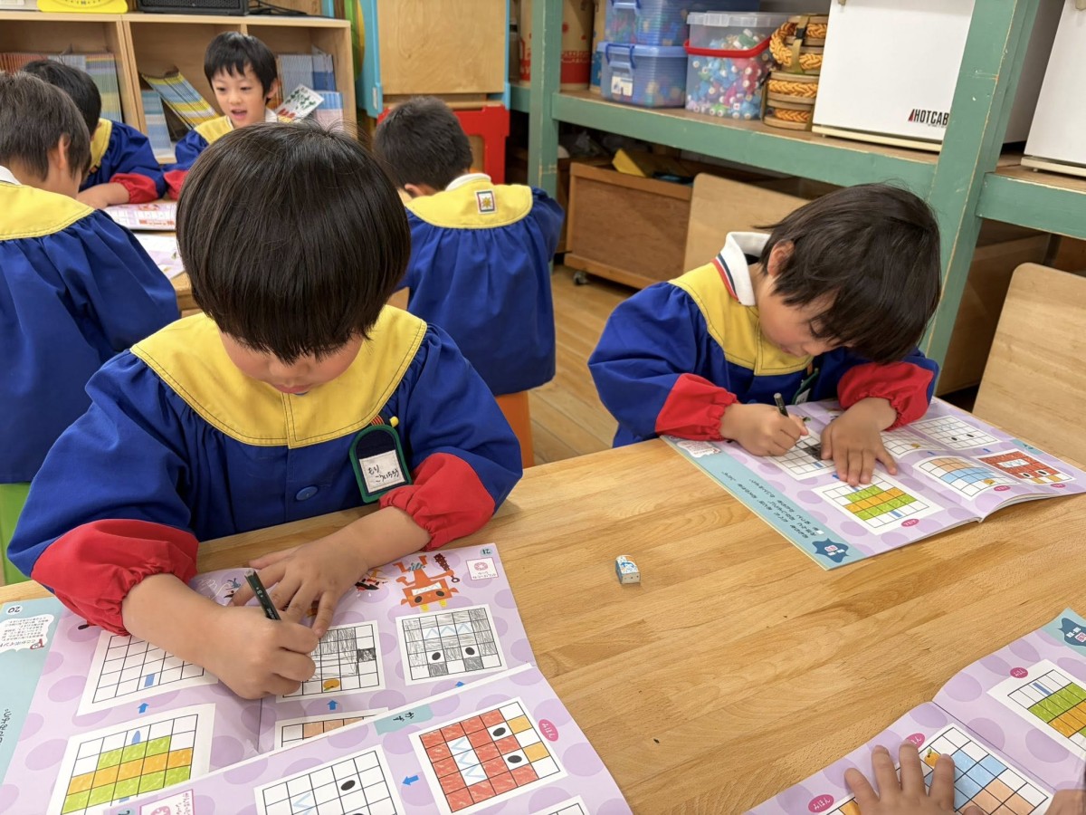 午前中は英語がありました。数を数えたり、好きな物を英語で言ったりしました。たくさんの数を英語で数えることができるようになりました。午後は園庭で遊んだ後、まなびきっずをしました。お話をしっかりと聞きながら取り組むことができました。