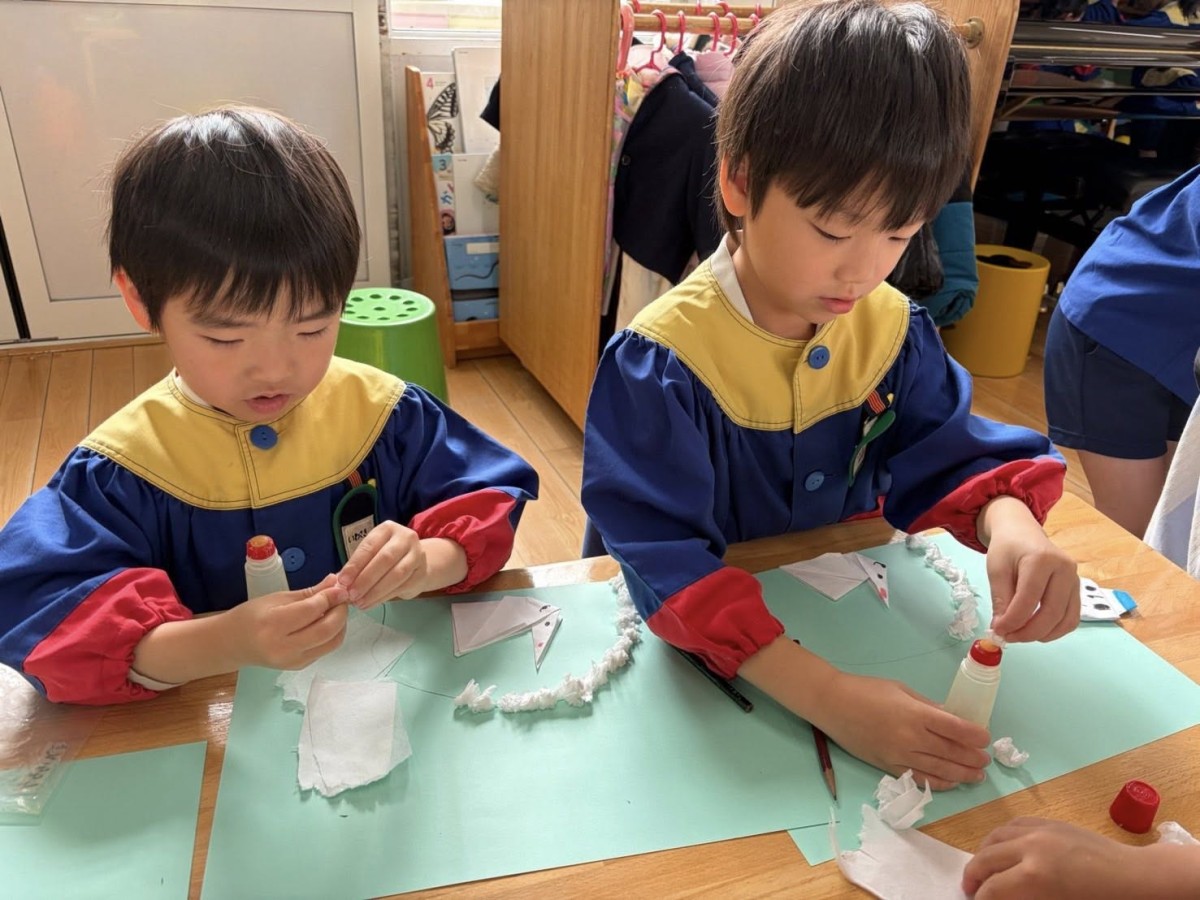 午前中は英語がありました。英語までの時間、あやとりをしました。クラスみんなが「ほうき」を作れるように練習中です。出来るお友だちが教えてあげて、出来るようになってきました。午後は園庭で遊んだ後、制作を行いました。