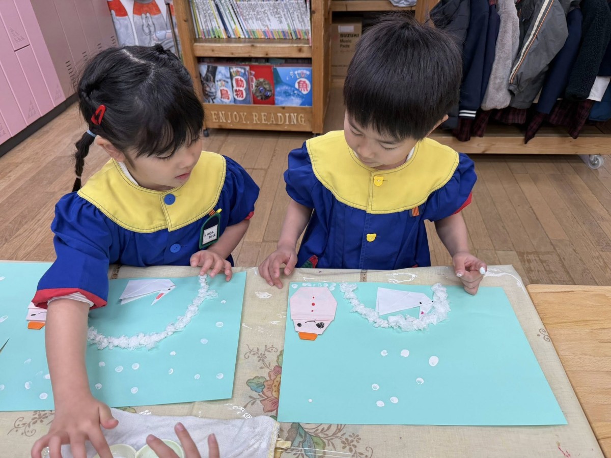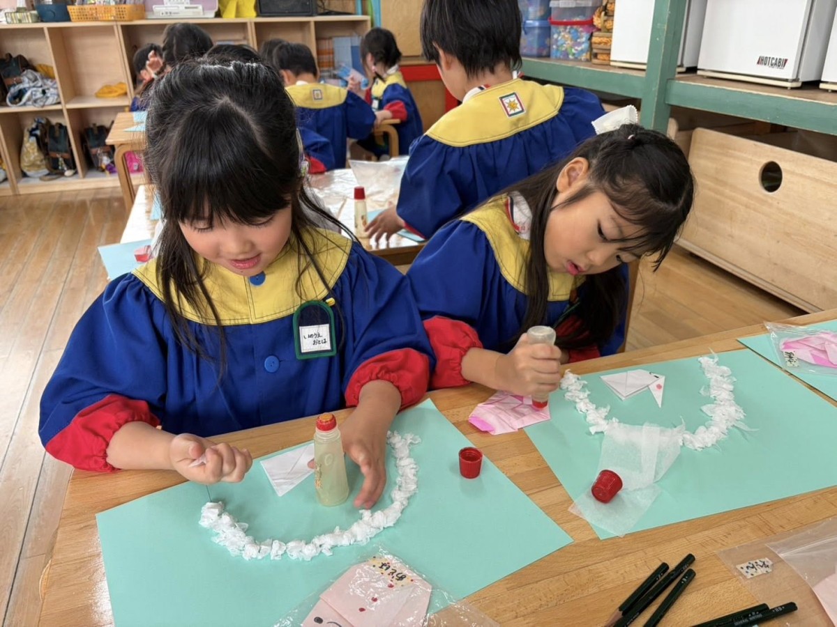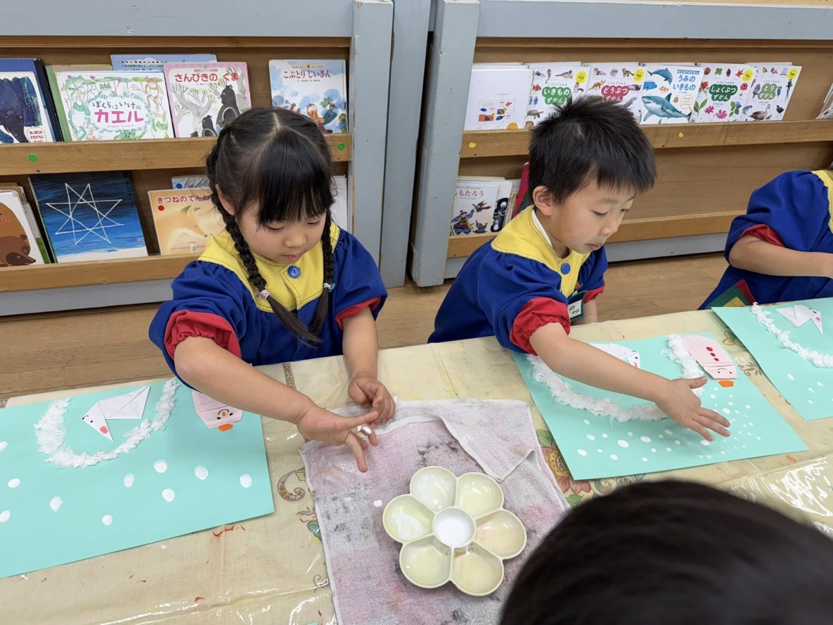 午前中は、制作をしました。以前作った雪だるまと雪うさぎにカマクラを作ってあげました。お花紙を使って作りました。可愛らしい作品ができました☆午後は園庭でたくさん遊びました。その後、まなびきっずをしました。