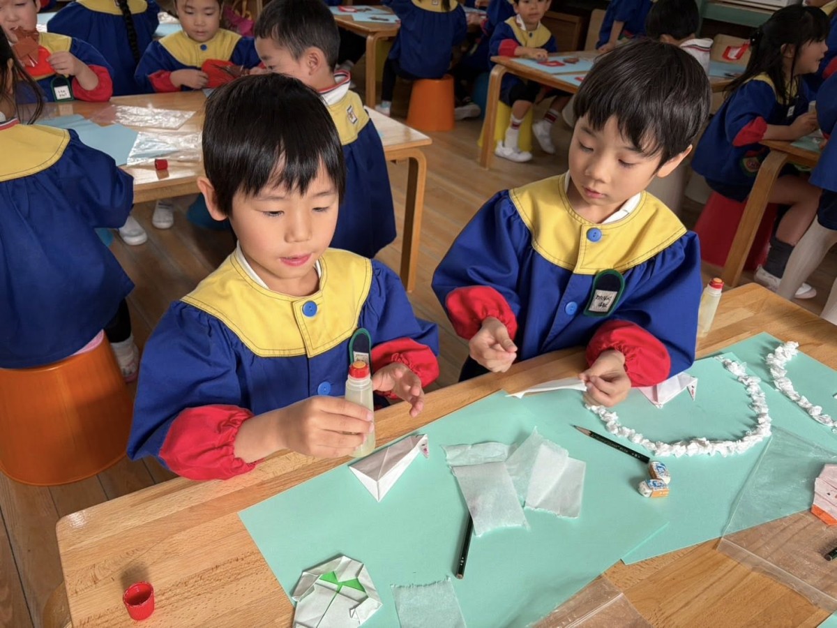 午前中は室内で折り紙やあやとり、お絵描きをしました。いろいろなものを折れるようになり、お友だちに教えてあげる様子が見られます。午後は園庭で遊んだ後、オペレッタの練習をしました。