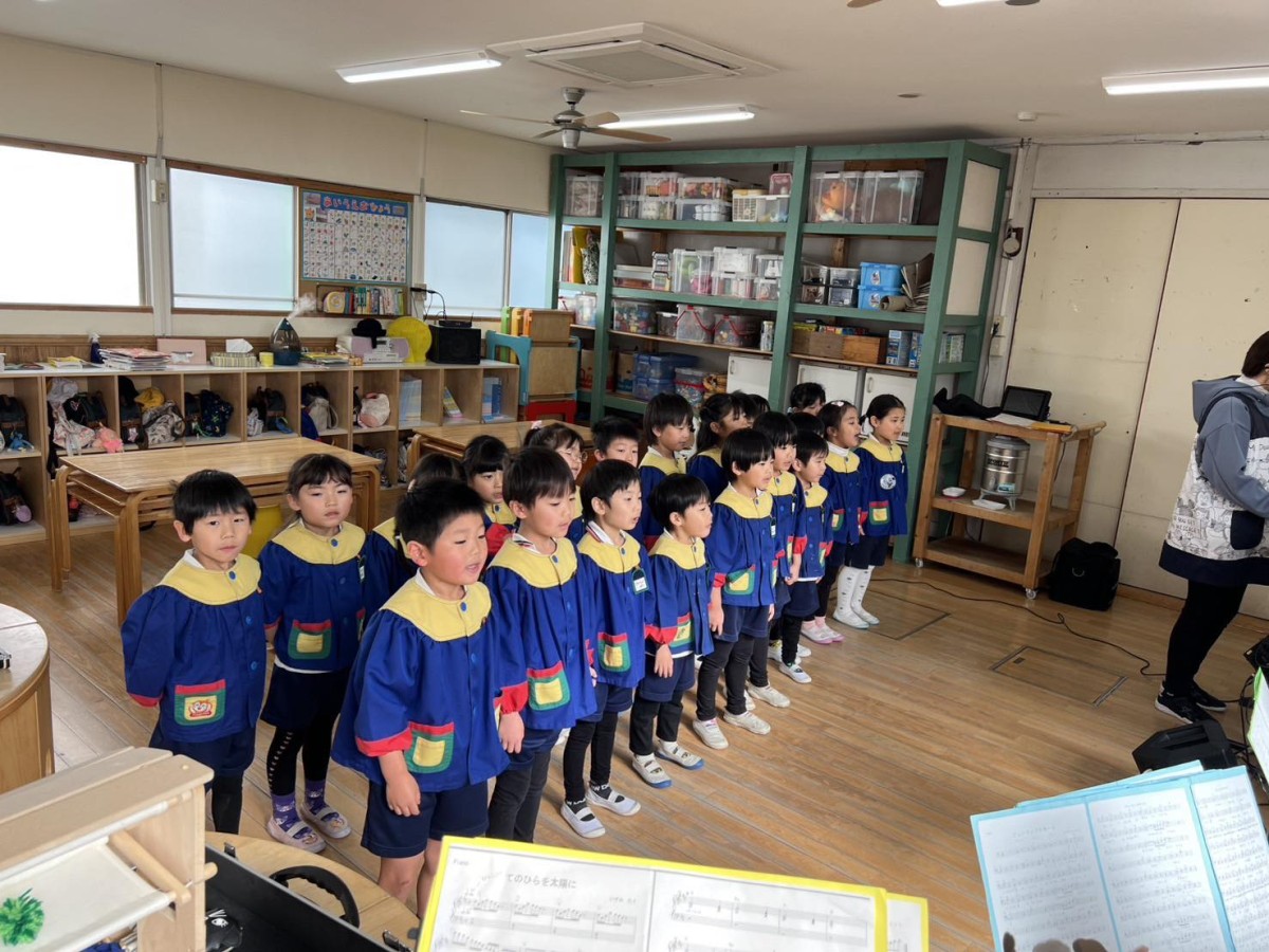 今日は、お誕生会がありました。あお組さんからは3人のお友だちが誕生日を迎えます。インタビューにも堂々と答えることが出来ました。午後は、発表会に向けて歌の練習をしました。歌詞を見ながら園長先生と植田先生の伴奏に合わせて歌いました。少しずつ覚えていきたいと思います。
