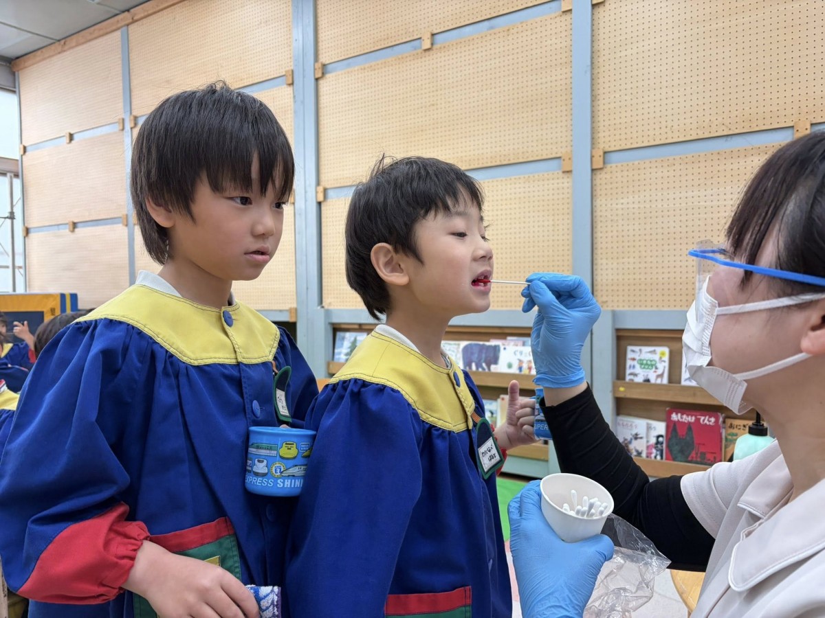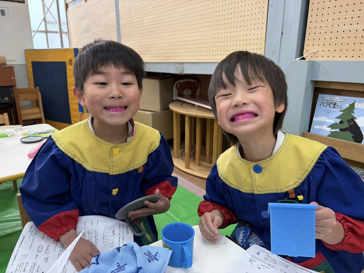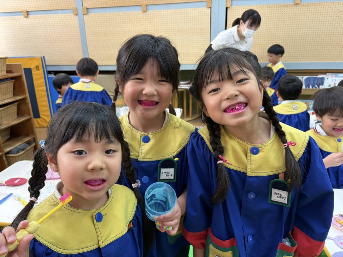 午前は歯磨き教室に参加しました。歯科衛生士さんがきてくれて、歯ブラシの持ち方や6歳臼歯のお話しをしてくれました。真剣にお話しを聞いていたあお組さん。薬を塗ってもらい、どのくらい歯に汚れがついているかお友だちとみて確認していました。午後は園庭で遊んでからお遊戯の練習をしました。