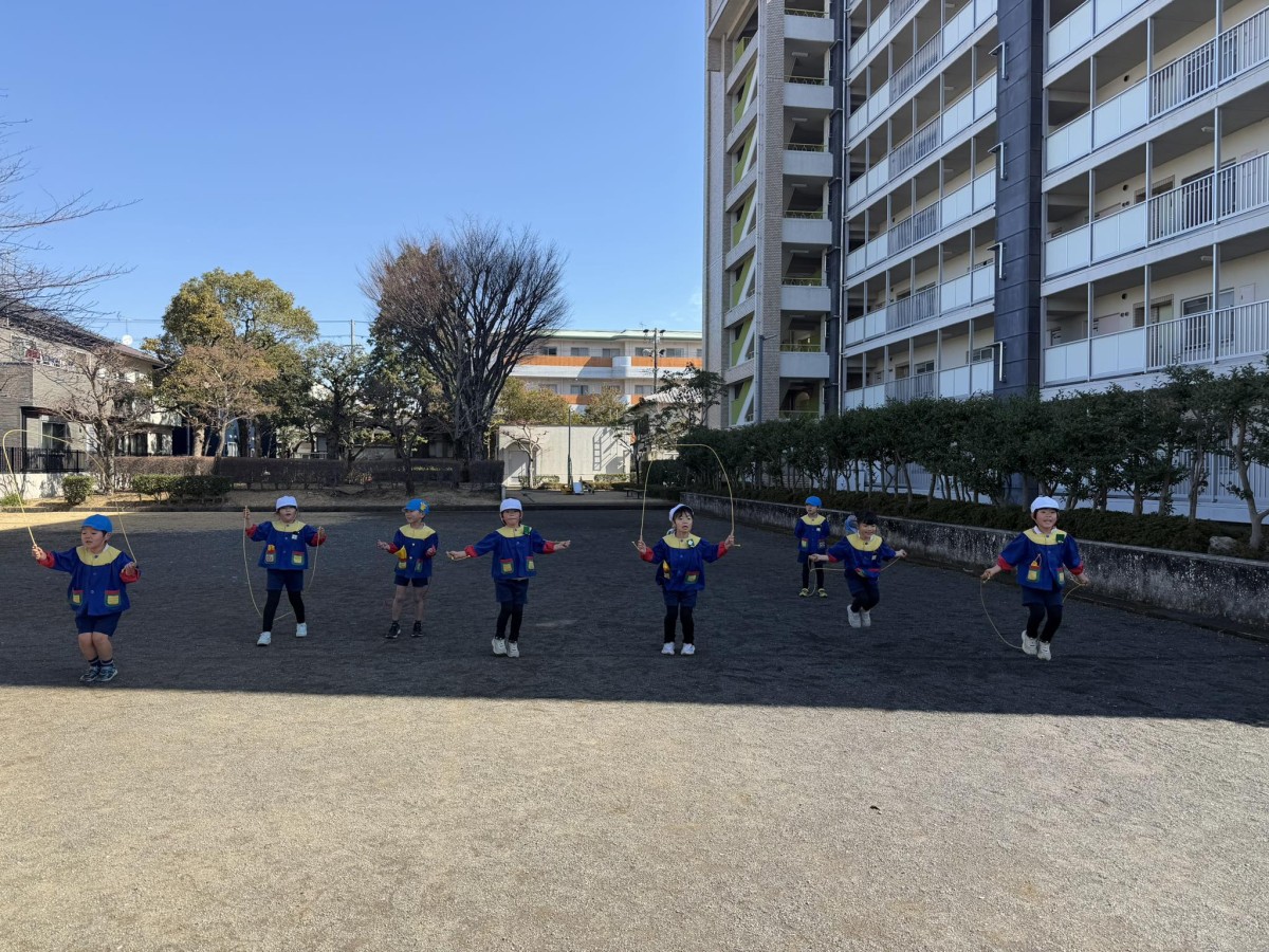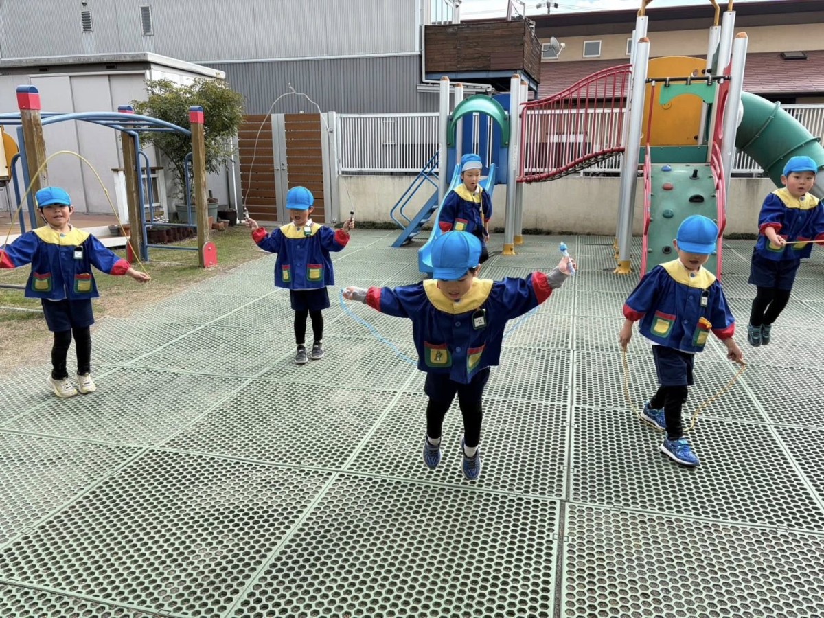 午前中はまなびきっずをしました。集中して取り組んでいました。午後は園庭でたっぷりと遊びました。縄跳びがブームで一生懸命練習していました。