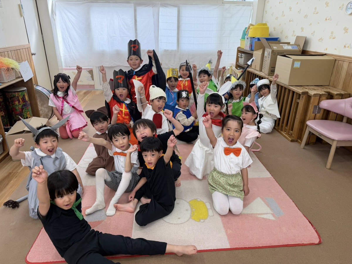 舞台の上でオペレッタ、お遊戯を撮影しました。お休みの子の代役も立派に行なうことができました。衣装を着るとやる気倍増で見ているこちらも嬉しいです。とっても上手にできました。園庭でも遊ぶことができました。