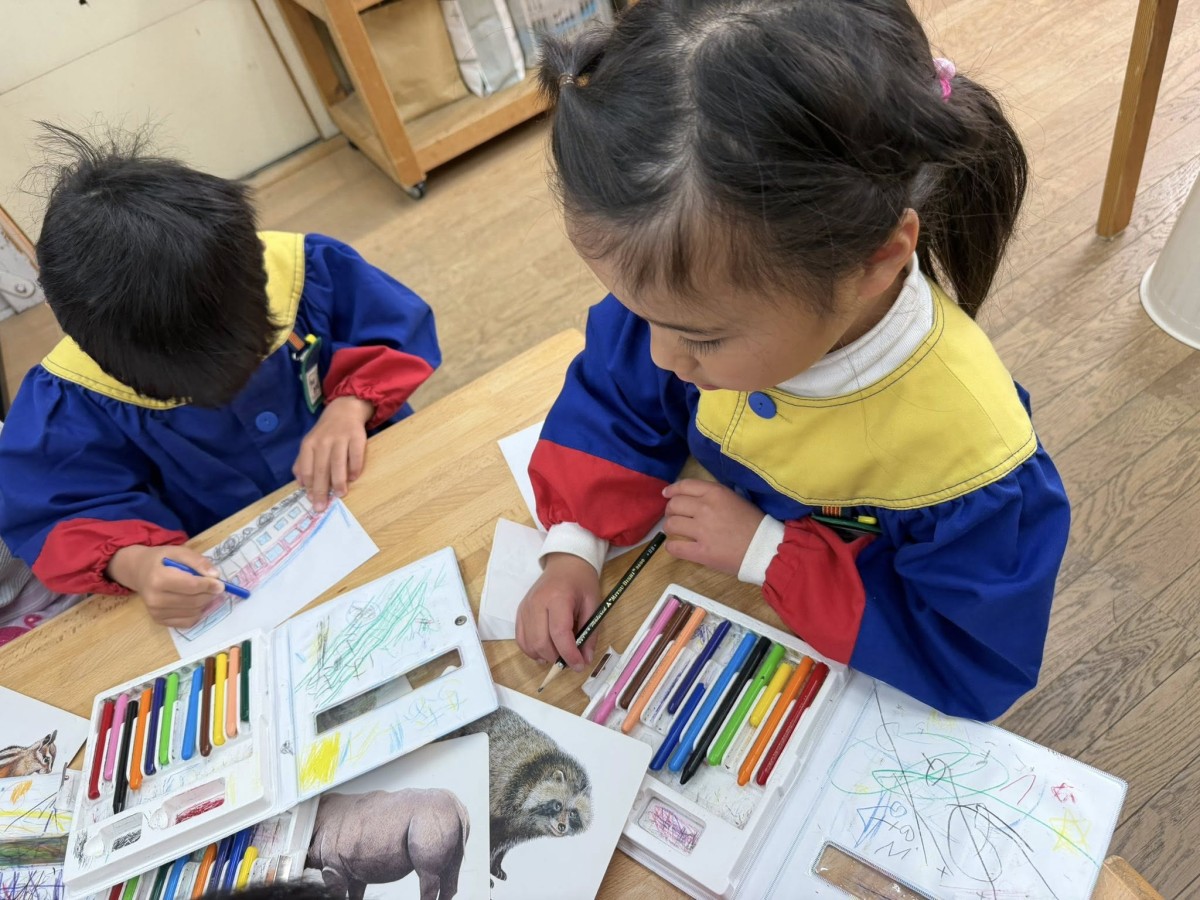 今日は、文集の絵の本番描きをしました。丁寧に慎重に考えながら描き進めているのが印象的でした。待っている間、カードを見ながら動物や昆虫の絵を描いていました。上手に描けるようになる方法を園長先生が教えてくれました。お話しをしっかり聞いたり見たりしながら過ごしました。午後は、久々にお散歩に行くことが出来ました。安倍川公園まで歩いて行き、たっぷりと遊んでくることが出来ました。たくさん走ってたくさん笑って元気いっぱいなあお組さんでした。