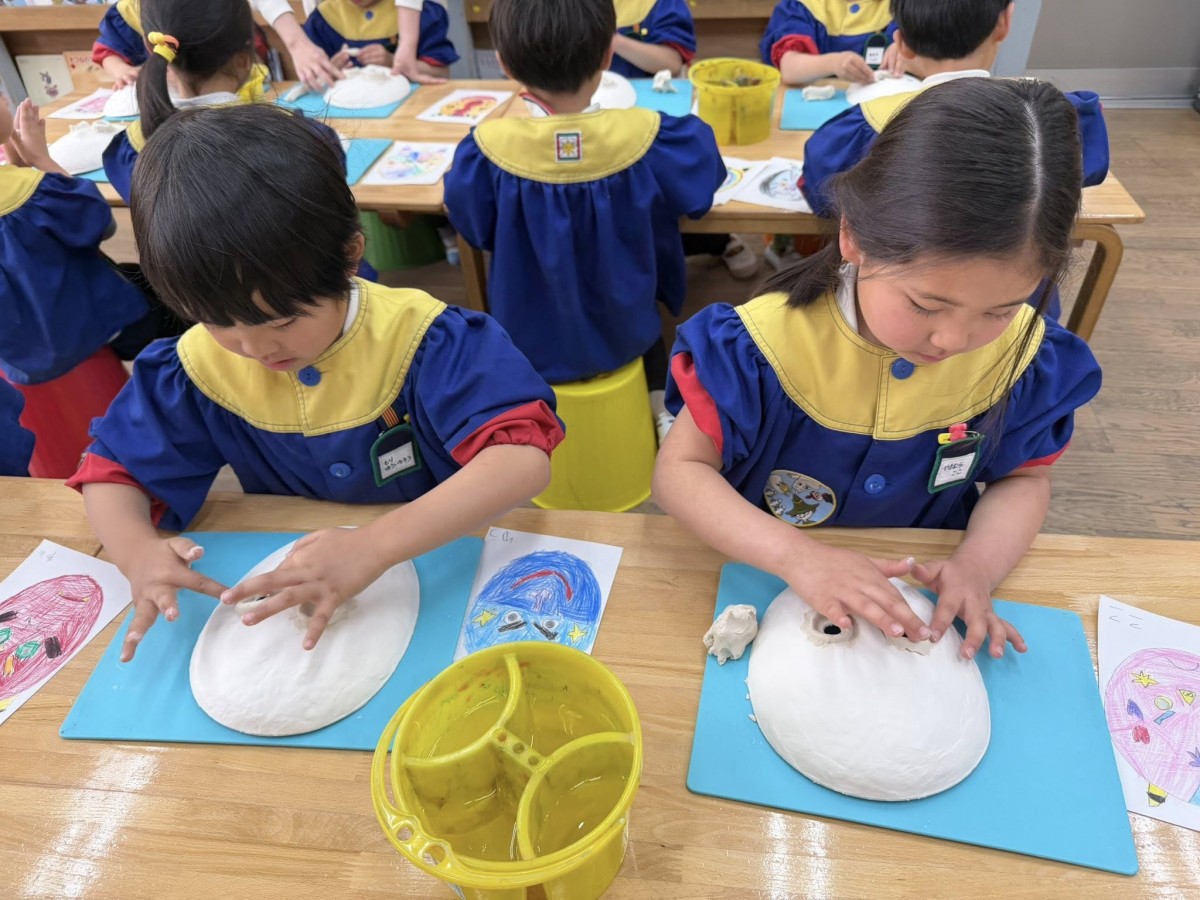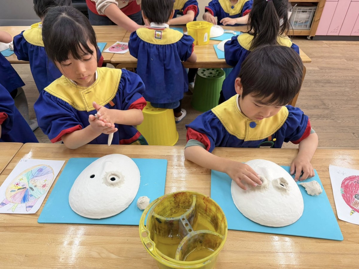 午前中は英語がありました。自分の好きな物を英語で伝える練習をしました。大きな声で伝えることができていました。午後は鬼面作りをしました。粘土をたくさんこねて、自分のイメージする鬼を作り上げていました。