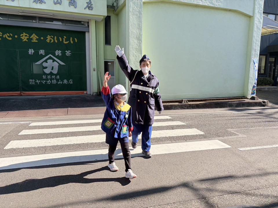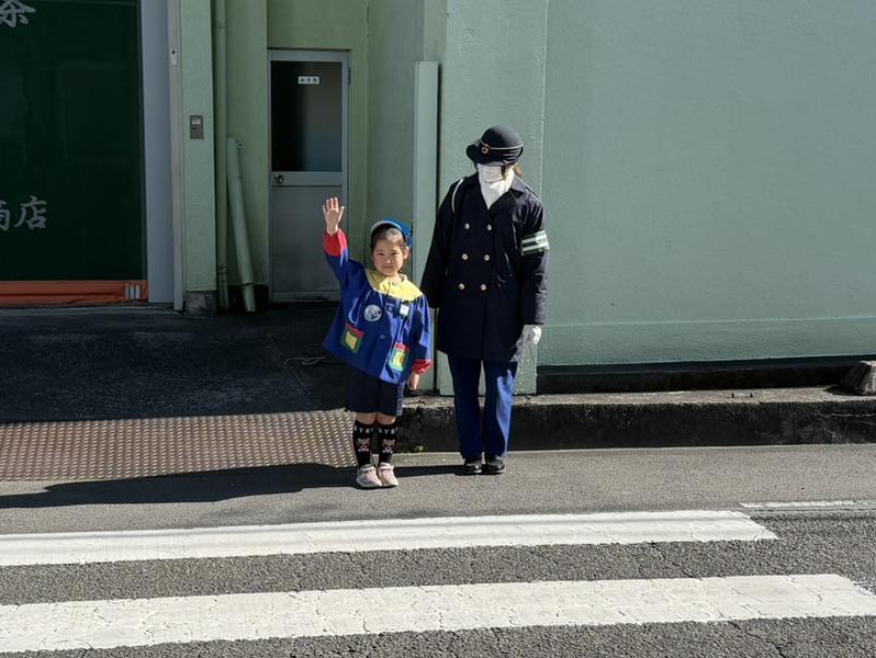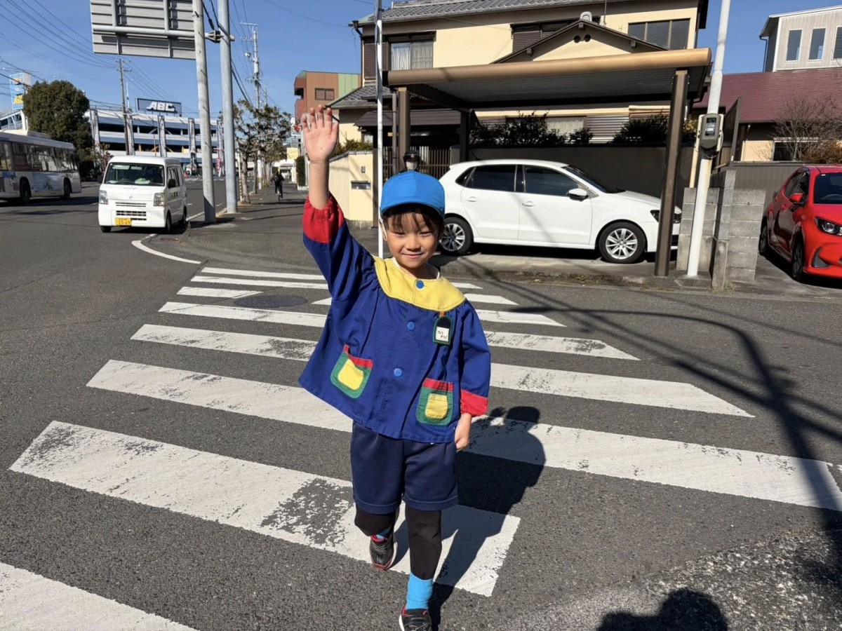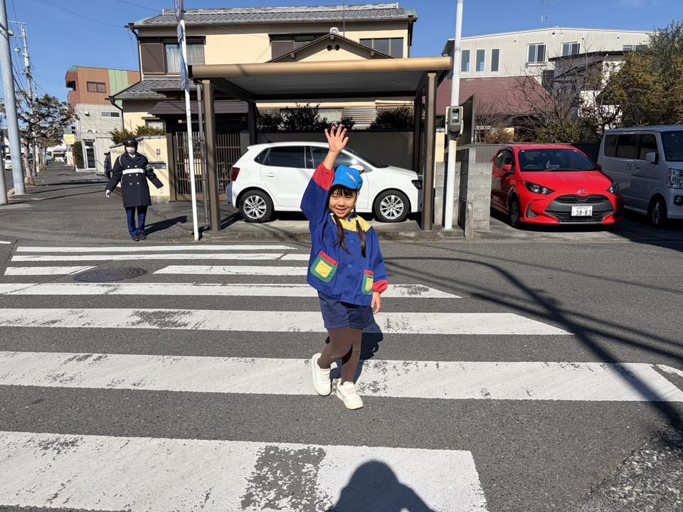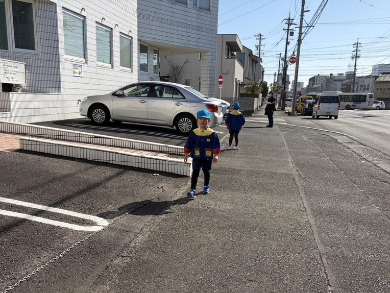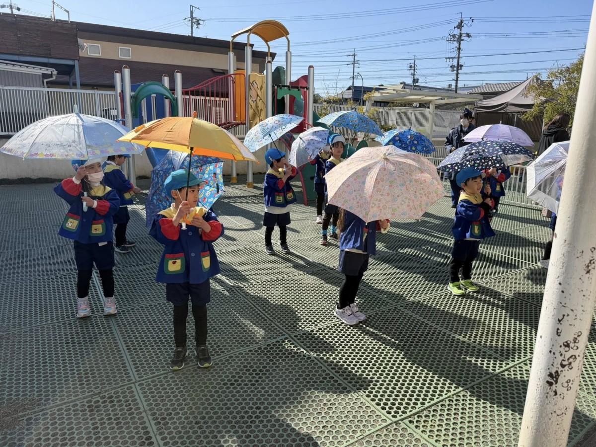 午前中は交通安全教室がありました。傘の持ち方、傘を持っての横断歩道の渡り方などを教えてもらいました。実際の道路を歩いて見ました。普段お友達と手を使いで歩いている道も、1人で歩いていきました。ドキドキした表情でしたが、もうすぐ1年生!1人で歩いて自信に繋がればいいなと思います。午後は園庭で遊びました。