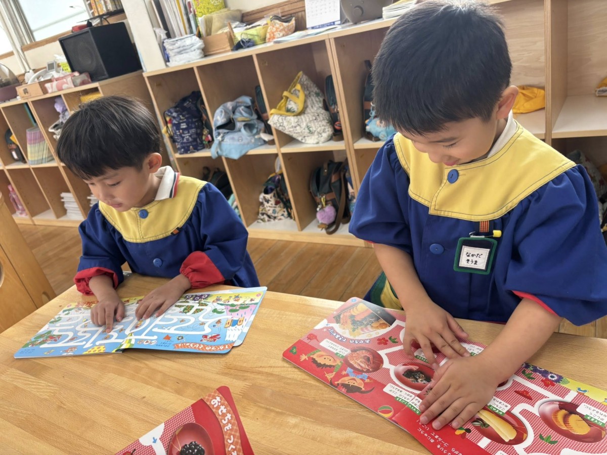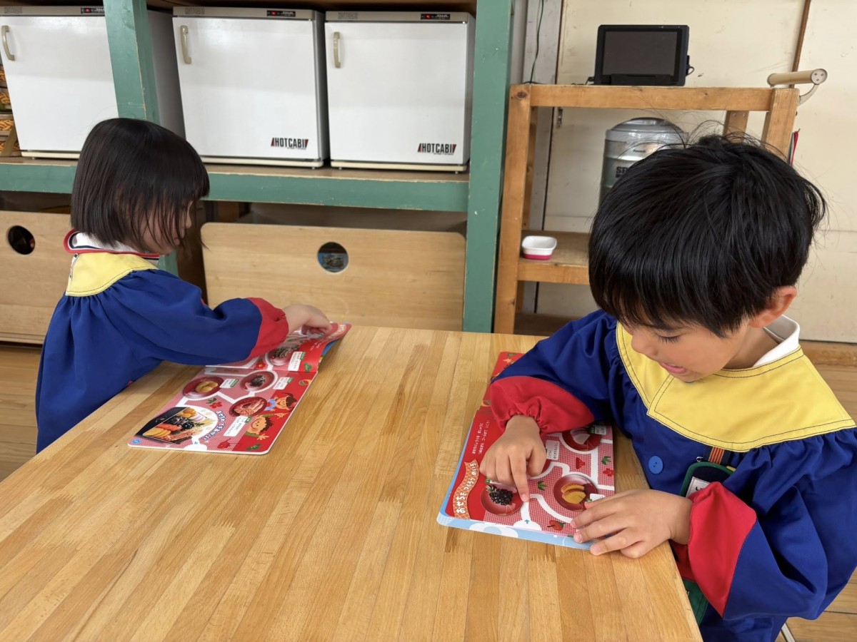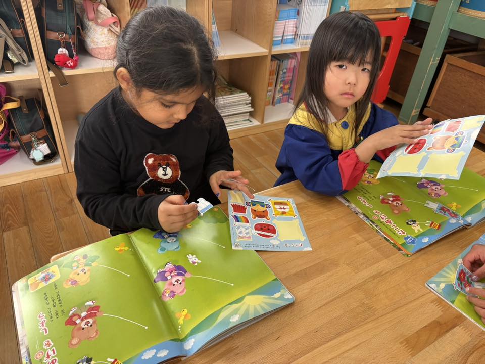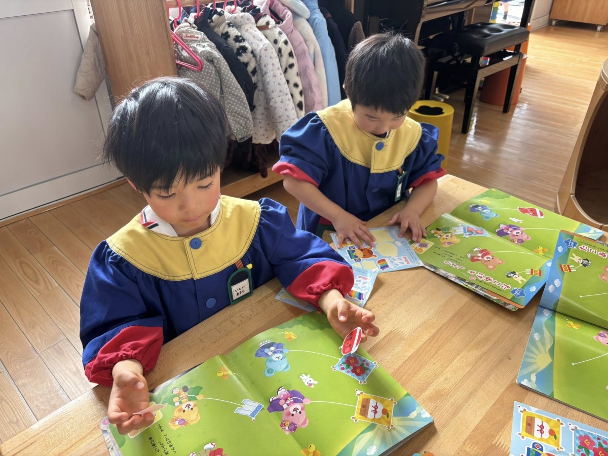 今日は月刊誌を読みました。シールのページでは、ドングリの子どもに可愛い帽子をかぶせてあげました。「〇〇ちゃんと一緒にした!」と、仲良くお友だちの真似っこして嬉しそうにしていました☆