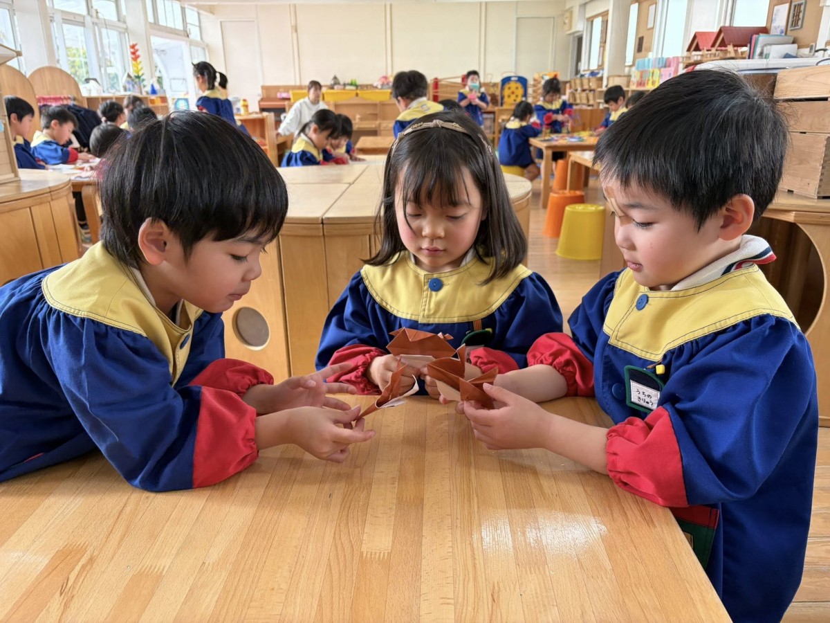 | 今日はお休みの子が多く、いつもより静かなきい組さんです。午前中は折り紙で遊びました。コマや風船など、お友だちと教え合いながら夢中でたくさん折っていました。午後は園庭で遊びました☆ |