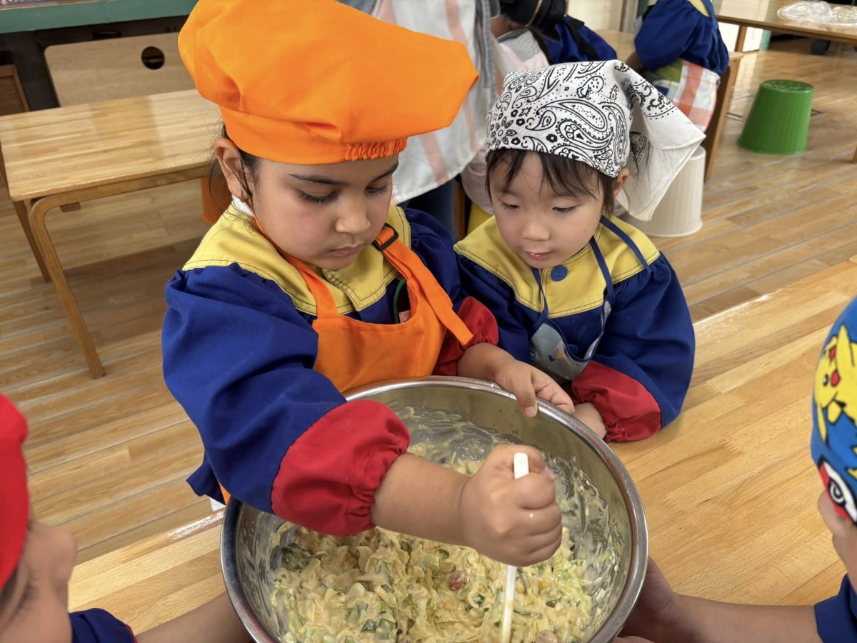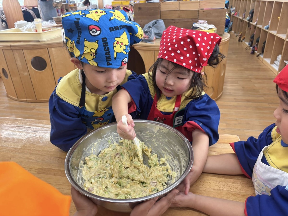 | 今日は午前中、生活発表会の練習をしました。お遊戯は初めて最後まで通してやってみましたが、音楽に合わせて一生懸命ついていこうと頑張っていました! 午後はクッキングがあり、スイートポテトを作りました。ボウルに材料を入れ、「おいしくなあれ」と混ぜていきます。出来上がりはとてもおいしく、ペロリと食べていました☆ |