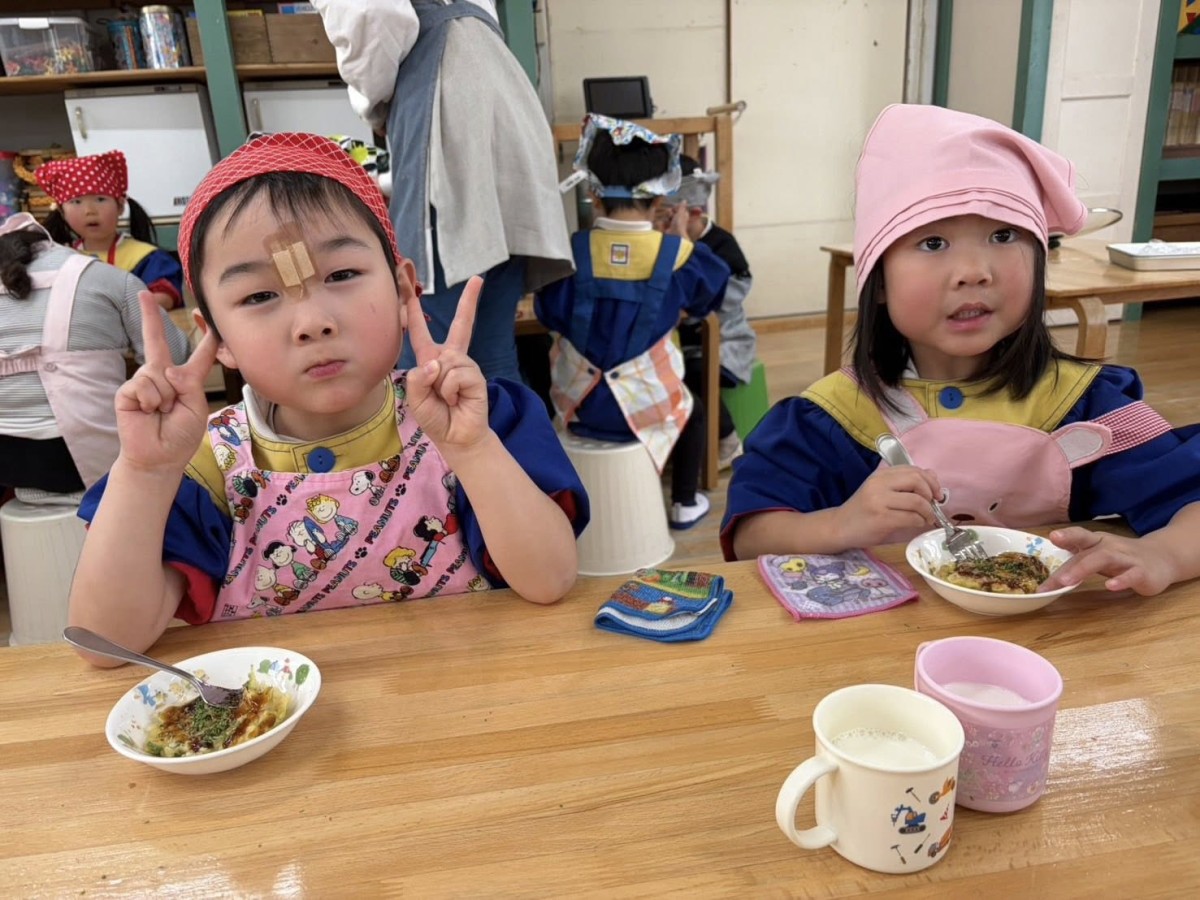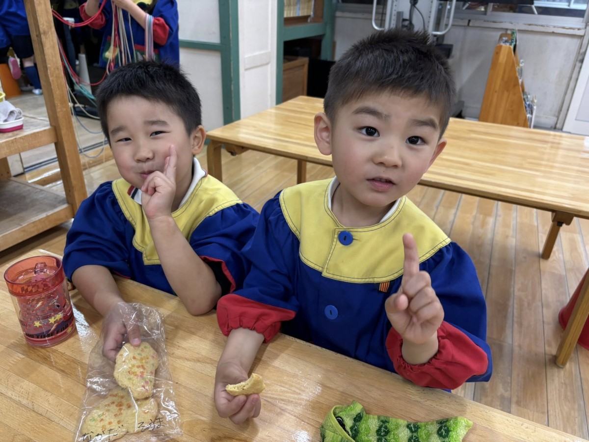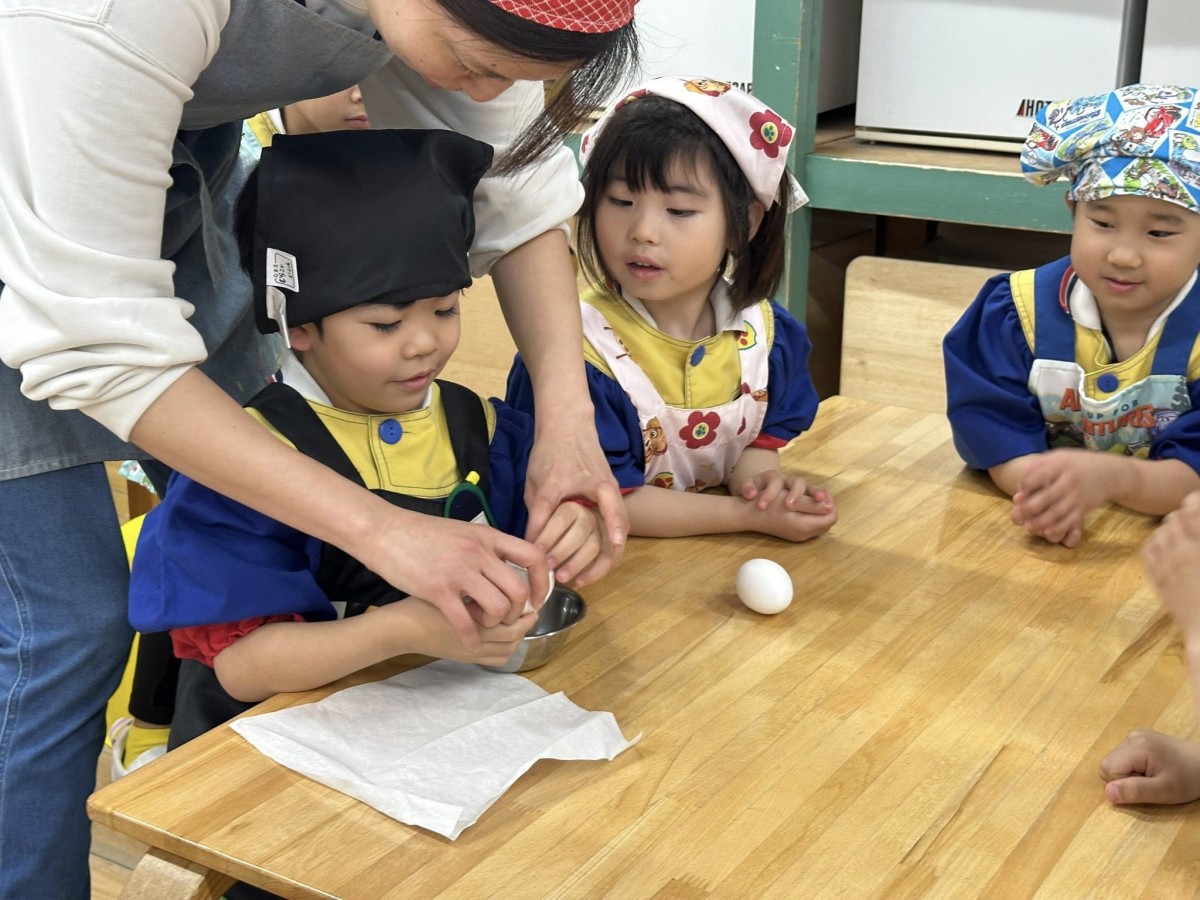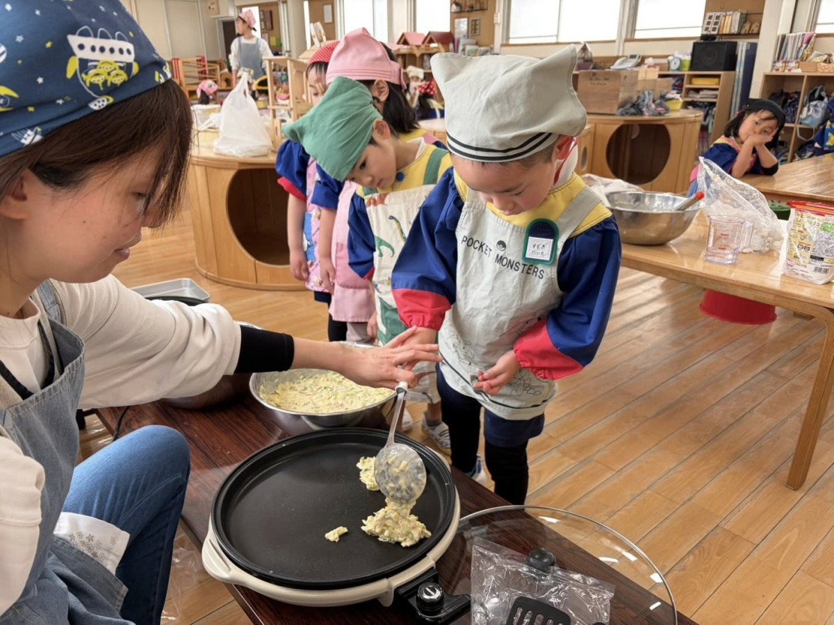 今日は午前中、体育遊びがありました。鉄棒では、前回と同じように、ぶら下がったり前まわりの練習をしたりしました。回数を重ねていくごとに、怖がらずにやれるようになってきました!午後はクッキングでお好み焼きを作りました。自分で焼くのはドキドキでしたが、とっても上手に作れ、たくさんおかわりしました☆