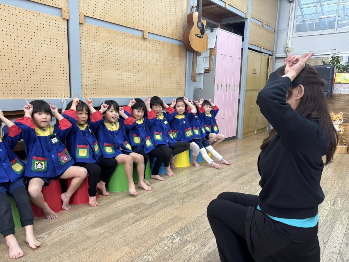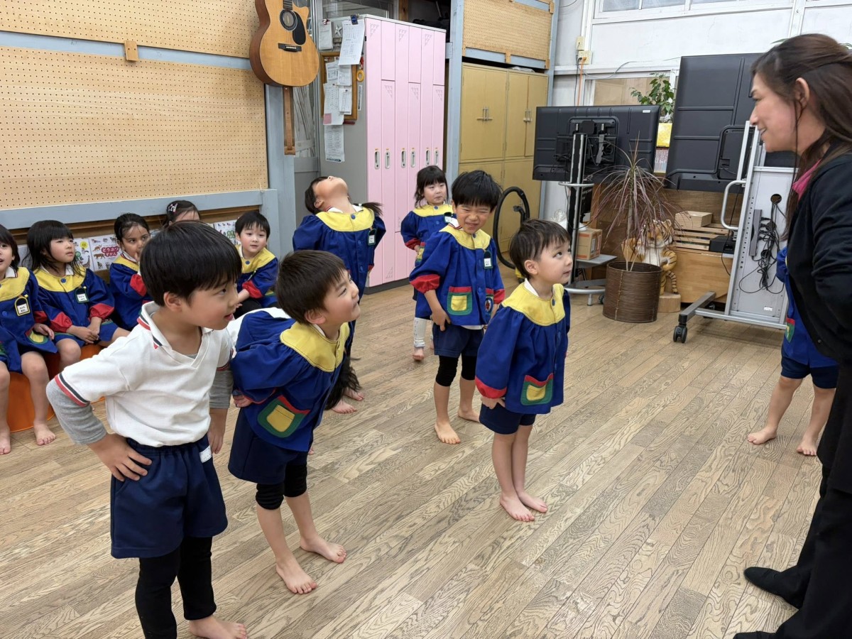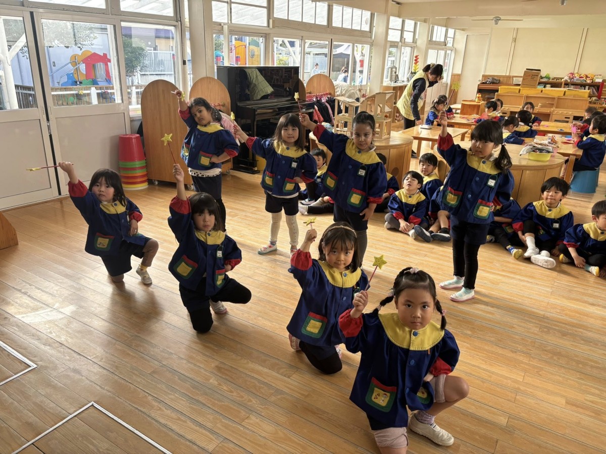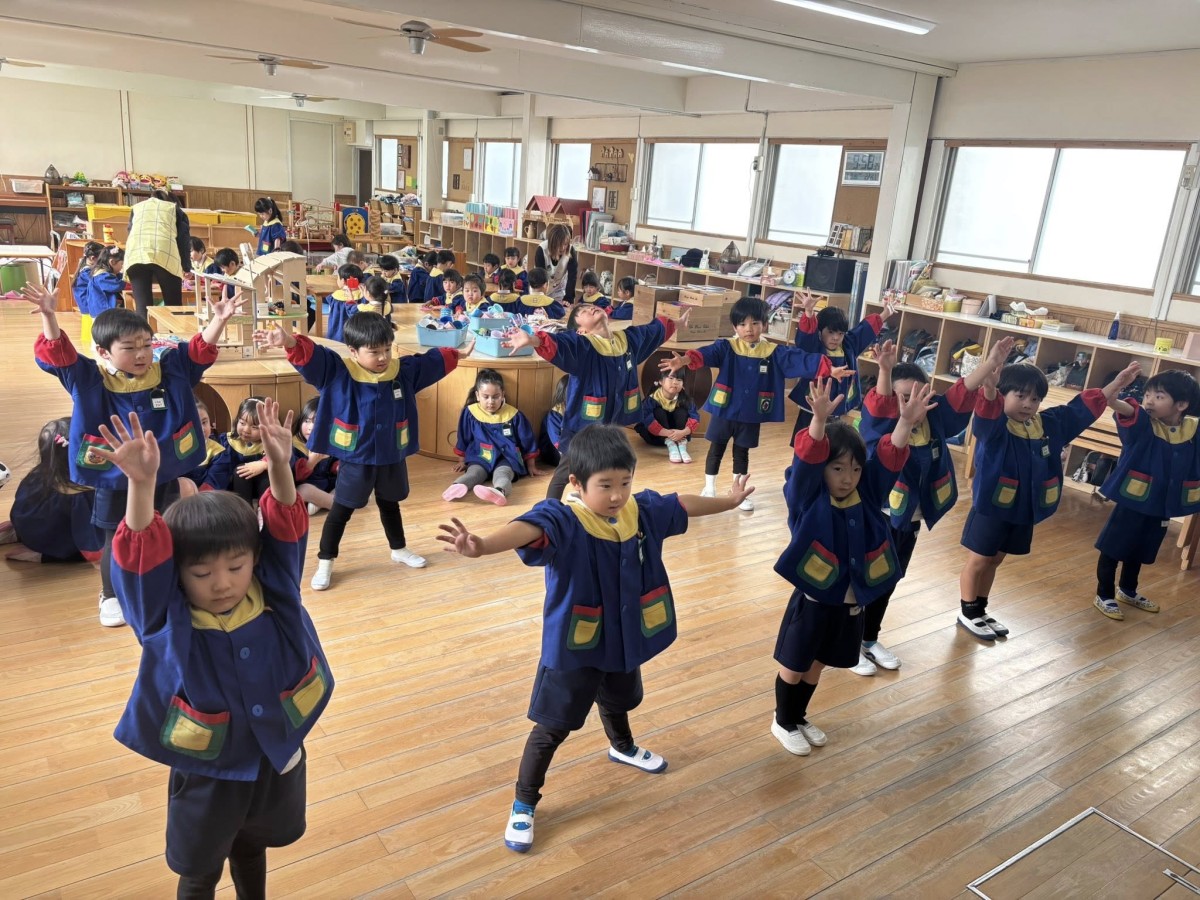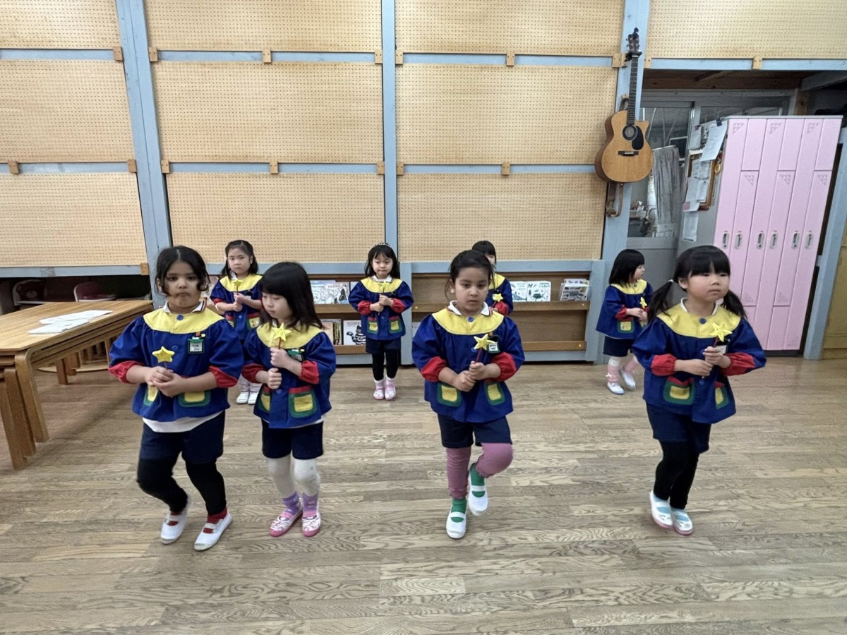 | 今日は午前中、月刊誌を読んだあとオペレッタの練習をしました。歌や動きも、少しずつ自信がついてきて、堂々と表現してくれます。午後は園庭で遊んだあとお遊戯の練習をしました。男の子の演目「オレオレ!スターフィッシュ」では、スターフィッシュ(ヒトデ)のように両手をしっかり広げて踊りました☆ |
