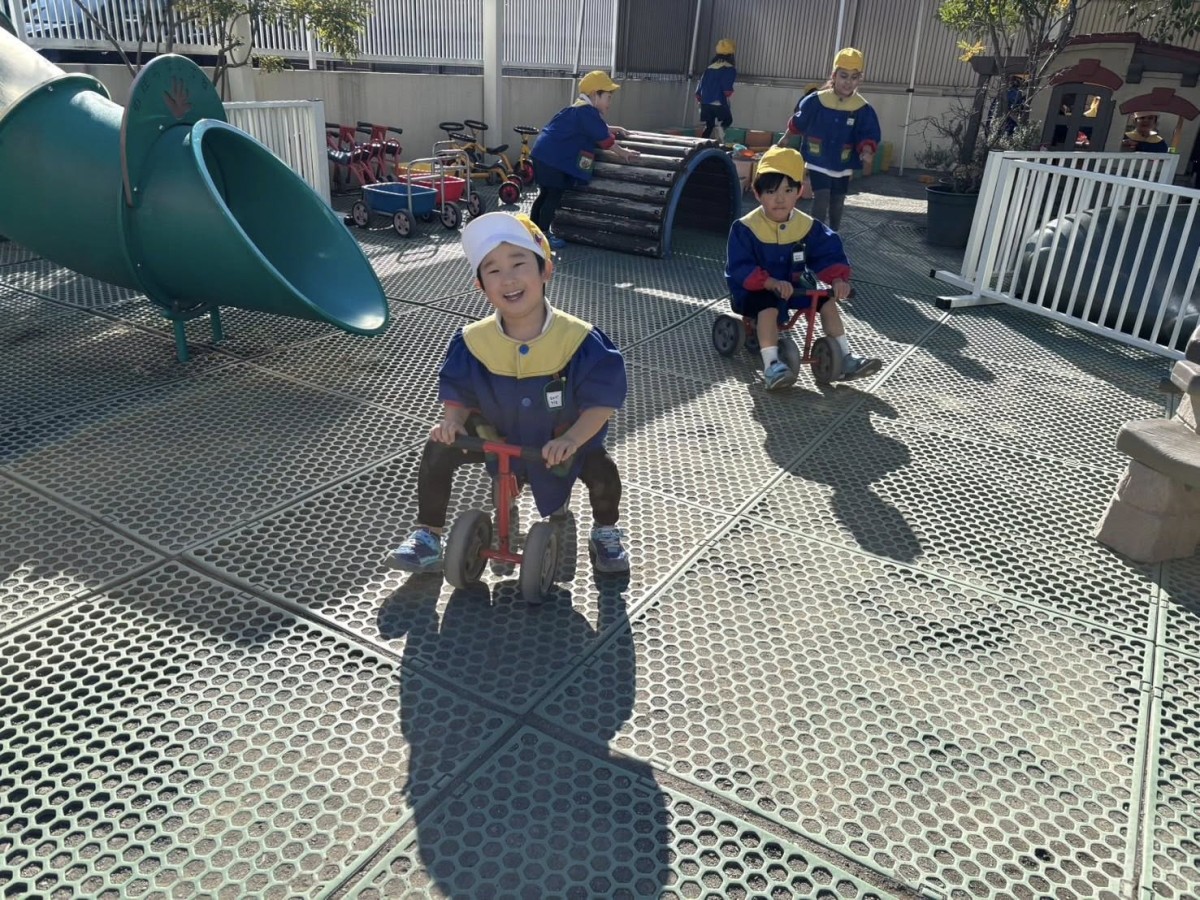 | 今日は午前中、月刊誌を読んだあと、パズルやお絵描きをして過ごしました。午後は園庭に出ました。日差しが暖かく、気持ちよく遊んでいました。お部屋に入る前に、三輪車レースをしました。「がんばれー!」と自分のチームを応援し、白熱した戦いになりました☆ |