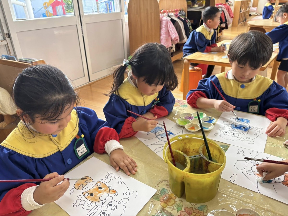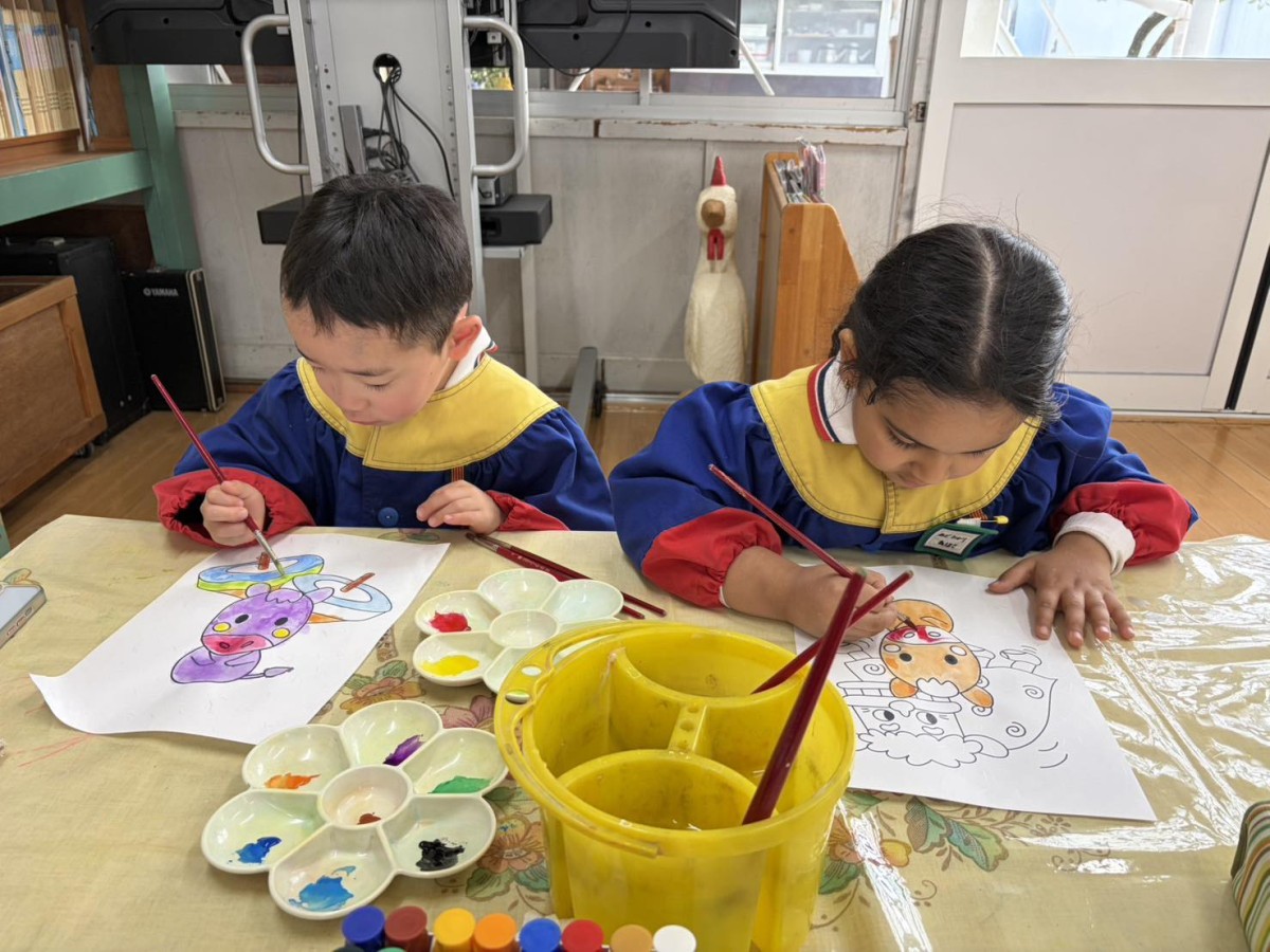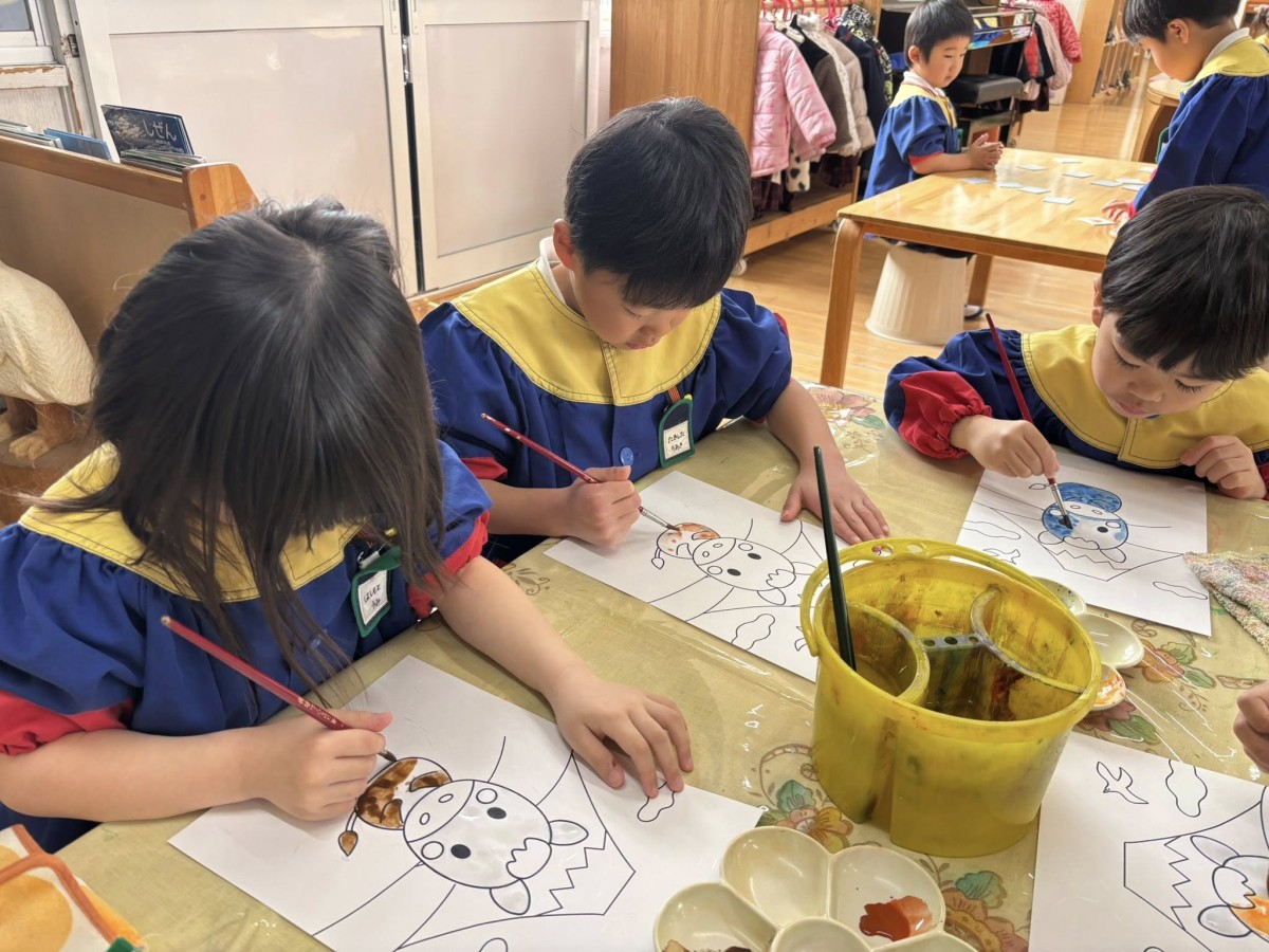 今日は凧の制作をしました。自分で選んだ、干支の入ったイラストに、絵の具で色を塗っていきます。筆の使い方も慣れてきて、線からはみ出さないように集中して行っていました。午後は園庭で遊びました☆