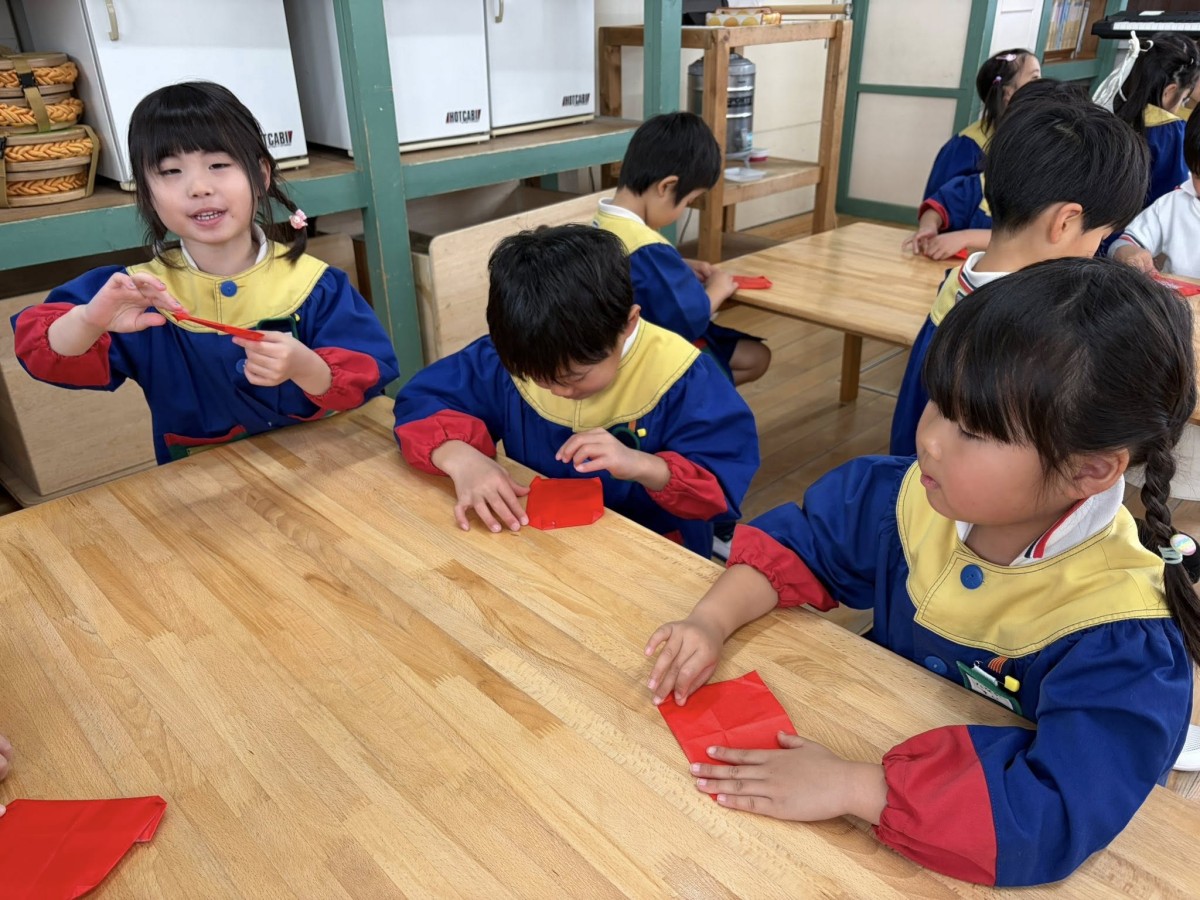 | 午前中は折り紙で青鬼と赤鬼を折りました。鬼の体は途中分かりづらいところがありましたが2回目になるとコツを掴んだようで「簡単だよ」と自信満々に折っていました。午後は園庭で遊びました。 |