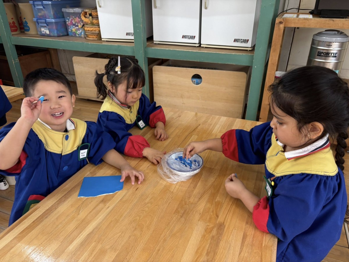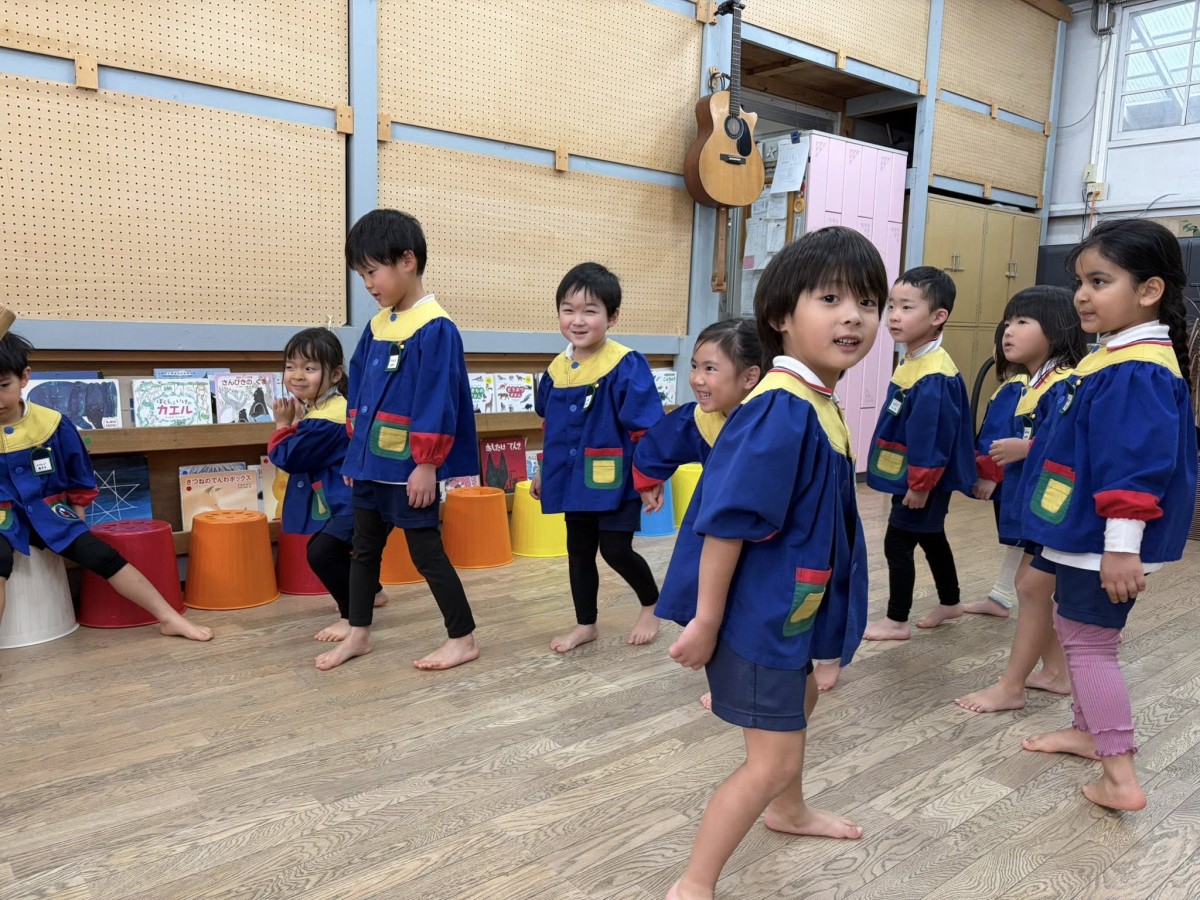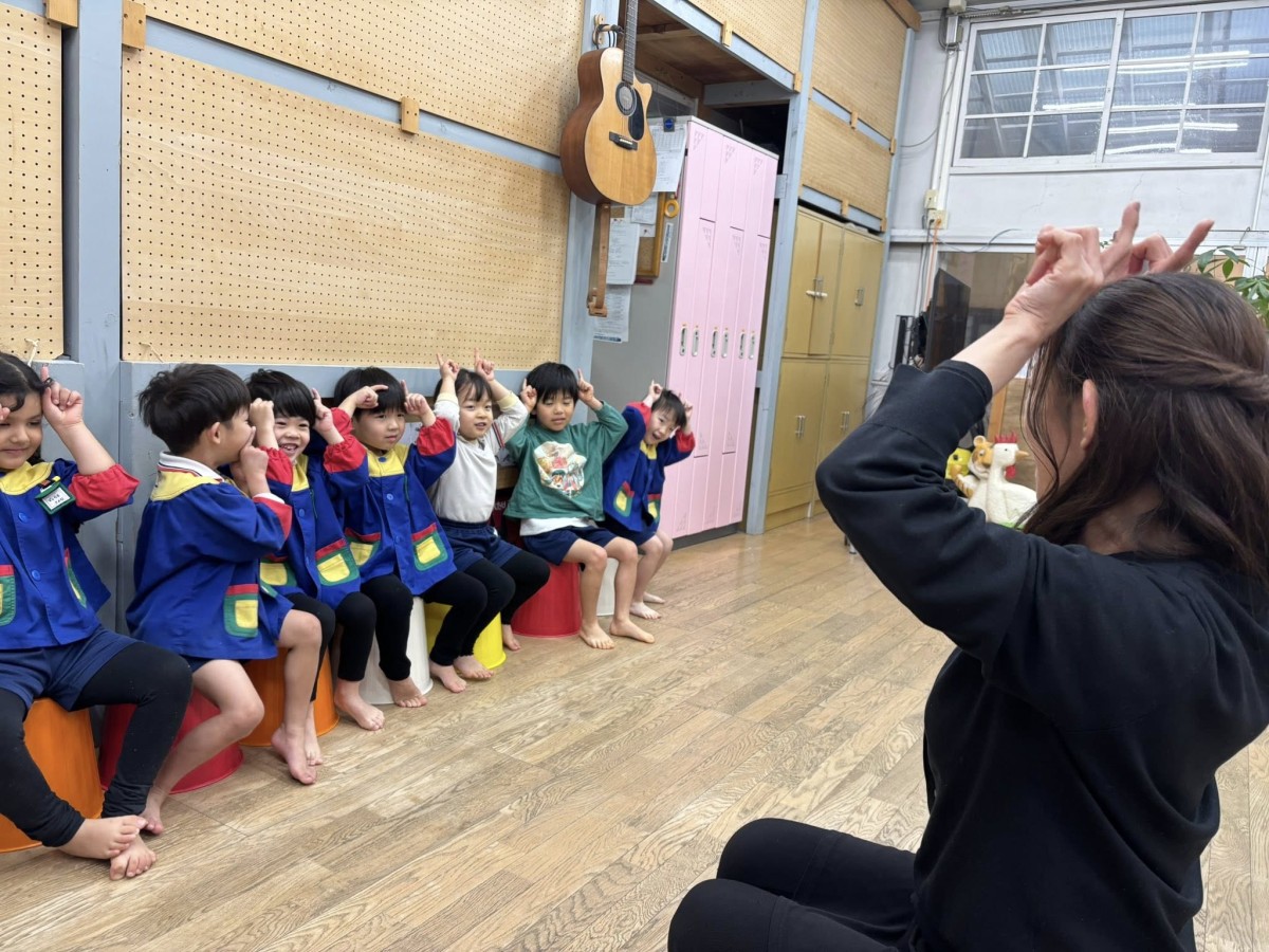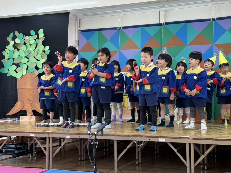 今日は午前中オペレッタの練習をしました。通しでの動きをだんだん覚えてきたので、小道具の楽器を持ったり置いたりするタイミングを改めて確認したり、間違えやすい歌詞を何度か繰り返し歌ったりしました。 午後は「せかいじゅうのこどもたちが」の歌の練習をしました。初めて聞く子もいたようでしたが、練習をしていくと徐々に歌えるようになってきました。「この歌好き♡」と、早くも気に入った様子のお友だちもいました☆