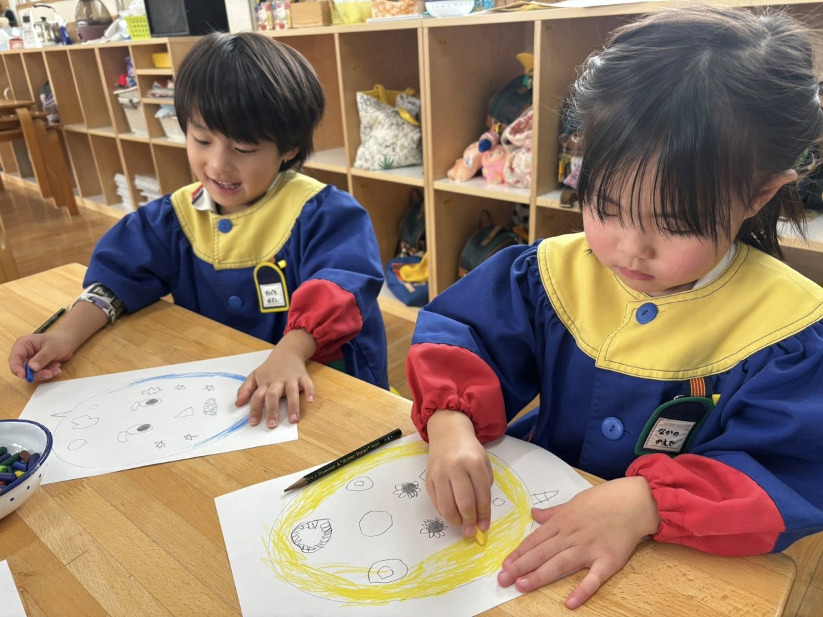 今日も午前中はオペレッタの練習をし、午後は園庭で遊んだりワークをしたり、お絵描きをしたりして過ごしました。スケッチブックに体付きのブタとキリン、雲、それから以前描いてみた太陽を描いてみました。筆圧が濃くなってきた子、色を丁寧に塗りつぶせるようになってきた子、それぞれがレベルアップしてきたように思います。今だけの可愛らしい絵にほっこりします。