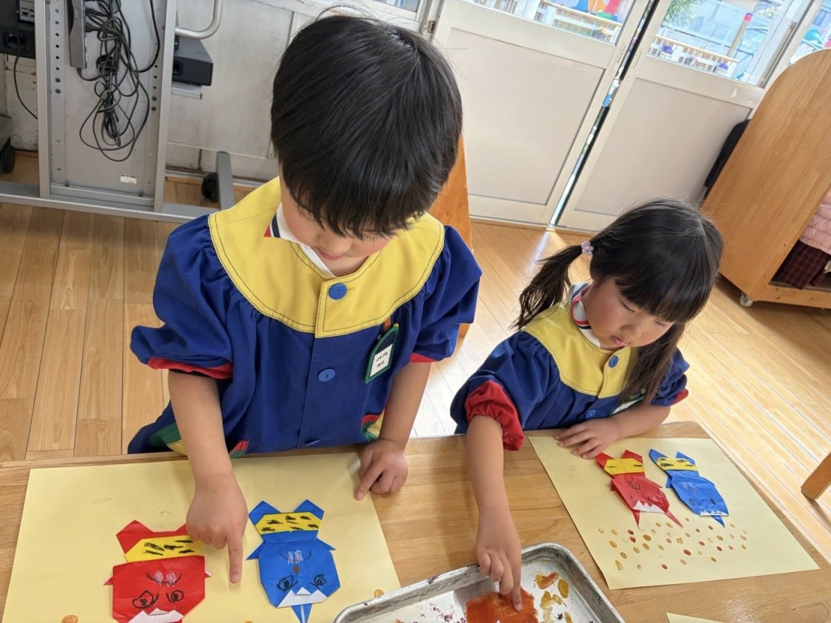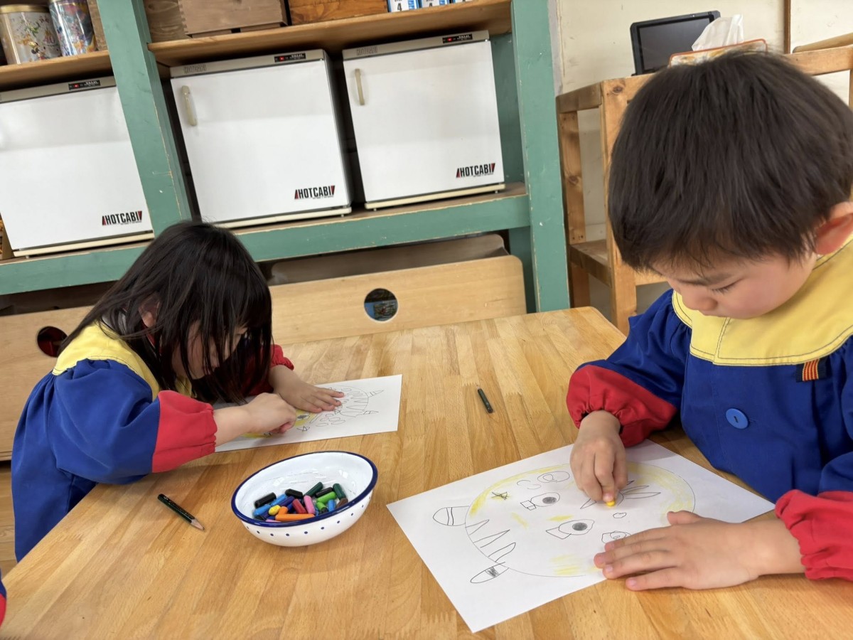| 今日は午前中、月刊誌の付録のめいろの本で遊んだあと、月の制作をしました。鬼の顔や、鬼のパンツの模様をクレヨンで描き、画用紙に貼ったあとは、まわりに絵の具で指スタンプをして豆まきを表現しました。鬼の顔は笑っていたり怒っていたり、様々で面白かったです^ ^ 午後はひらがなのお勉強をしたあと、園庭に出ました☆ |