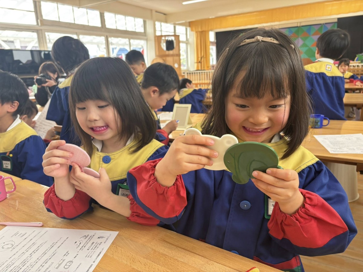 | 今日は午前中、歯磨き教室がありました。歯科衛生士さんから、虫歯にならないためのお話や、おやつを食べる時のお約束を聞いたりしました。そのあとは歯にお薬を塗って、染め出しをしました。鏡を見ながら、赤く残っているところを丁寧に磨きました。「みんな、とっても綺麗に磨けたね!」と褒めてもらいました^ ^午後は舞台の上でオペレッタの練習をしました☆ |