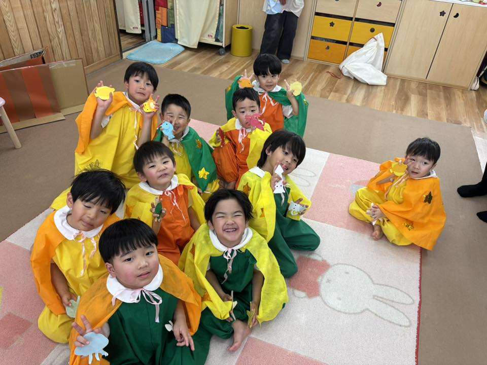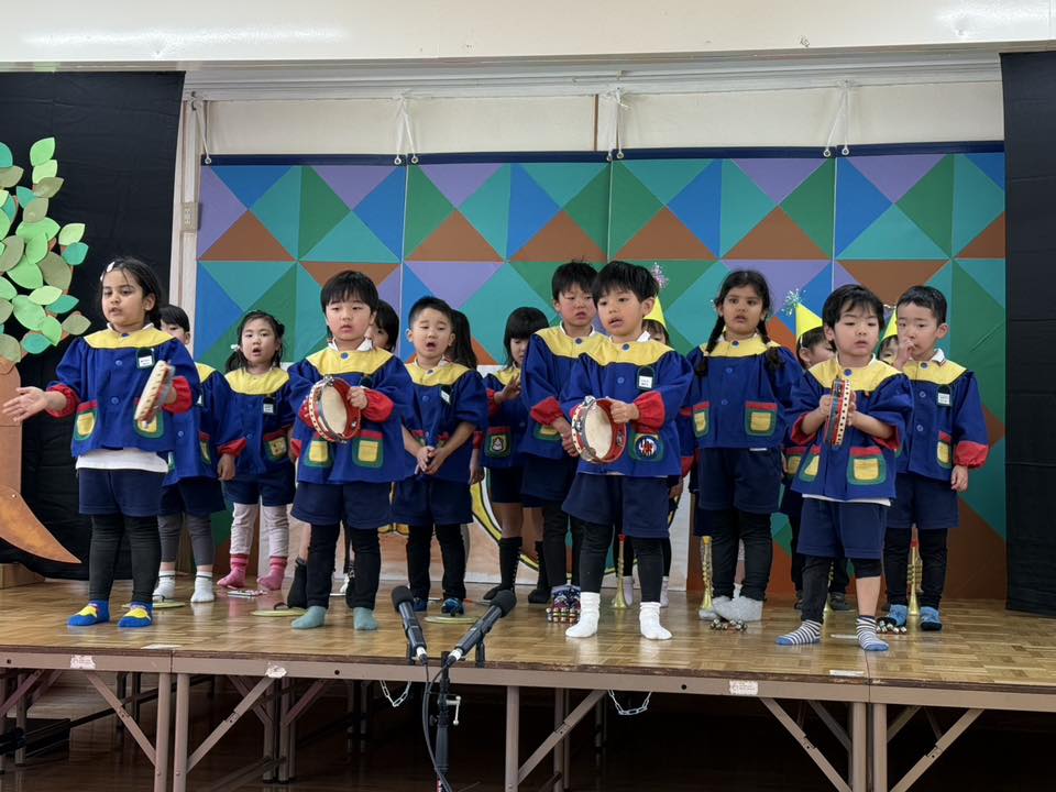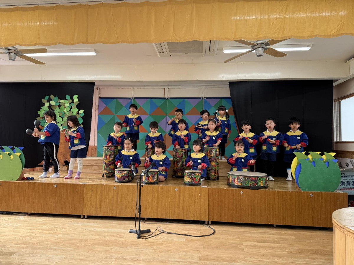 今日は午前中、合奏の練習をしました。太鼓やタンバリンなど、触ったことのある楽器もあれば、ギロなどの初めて見る楽器もあり、ワクワクした様子で演奏に取り組んでいました。午後は園庭で遊んだあと、オペレッタとお遊戯の練習をしました☆