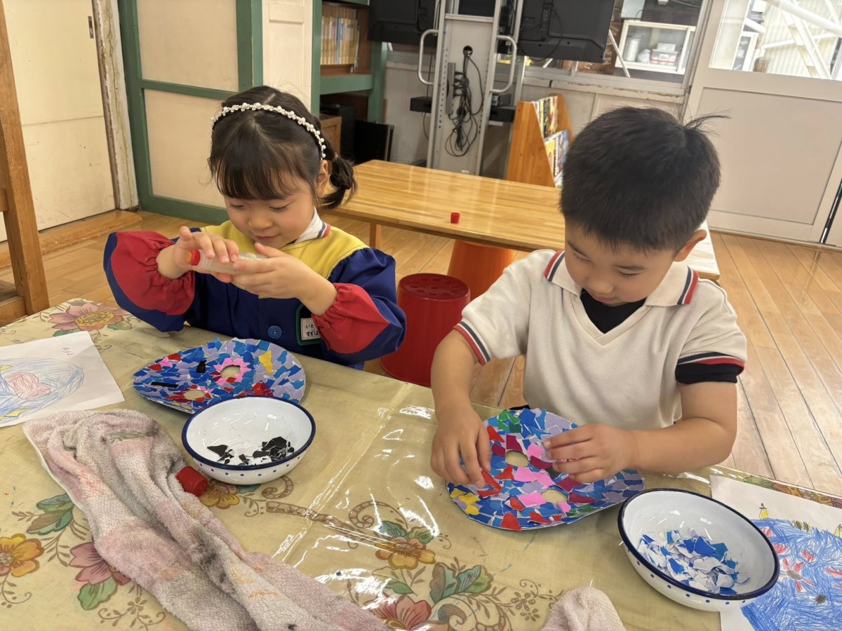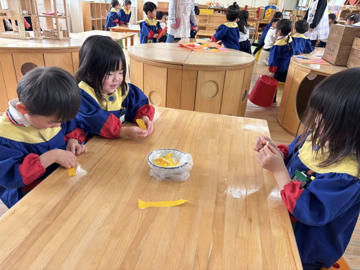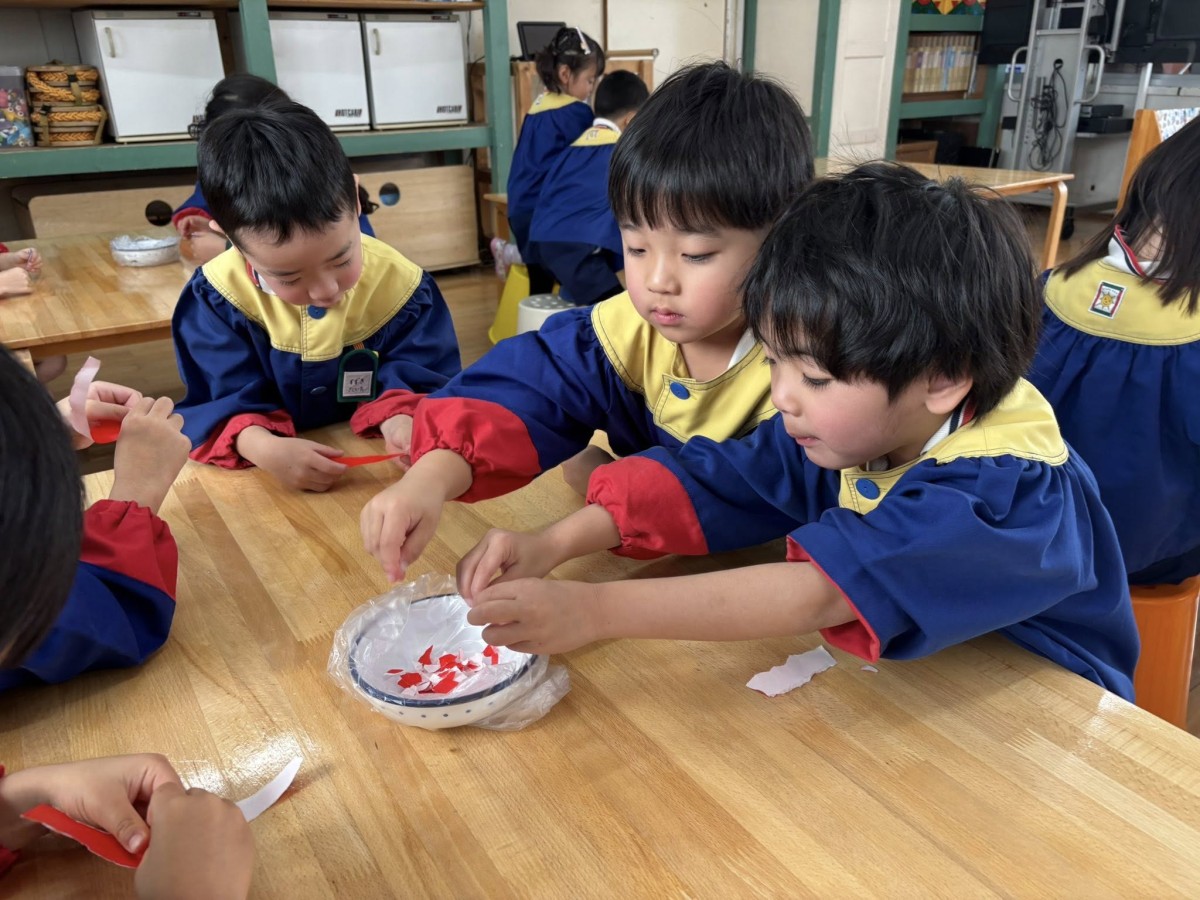 | 今日は鬼のお面作りをしました。色紙をたくさんちぎり、型紙に貼り付けていきました。色紙は大きすぎたり、小さすぎたりしないように調節するのは少し難しそうでしたが、慣れてくるとビリビリと楽しそうに進めている様子が見られました^ ^何日かかけて、少しずつ完成させていきたいと思います☆ |