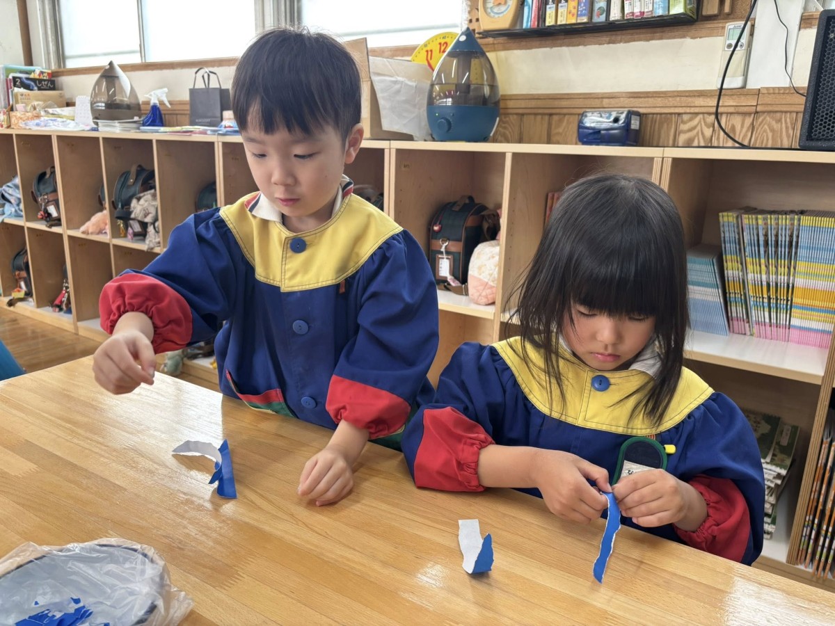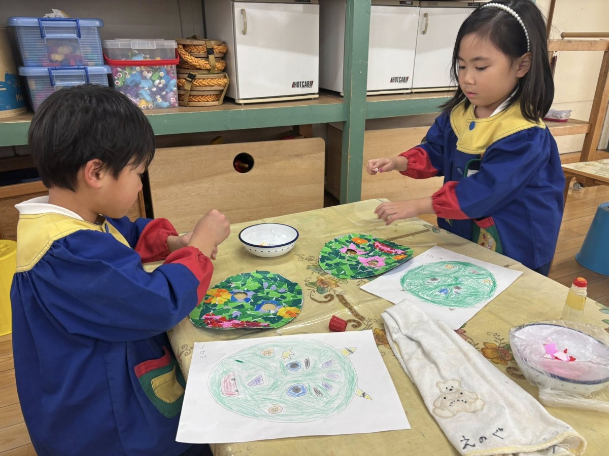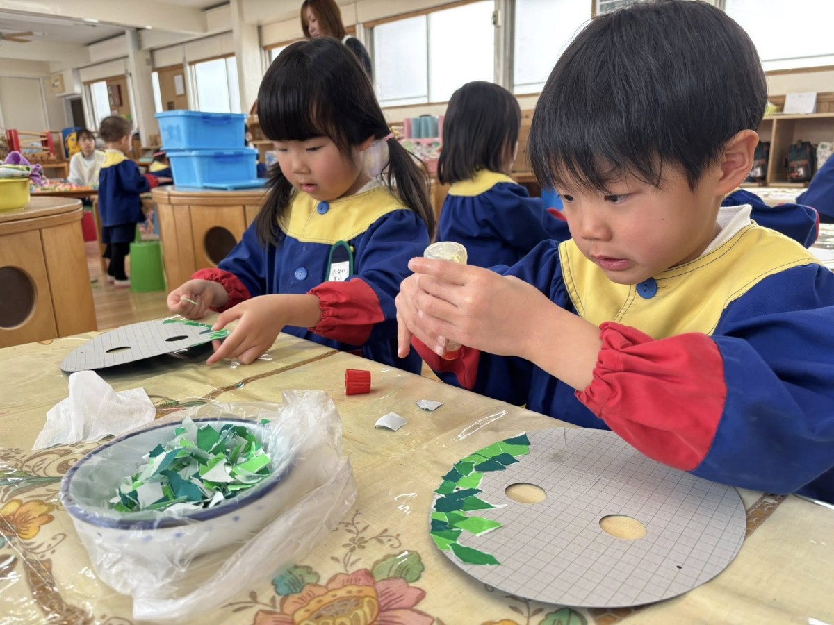 | 今日は午前中鬼のお面作りをしました。完成に近づいてきた子は、最後の仕上げに金や銀の折り紙をアクセントでつけていきます。「ゴールドかっこいい!」と、嬉しそうな様子でした。午後はあお組さんと安倍川公園に行きました。広い芝生の上をお友だちと追いかけっこしてたくさん走ったり、遊具で遊んだりして大はしゃぎなきい組さんでした☆ |
