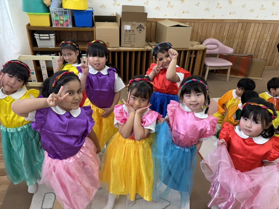 | 今日は、実際に衣装を着て生活発表会の練習をしました。「スカート可愛い♡」「小人の帽子だー!」といつもよりノリノリで取り組んでいました!本番がさらに楽しみになったようです☆ |