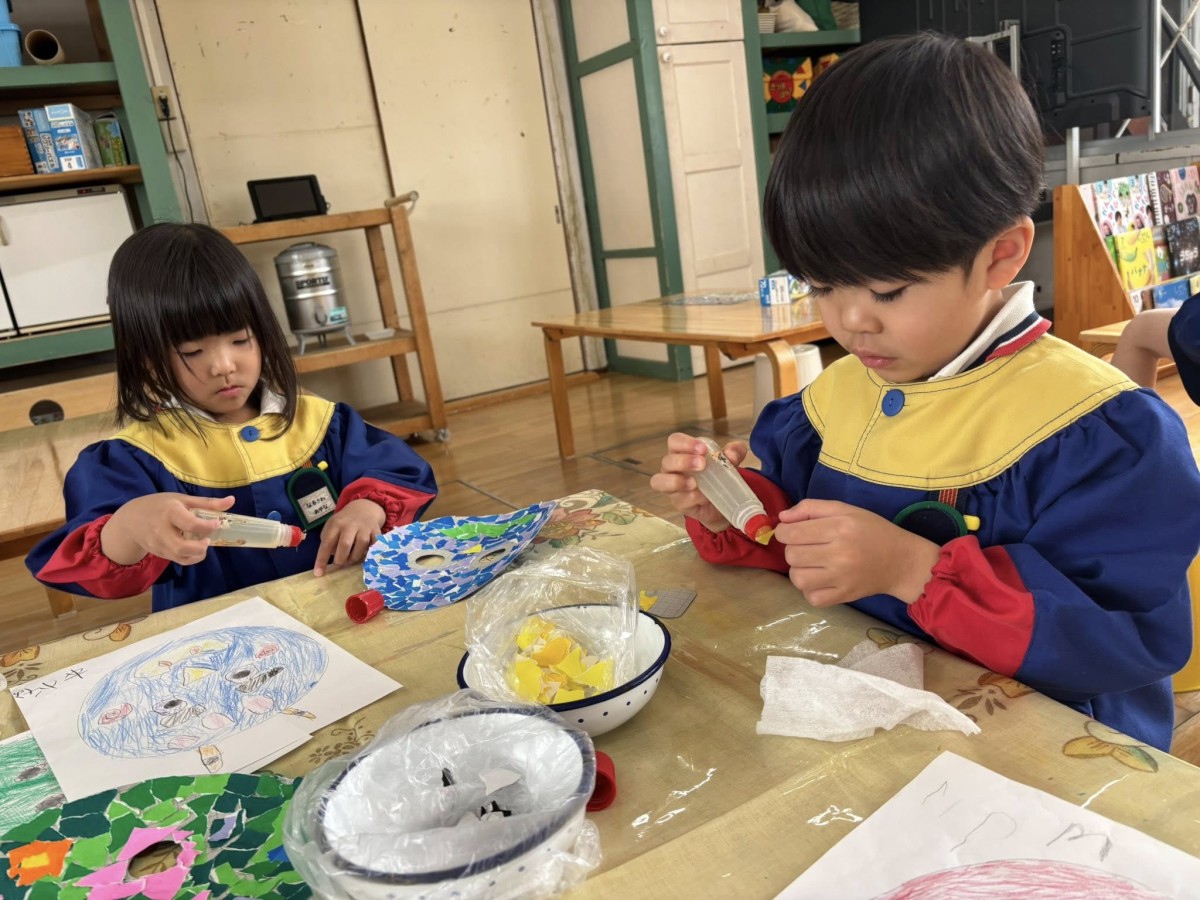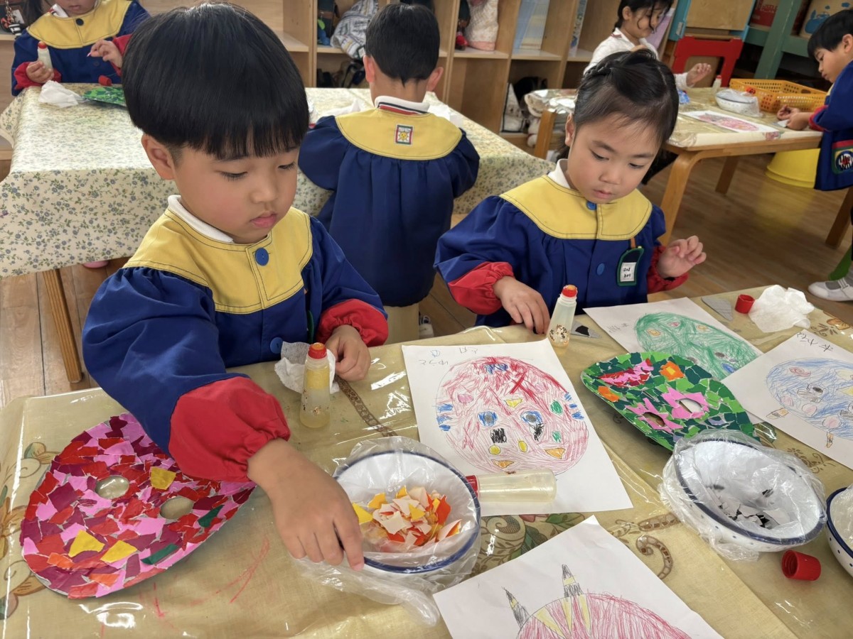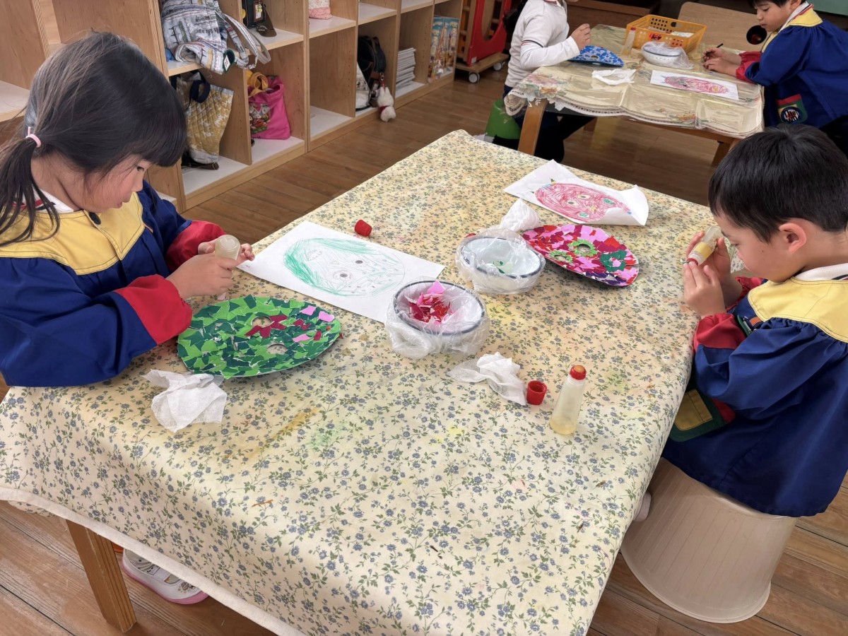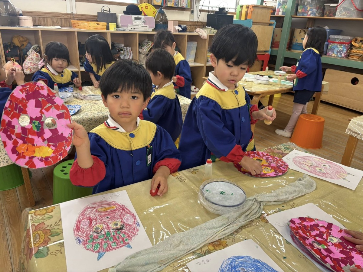 | 今日も鬼のお面作りをしました。土台の色がつけ終わったあとは、口や目、模様などをつけていきます。自分で描いたデザイン画を見ながら、丁寧に貼り進めていました。集中して取り組み、完成に近づいている子が多くなってきました☆ |