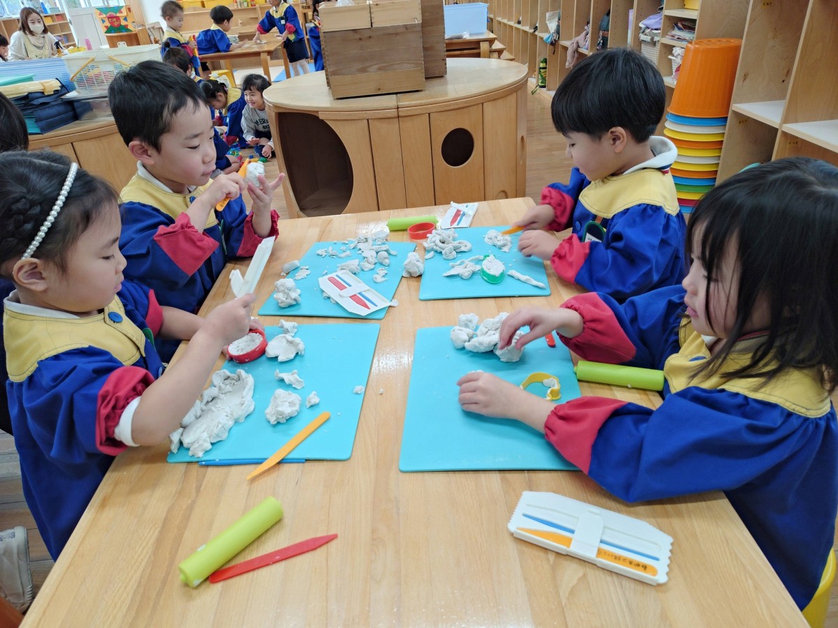 今日は午前中に粘土遊びをし、午後は園庭で遊びました。粘土遊びでは、お友達と一緒にお料理を作って楽しむきい組さん。保育士に「ご注文はなににしますか〜?」「ケーキですね〜、少しお待ちください」とお店屋さんになりきって遊ぶ様子が見られました。