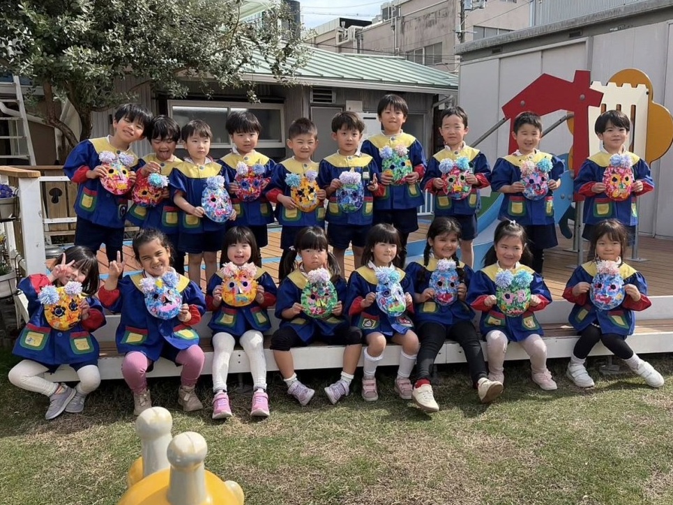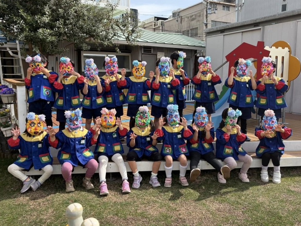 | 今日は、鬼のお面が全員完成したのでみんなで写真撮影をしました。お友だち同士で見せ合いっこしながら、嬉しそうにかぶっていました!午後は園庭で遊んだあと、ひらがなのお勉強をしました☆ |