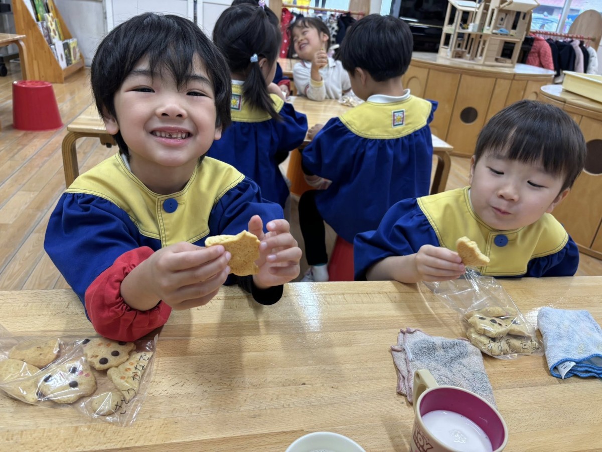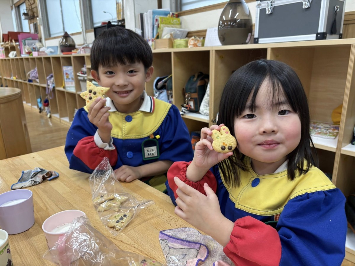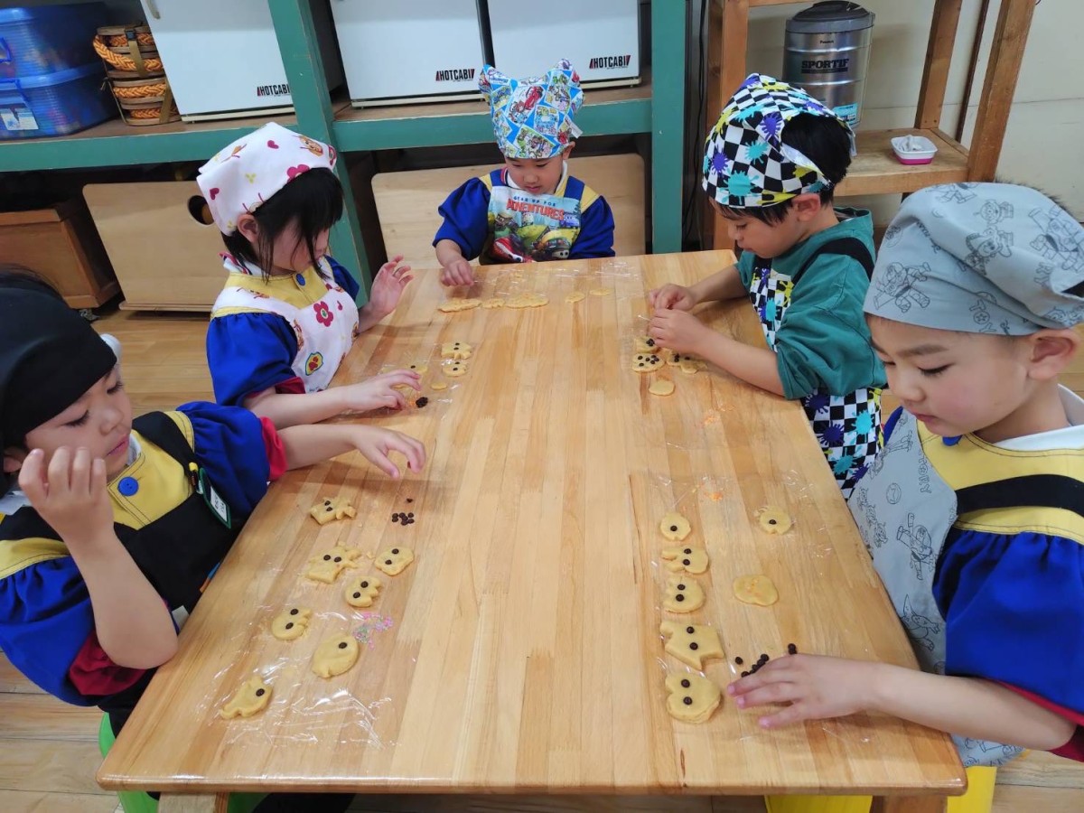 | 今日は午前中リトミックがありました。手遊びをしたり、音楽に合わせて体を動かしたりして楽しく参加できました。そのあとは、お楽しみのクッキング!材料を混ぜたら、いろいろな形に型抜きしていきます。薄過ぎないように気をつけながら伸ばし、ハートや星、ウサギさんなどの好きな形を見つけて作っていました。最後にチョコチップなどで飾り付けをして仕上げ、焼きあがりを楽しみに待ちました♪おやつの時間、おいしくできたクッキーをお友だちと見せ合いながら嬉しそうに食べていました☆ |