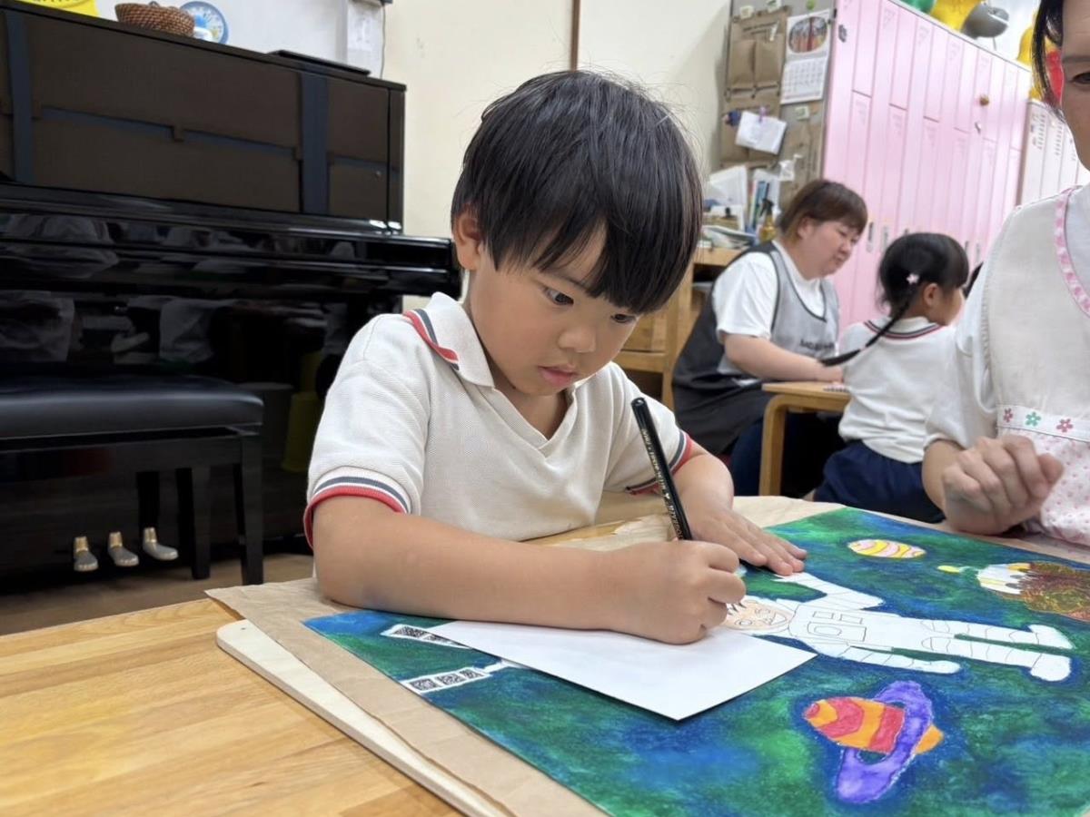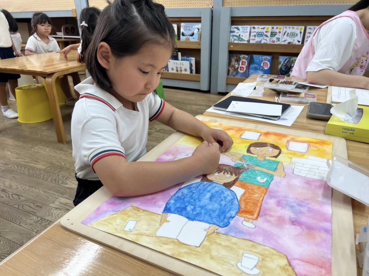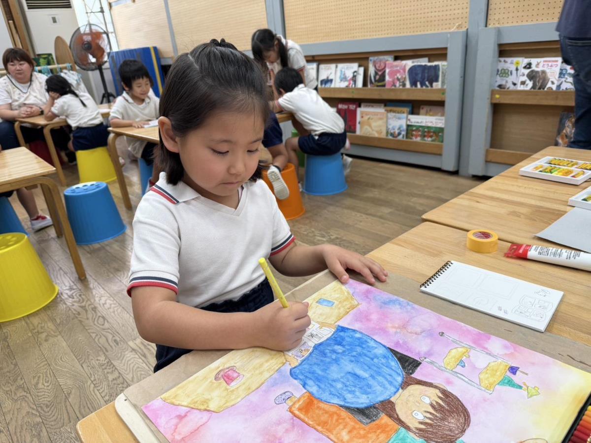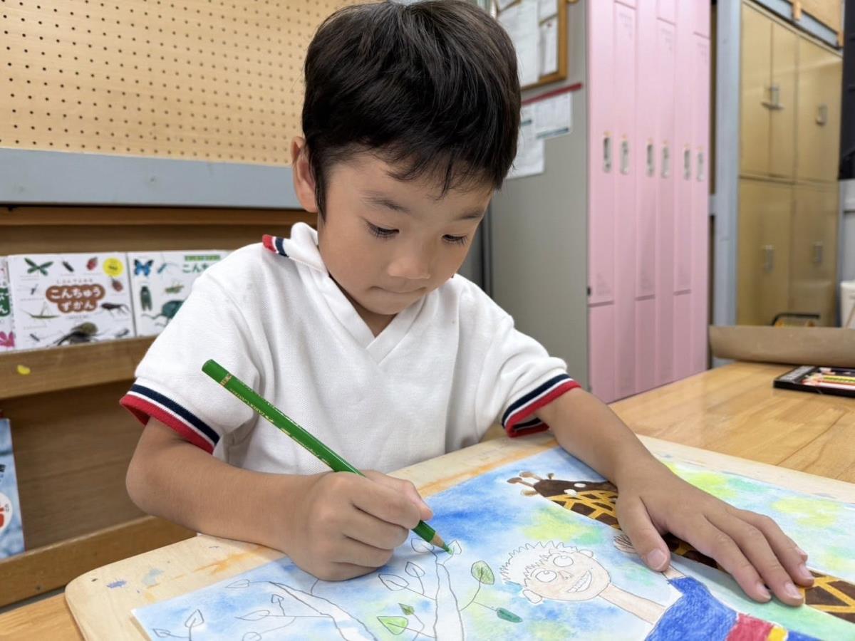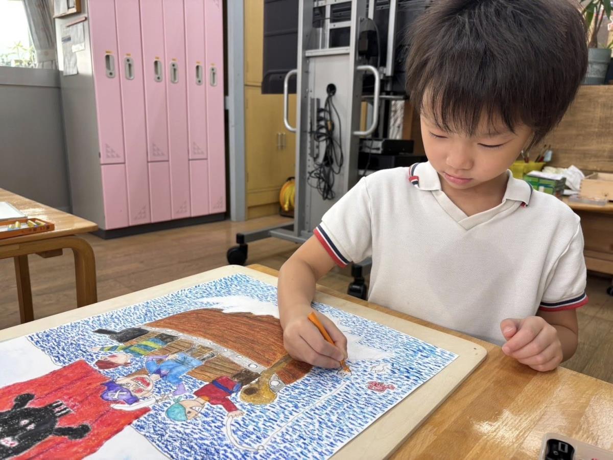 午前中は英語がありました。ビンゴゲームに挑戦!ルールも覚えて、楽しく取り組んでいます。午後はひらがなワークをやったあと、水の中の生き物をクレヨンで描きました。カニの家族を描いたり、カメを描いたり、、、たくさんの生き物の絵を上手に描き進めていました。