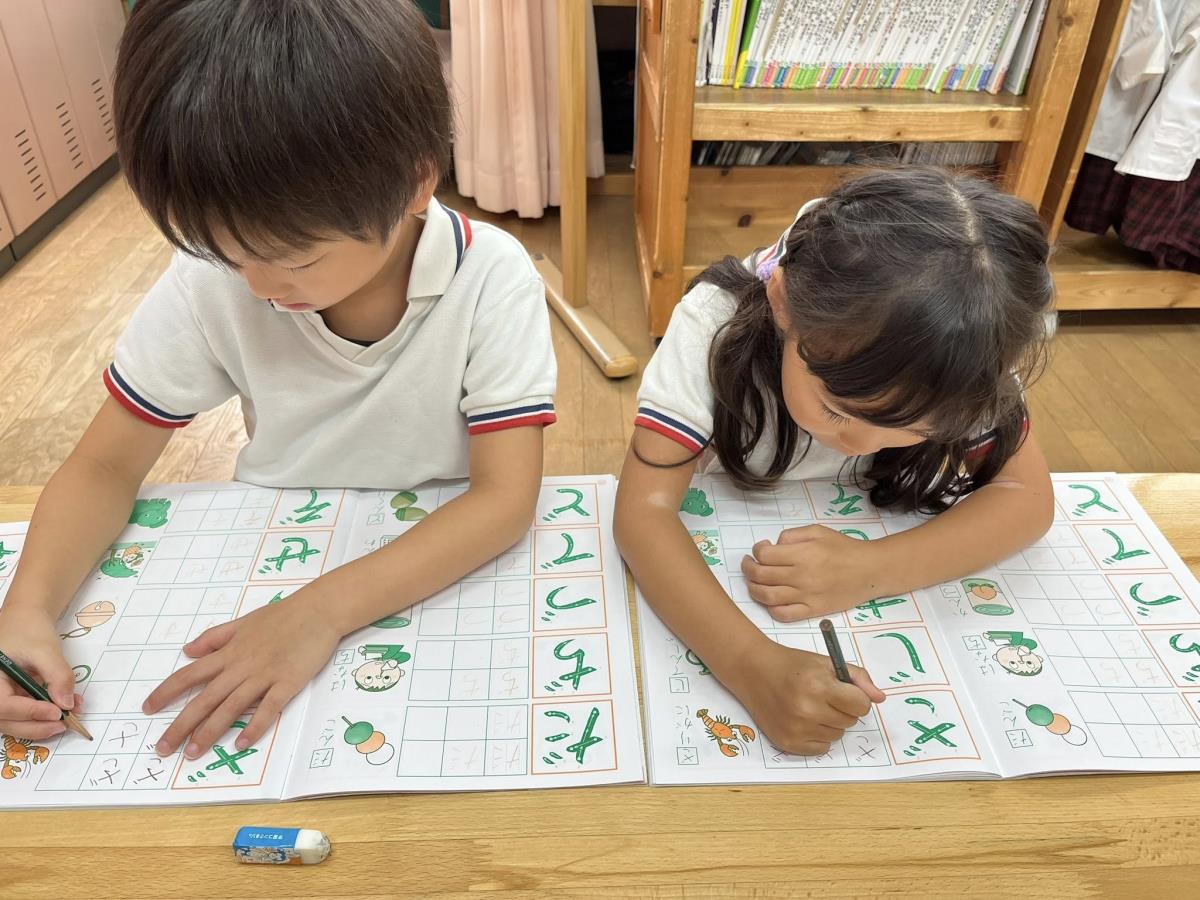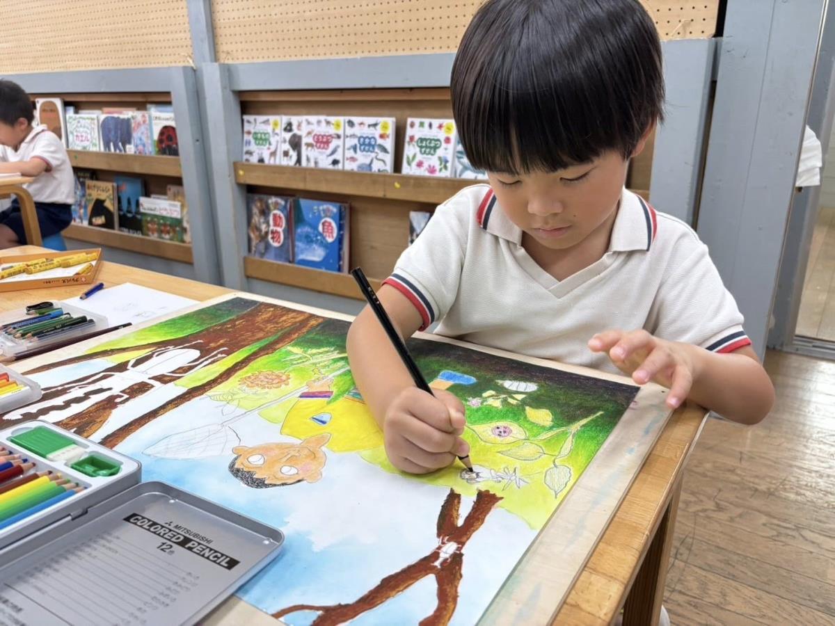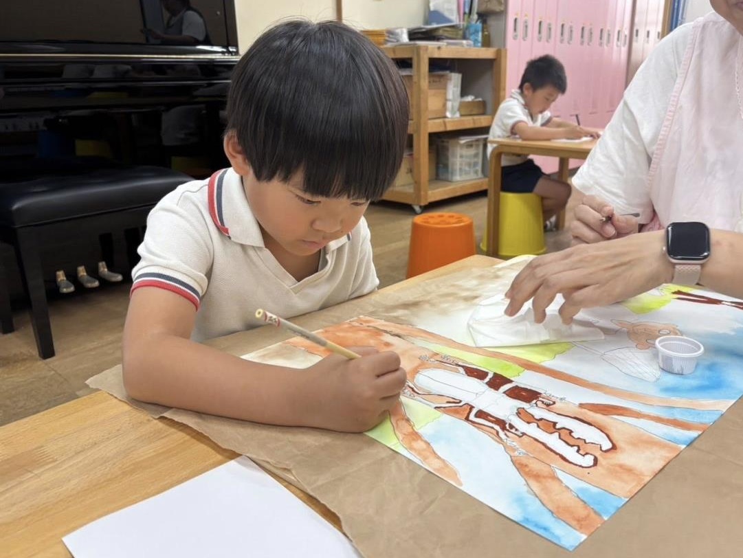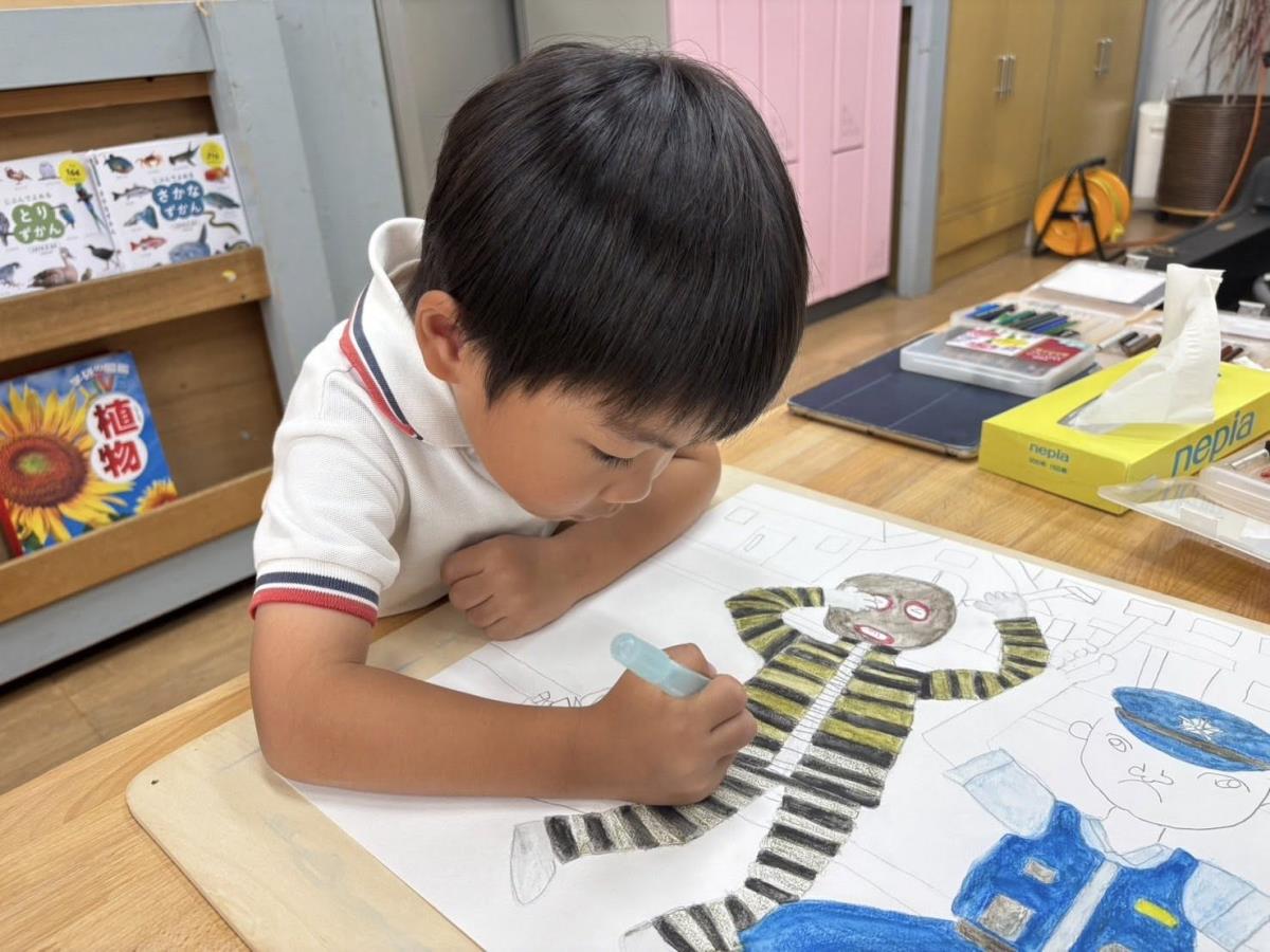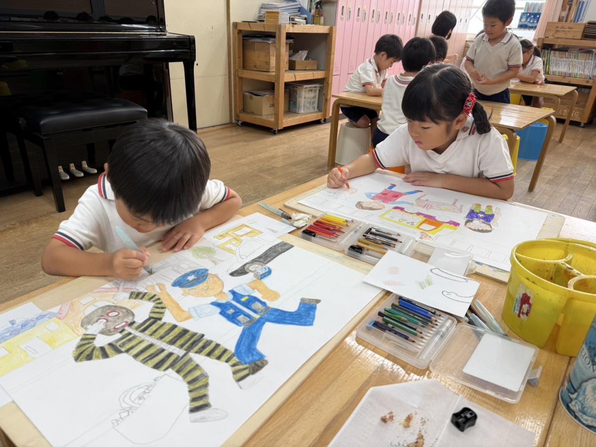 午前中は英語がありました。ビンゴゲームに挑戦!ルールも覚えて、楽しく取り組んでいます。午後はひらがなワークをやったあと、水の中の生き物をクレヨンで描きました。カニの家族を描いたり、カメを描いたり、、、たくさんの生き物の絵を上手に描き進めていました。