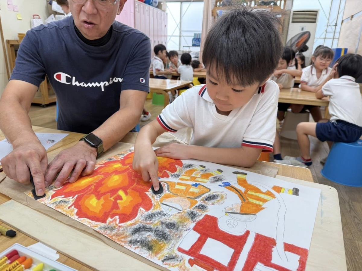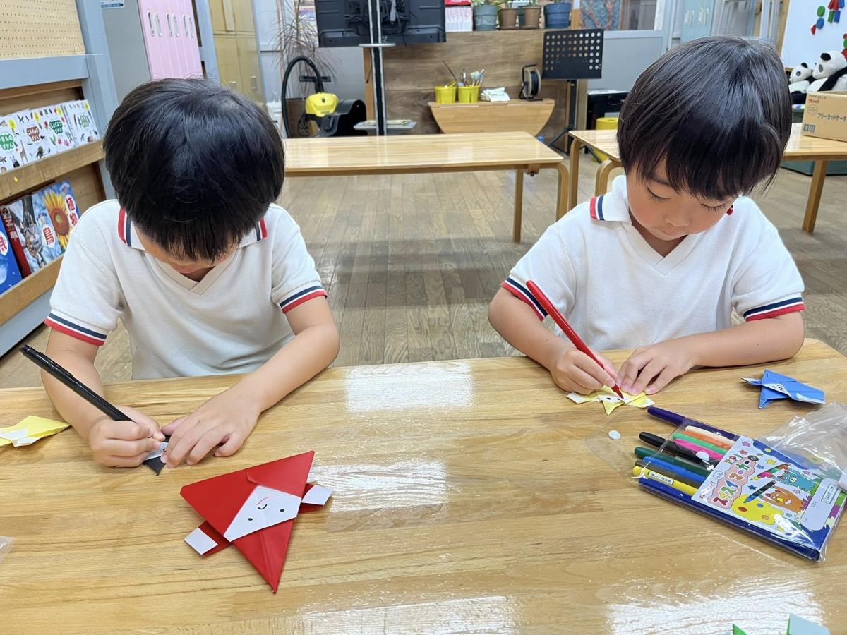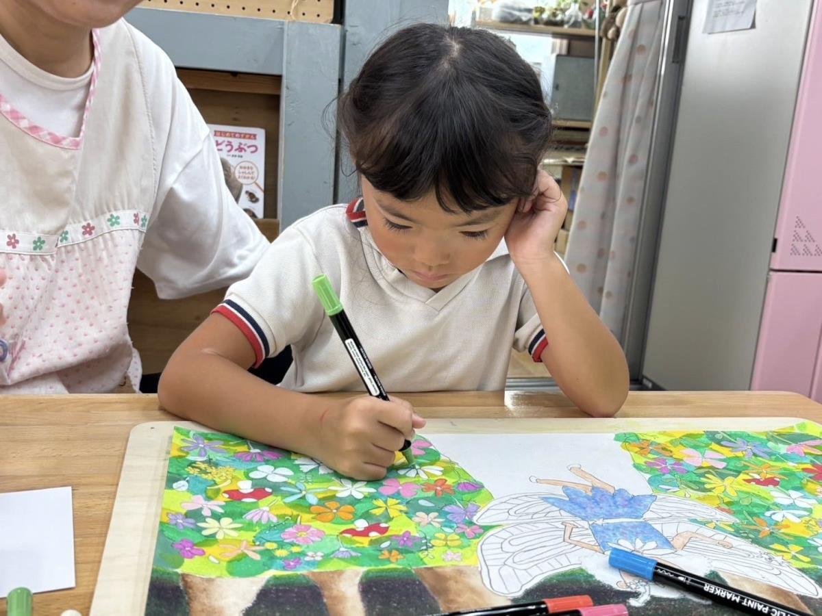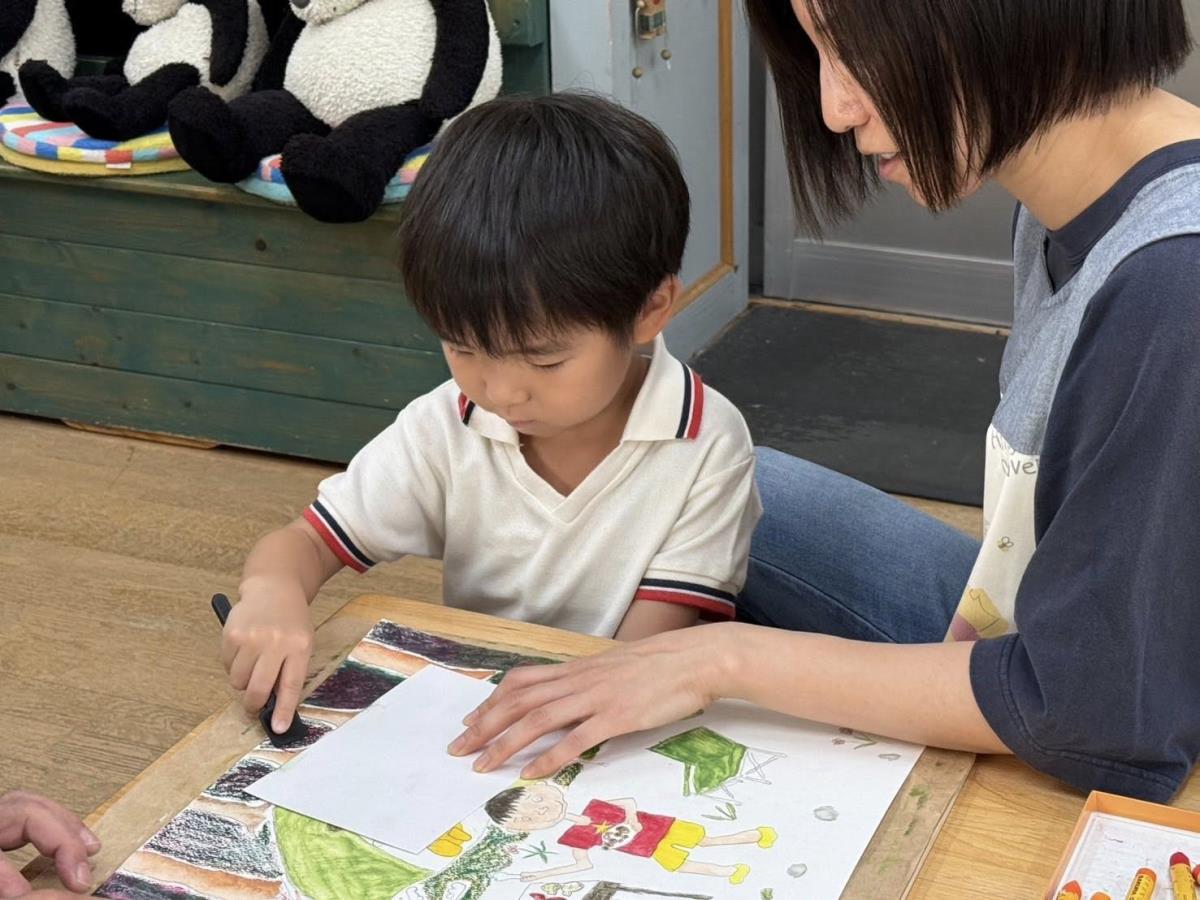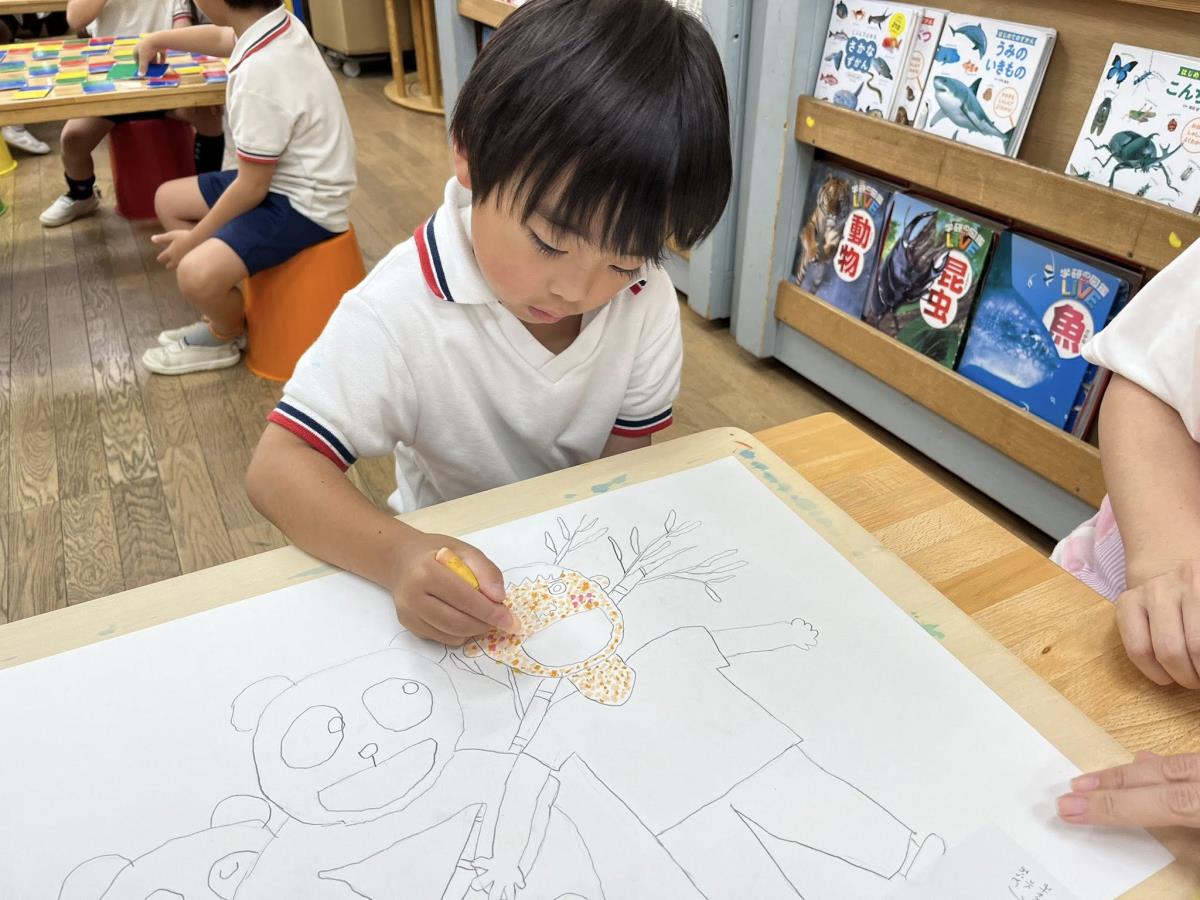 午前中は英語がありました。ビンゴゲームに挑戦!ルールも覚えて、楽しく取り組んでいます。午後はひらがなワークをやったあと、水の中の生き物をクレヨンで描きました。カニの家族を描いたり、カメを描いたり、、、たくさんの生き物の絵を上手に描き進めていました。