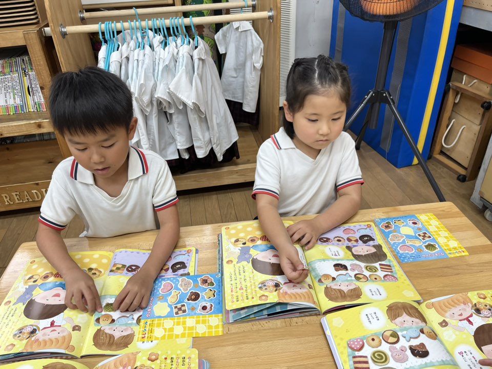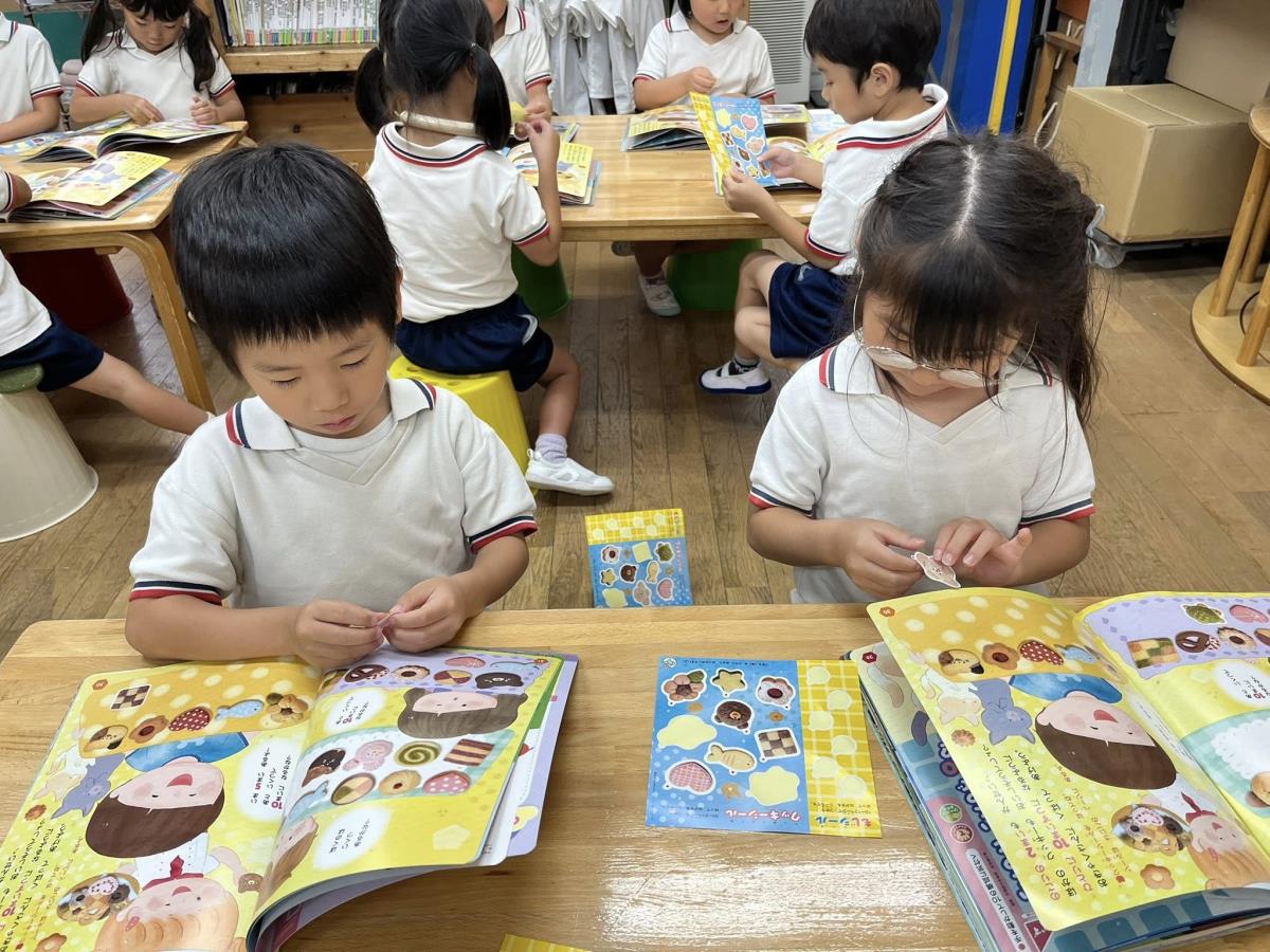 | 午前中に月刊誌を読みました。シール貼りのページでは五つの花束を作ったり、お話のページはみんなで絵本を声に出して読んだりしながら進めていきました。お話しが好きなお友だちが多いので、毎月の月刊誌を楽しみにしてくれています。午後は園庭で遊びました☆ |
