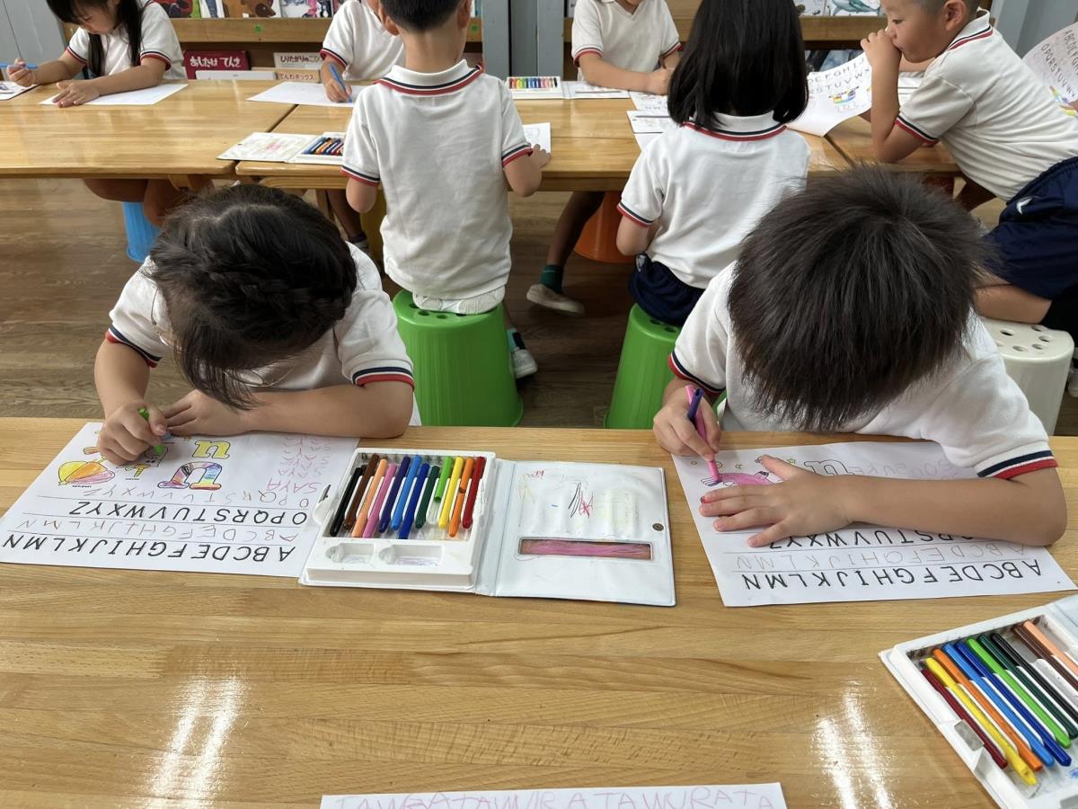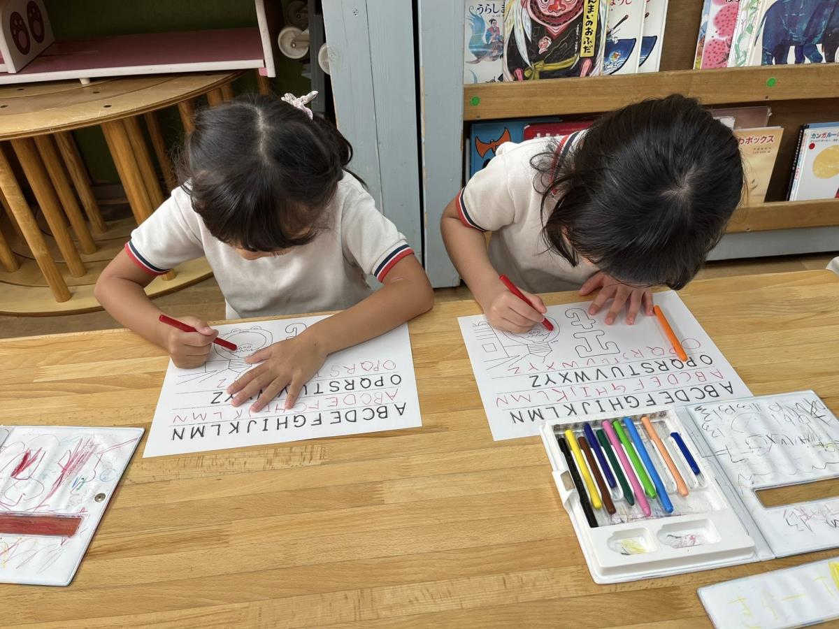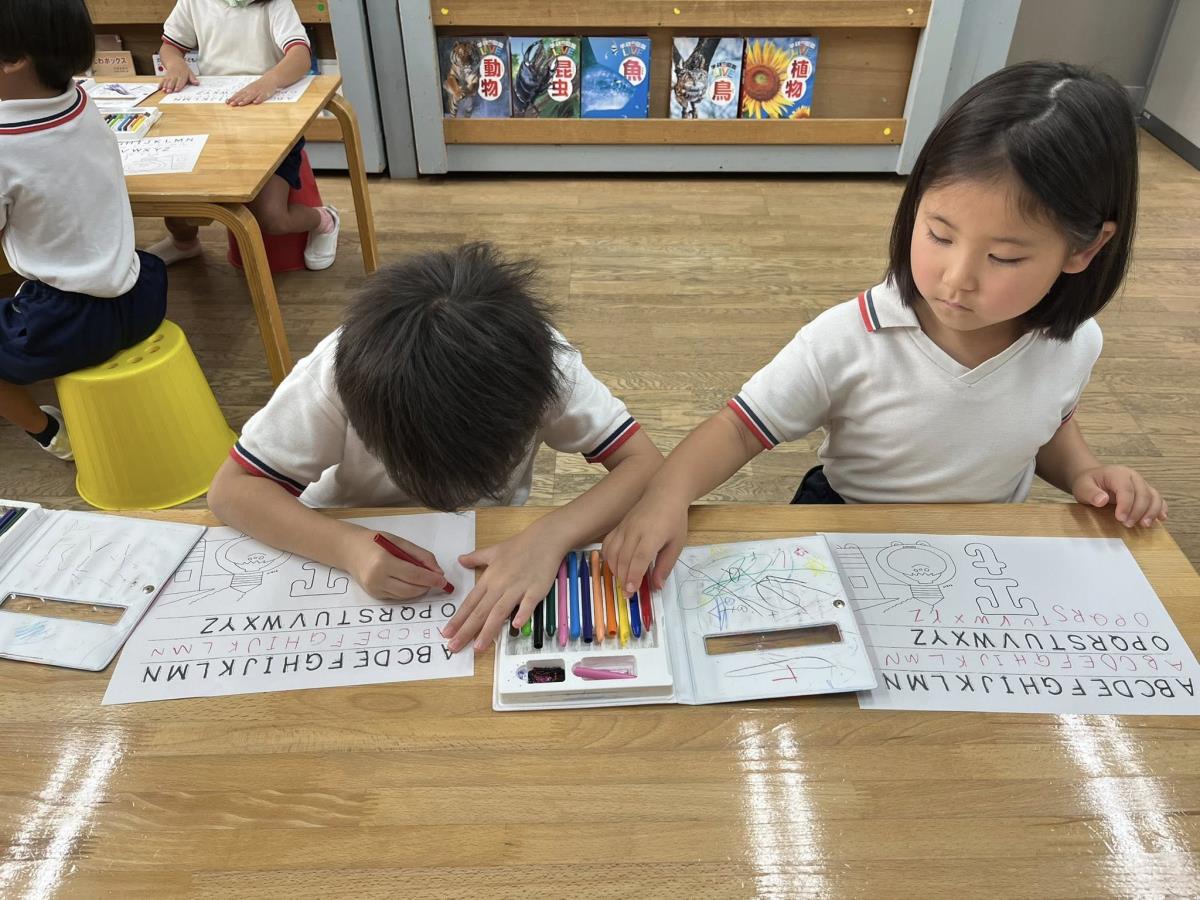 英語がありました。体の部位の名前を音楽に合わせて歌いました。クーピーを使って、アルファベットを書いたり、塗り絵をして楽しみました。午後は園庭で遊びました。