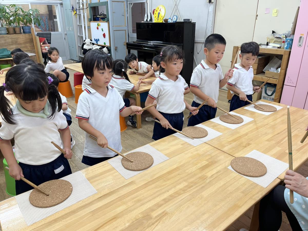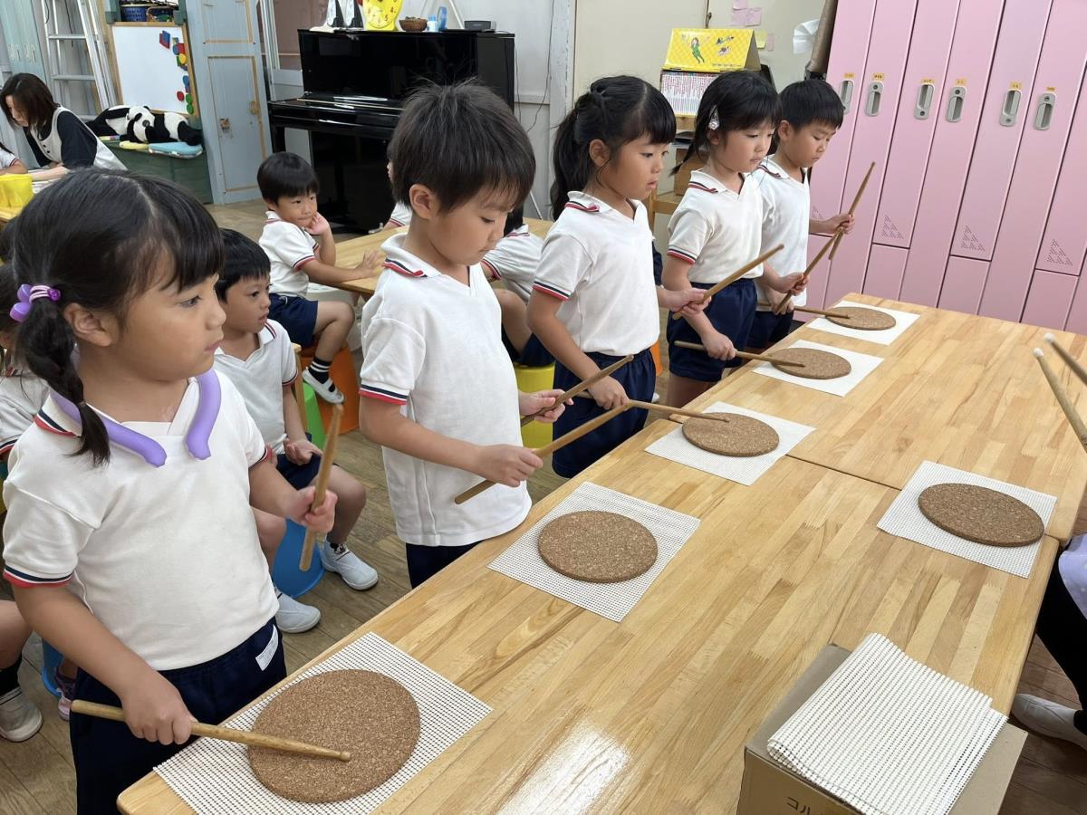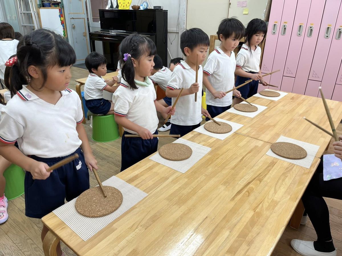 午前中は、太鼓の練習をしました。初めての練習。バチの持ち方、太鼓をやる時の姿勢など教えてもらいながら行いました。「うさぴょん」と口に出しながらぴょんっと跳ねるのをイメージしながら取り組むことができました。午後は室内で遊びました。