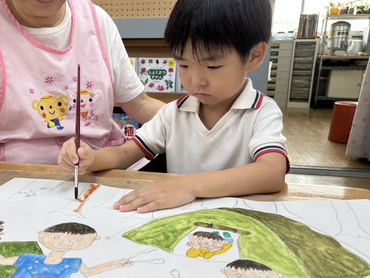 今日はお誕生会がありました。保育士劇の「さんまいのおふだ」を楽しみながら見ていました。午後はプールに入り、その後絵に色付けを行いました。