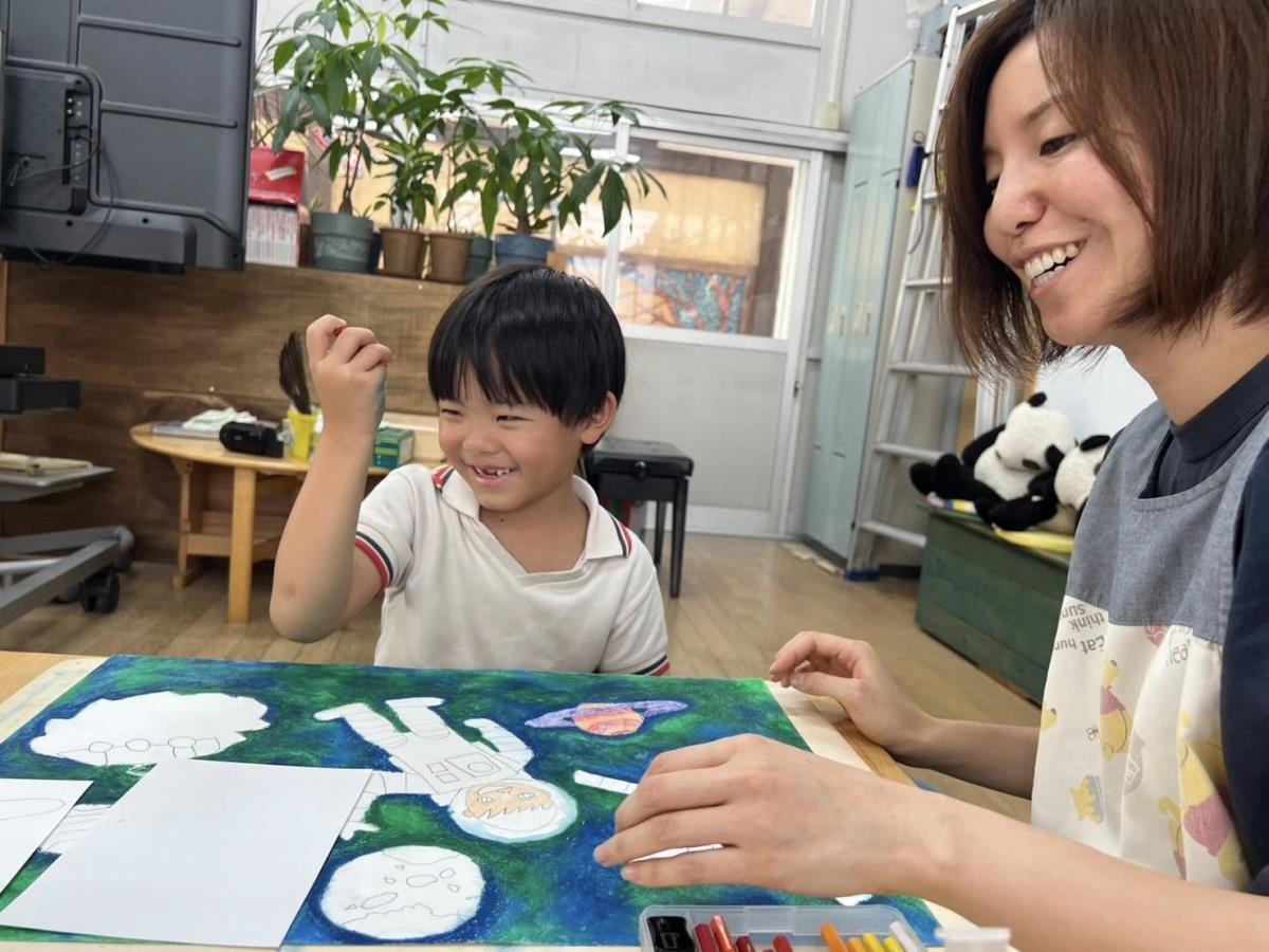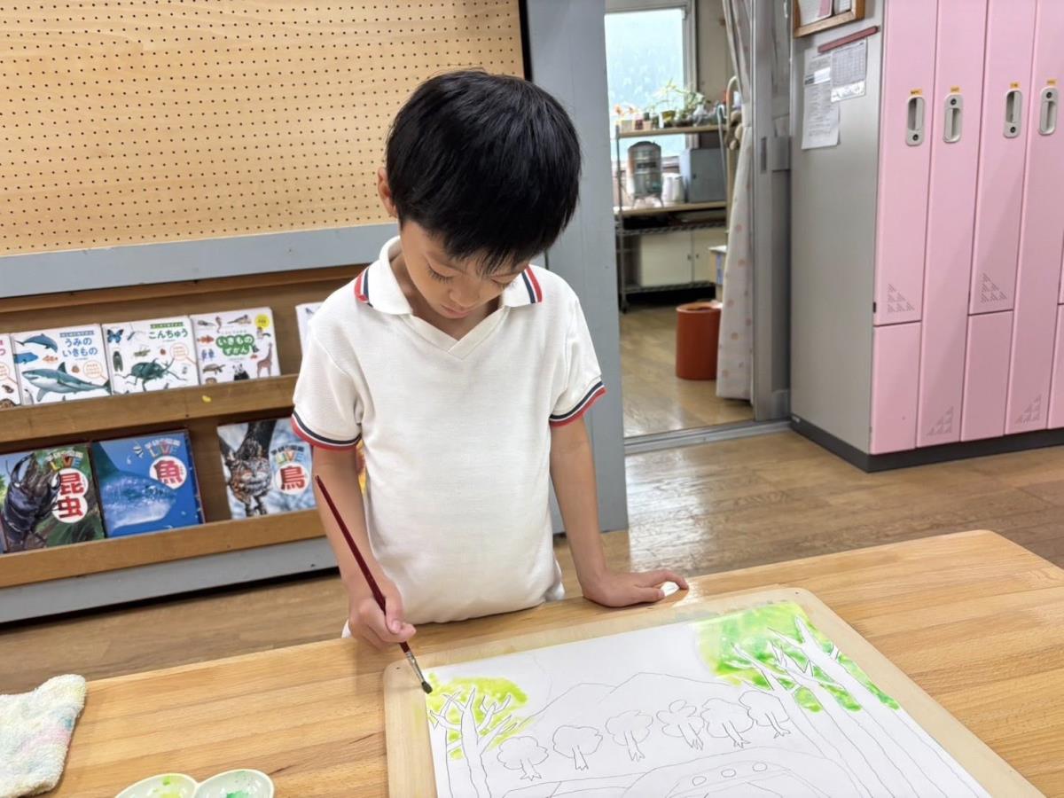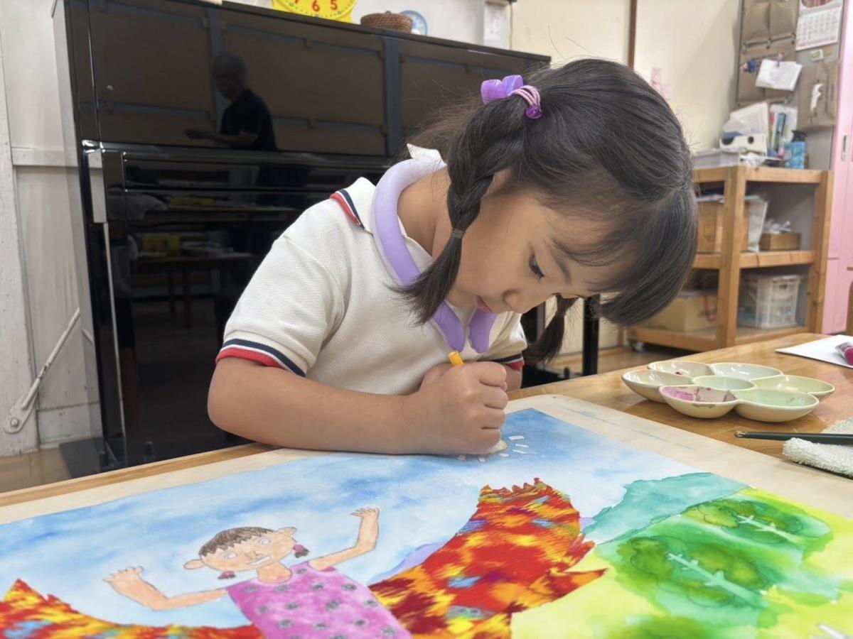 午前中はリトミックがありました。その前にまなびきっずをしました。ひらがなの書き順に気をつけながら進めていきました。午後は制作をしたり、お絵描き、夢の絵に色付けを行っていました。自分の描いた絵に絵の具や水彩色鉛筆、様々な技法を使って取り組んでいます☆