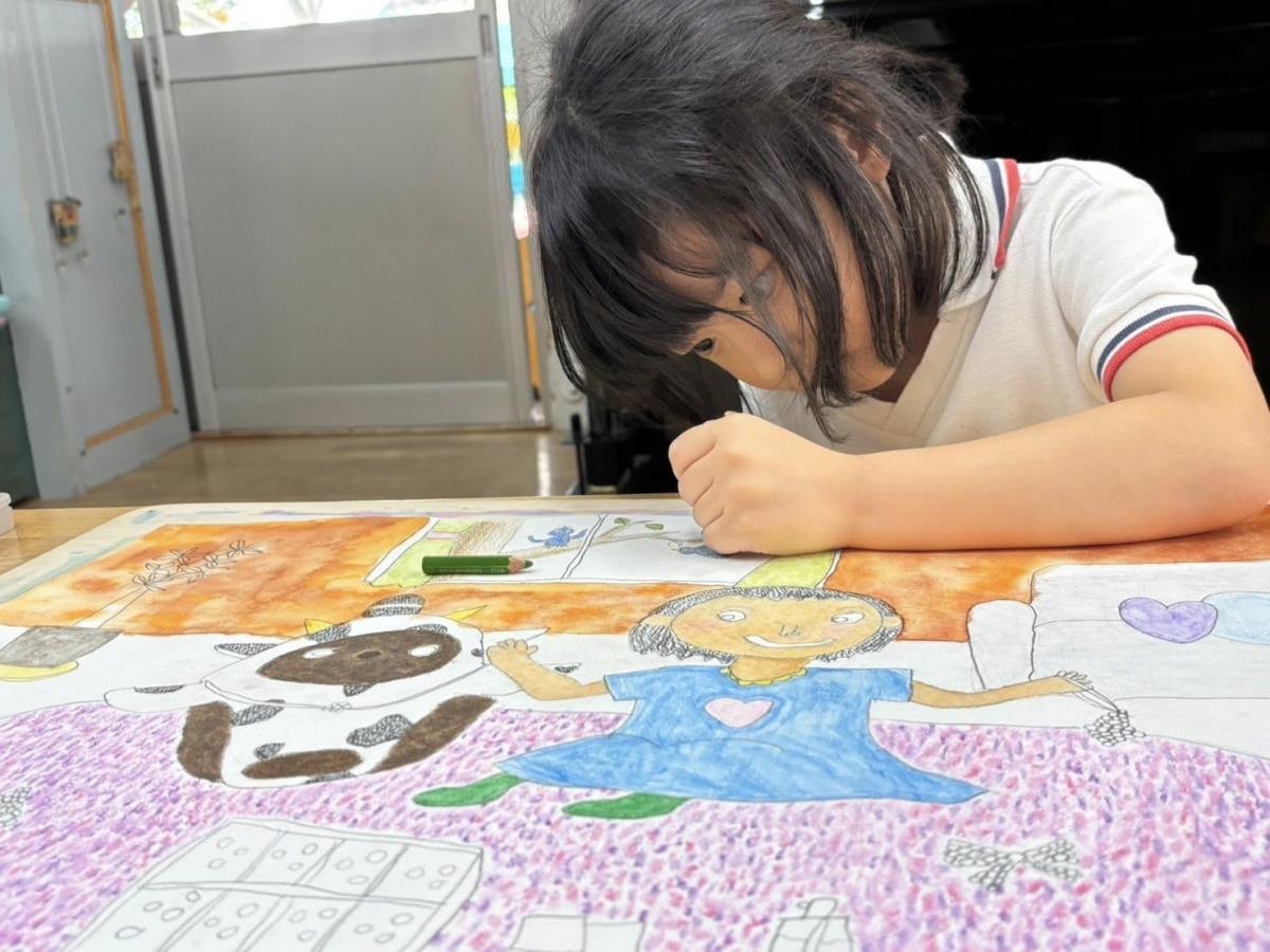 午前中は夢の絵に色付けを行いました。服の色を考えたり、模様を考えたり、、、楽しみながらとりくんでいます。待っている間は、パズルをしたり絵本を見たりして過ごしました。午後はお絵描きをして過ごしました。
