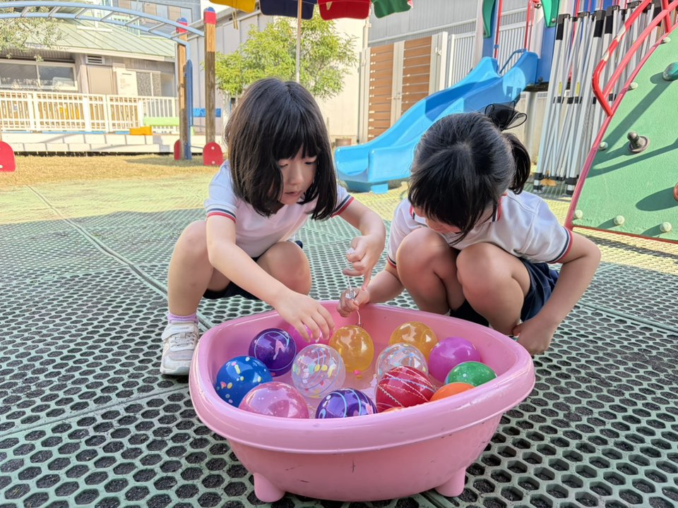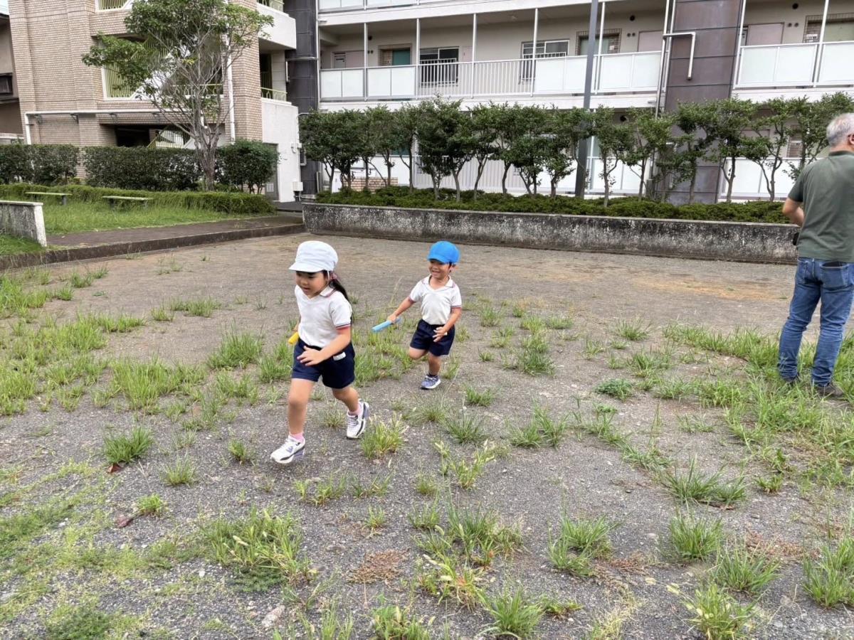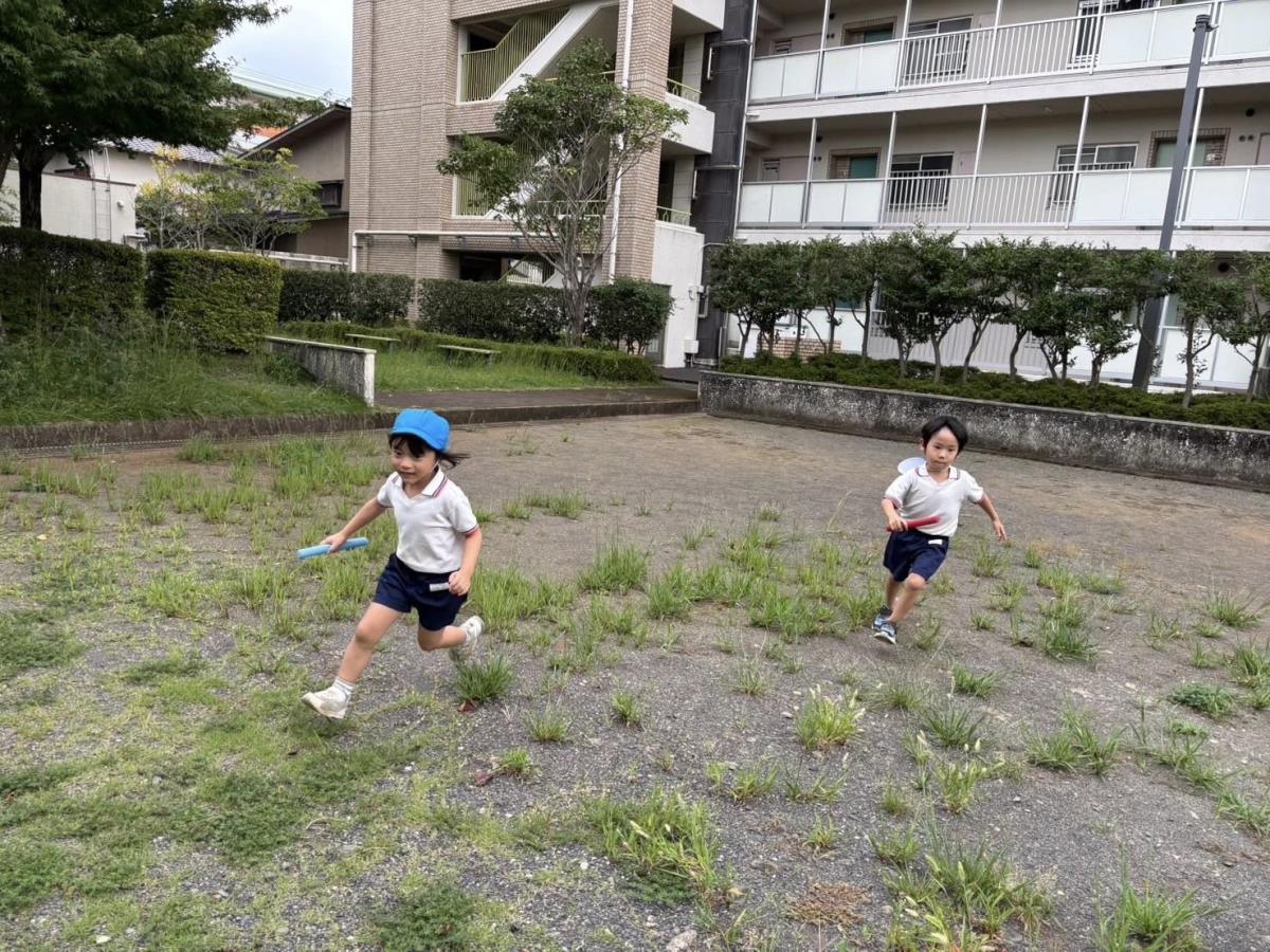 午前はお部屋で遊んでからまなびキッズを進めました。午後は園庭で遊びました。デッキの上で泳ぎの練習をしたり、お砂場ではいくつもの山ができたりと思いきり楽しんで遊んでいました。
